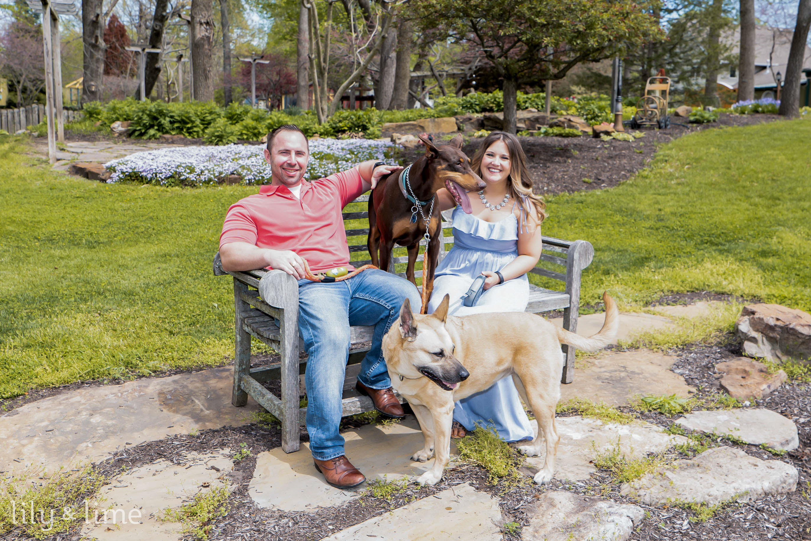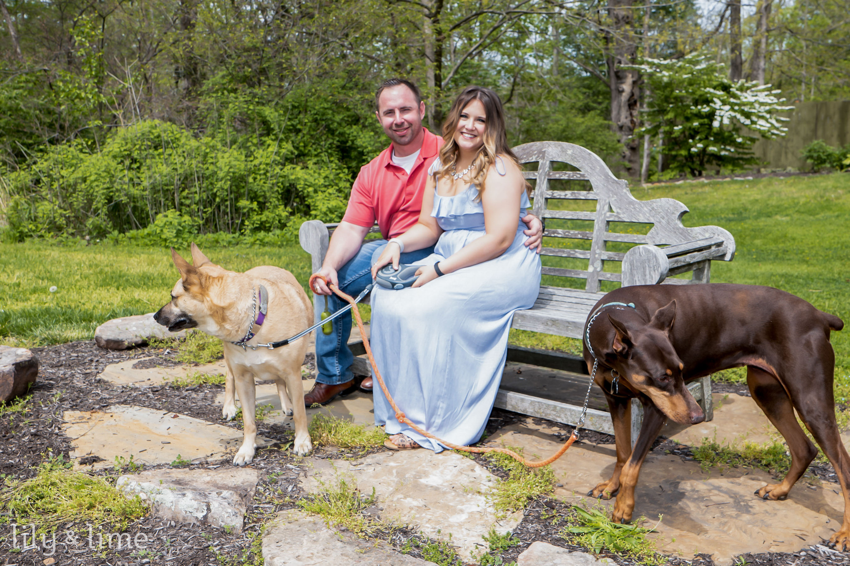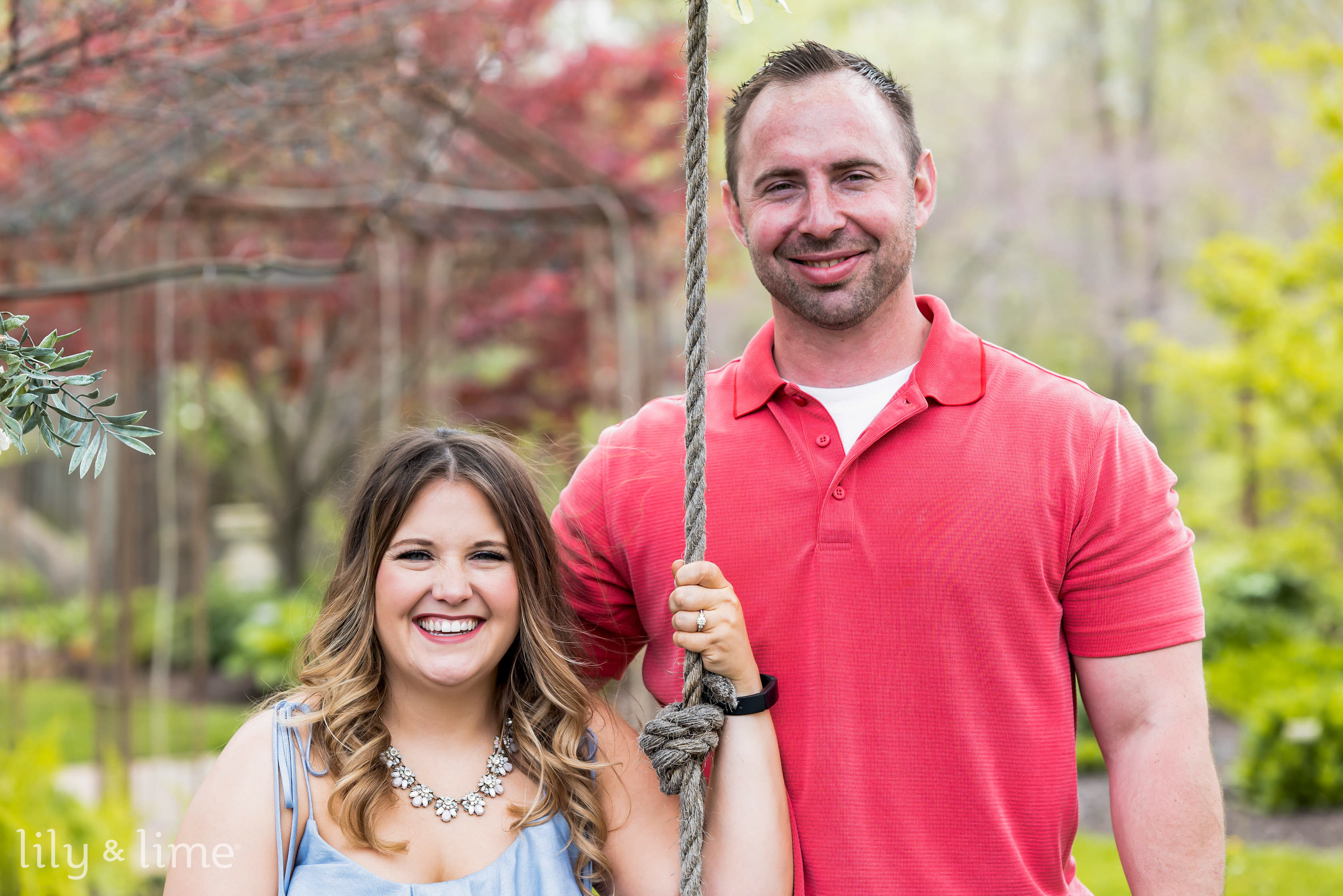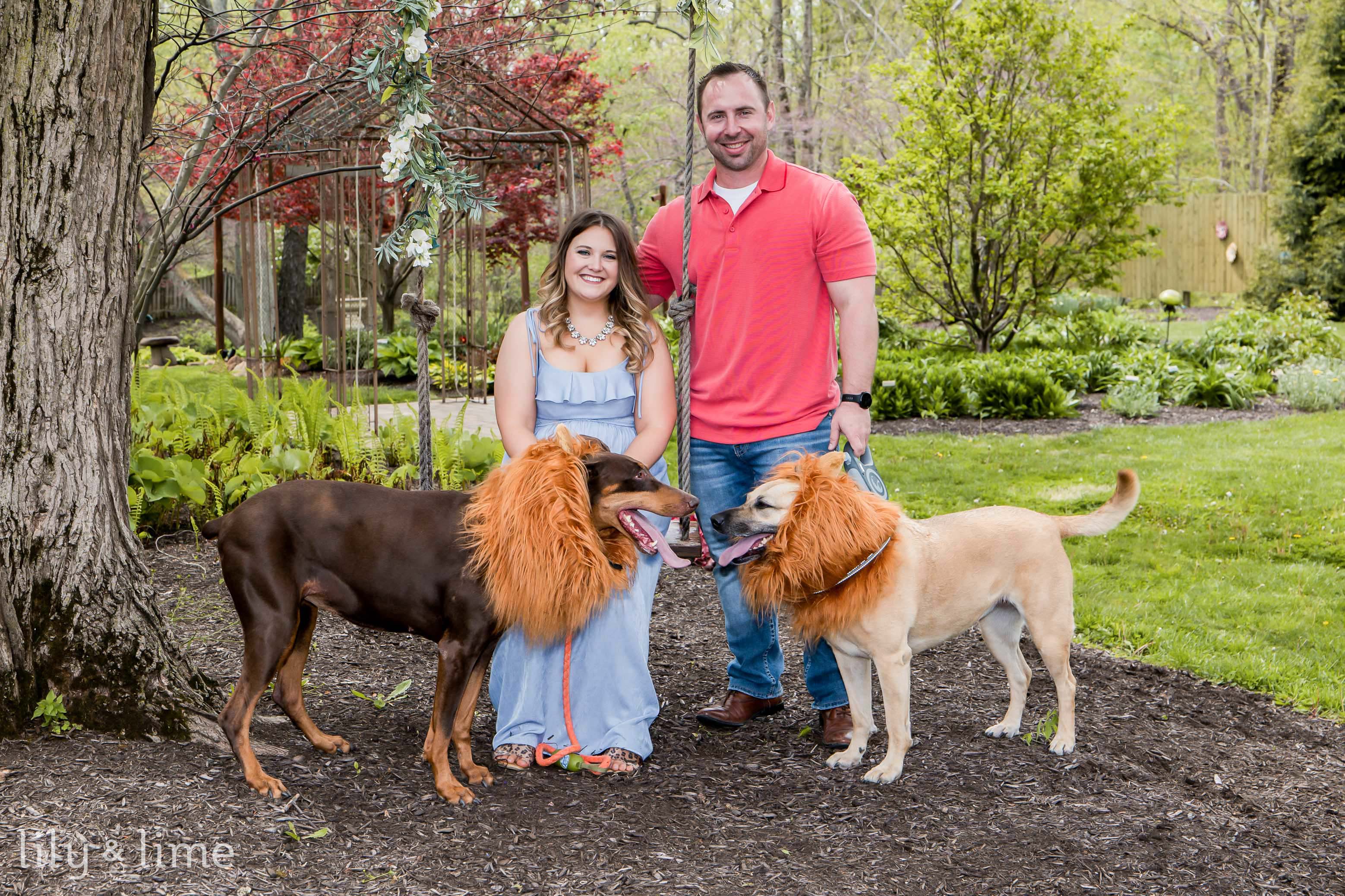 While the duo looked phenomenal, the setting was equally gorgeous, if not more! The abundant greenery, the matured trees, the cool waterholes, and the verdant gardens ensured that every shot was perfect! The outdoor photo session was a great idea as the setting has a lot to offer visually. From the cool shady corners to the rolling hillocks, one can’t get tired of this location, and our engagement photographers, teamed with the lovely couple, sure made the most out of the setting. The couple posed in a handful of different backdrops within the location, each more beautiful than the other. Abbey and John did a mix of both couple portraits and some pictures with their pets, and we loved seeing their beloved dogs being included in the photo shoot. It allows one to take a peek at their lives and it's truly fascinating. The couple posed by the pond, and the verdant grass fields, and our Indianapolis engagement photographers took one stunning shot after another. We especially love the pictures with the two dogs, as it made the photos unique and personal, which we love to see. The couple chose some fun costumes for the dogs so that they can be captured in their playful and quirky personality. While the pictures with the dogs stole our hearts, the couple did manage to get some couple shots alone which were equally heartwarming! The photographs of the swing and the close-up of the engagement rings were a sweet touch and were thought fully captured. We also loved how Abbey sat on the swing and John stood by her. Both smiling and looking radiant with love. Those shots surely made the engagement session complete.