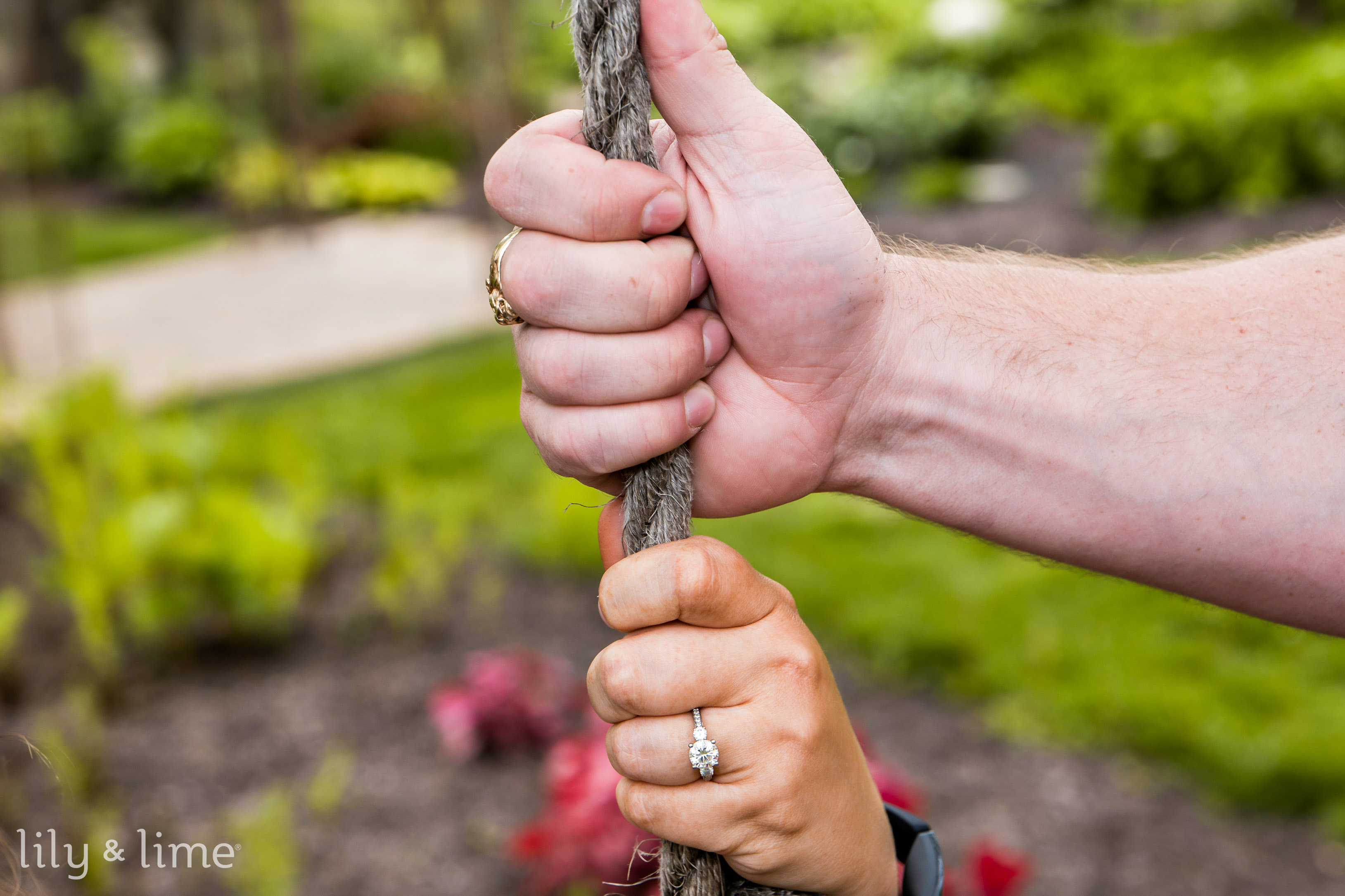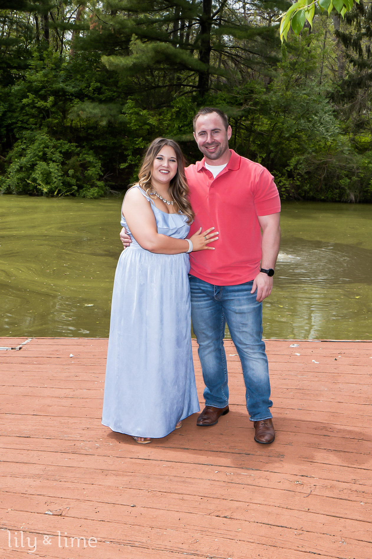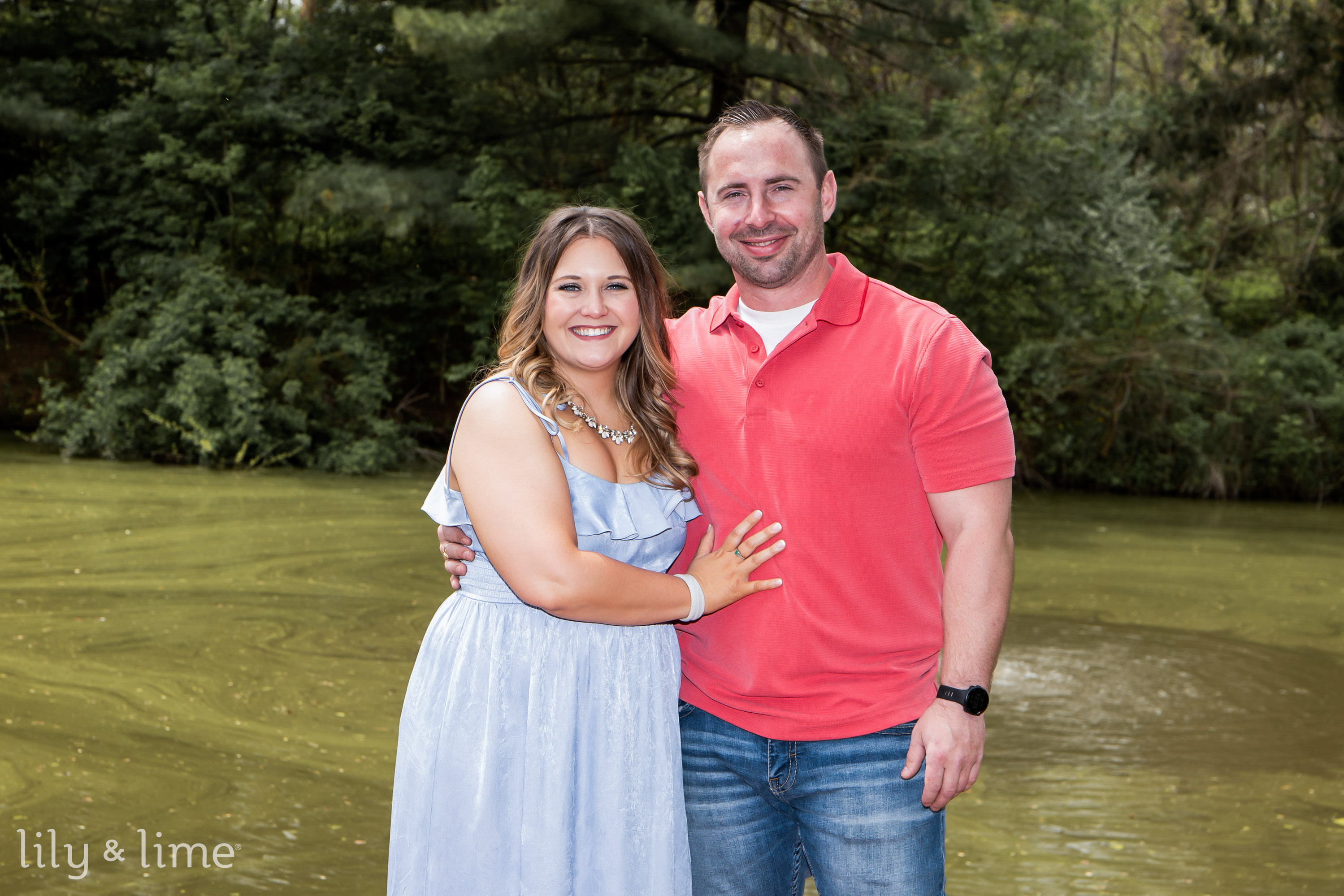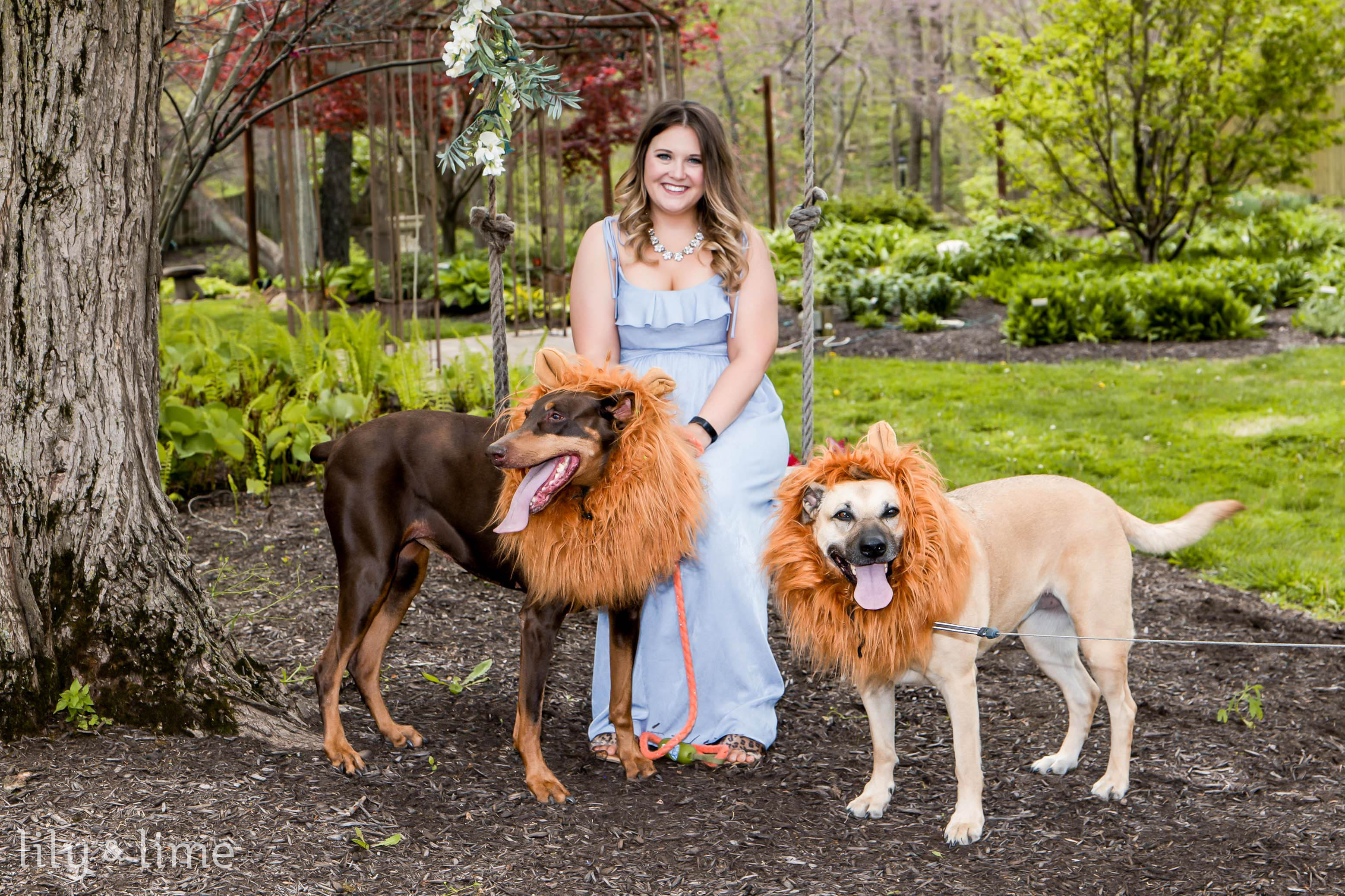 While the duo looked phenomenal, the setting was equally gorgeous, if not more! The abundant greenery, the matured trees, the cool waterholes, and the verdant gardens ensured that every shot was perfect! The outdoor photo session was a great idea as the setting has a lot to offer visually. From the cool shady corners to the rolling hillocks, one can’t get tired of this location, and our engagement photographers, teamed with the lovely couple, sure made the most out of the setting. The couple posed in a handful of different backdrops within the location, each more beautiful than the other. Abbey and John did a mix of both couple portraits and some pictures with their pets, and we loved seeing their beloved dogs being included in the photo shoot. It allows one to take a peek at their lives and it's truly fascinating. The couple posed by the pond, and the verdant grass fields, and our Indianapolis engagement photographers took one stunning shot after another. We especially love the pictures with the two dogs, as it made the photos unique and personal, which we love to see. The couple chose some fun costumes for the dogs so that they can be captured in their playful and quirky personality. While the pictures with the dogs stole our hearts, the couple did manage to get some couple shots alone which were equally heartwarming! The photographs of the swing and the close-up of the engagement rings were a sweet touch and were thought fully captured. We also loved how Abbey sat on the swing and John stood by her. Both smiling and looking radiant with love. Those shots surely made the engagement session complete.