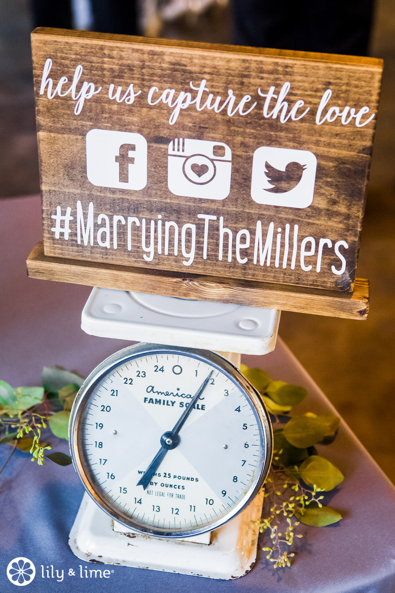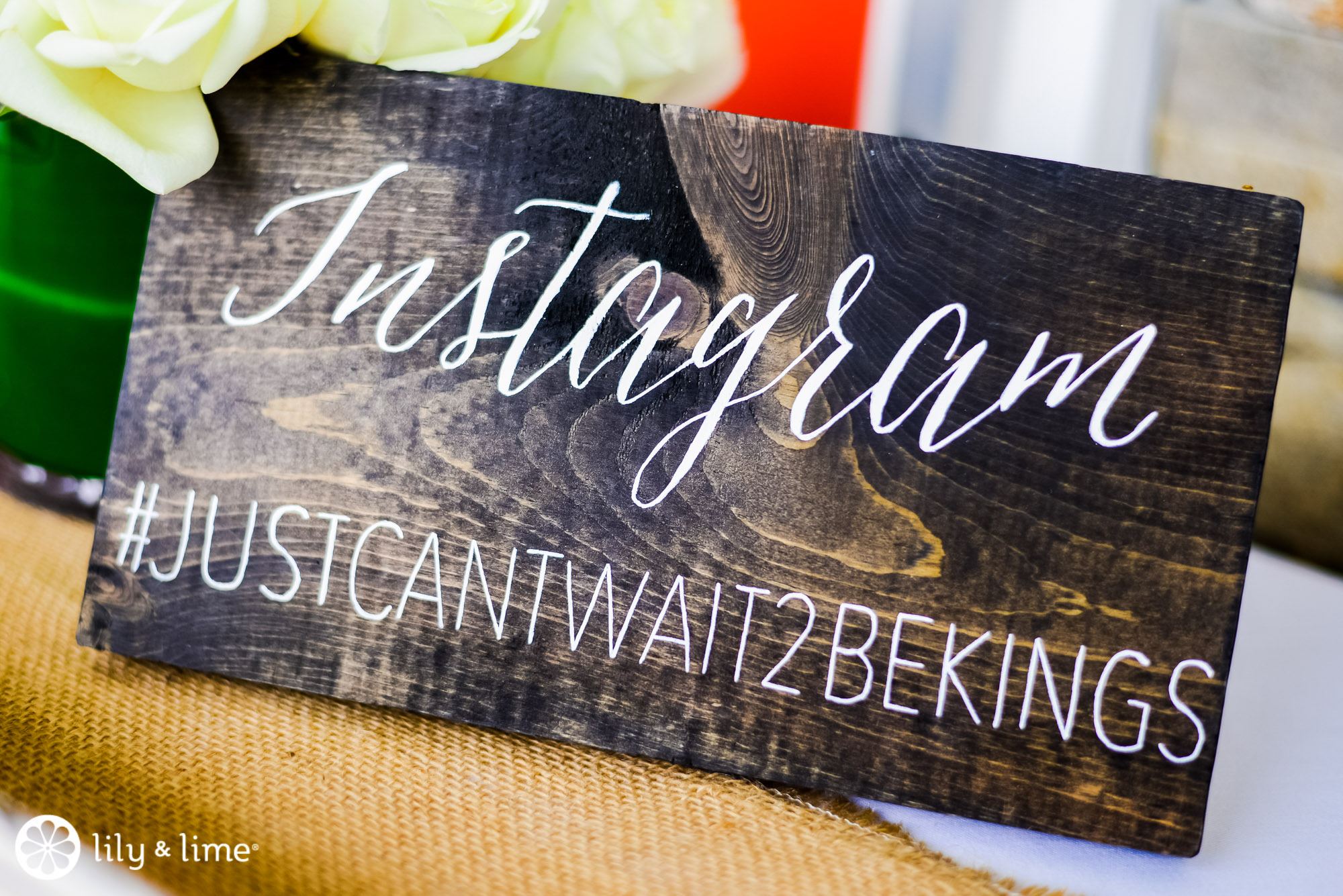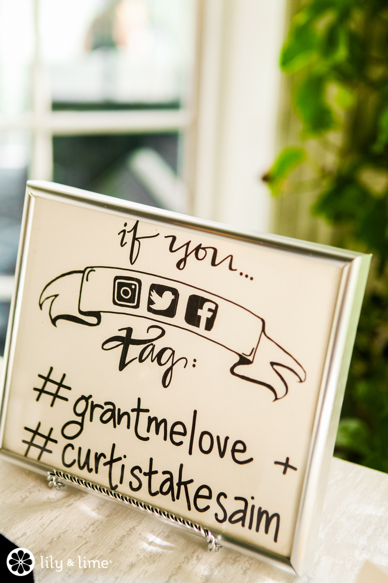 There are so many fun ways to display your wedding hashtag. Some of our favorites include displaying the hashtag in picture frames with handmade graphics, writing it on chalkboards or rustic, wood wedding signs. Think of what would compliment your wedding decor and put the signs in a place where your guests will see them. If you’re creatively challenged, you can peruse Etsy for fun, design inspiration.