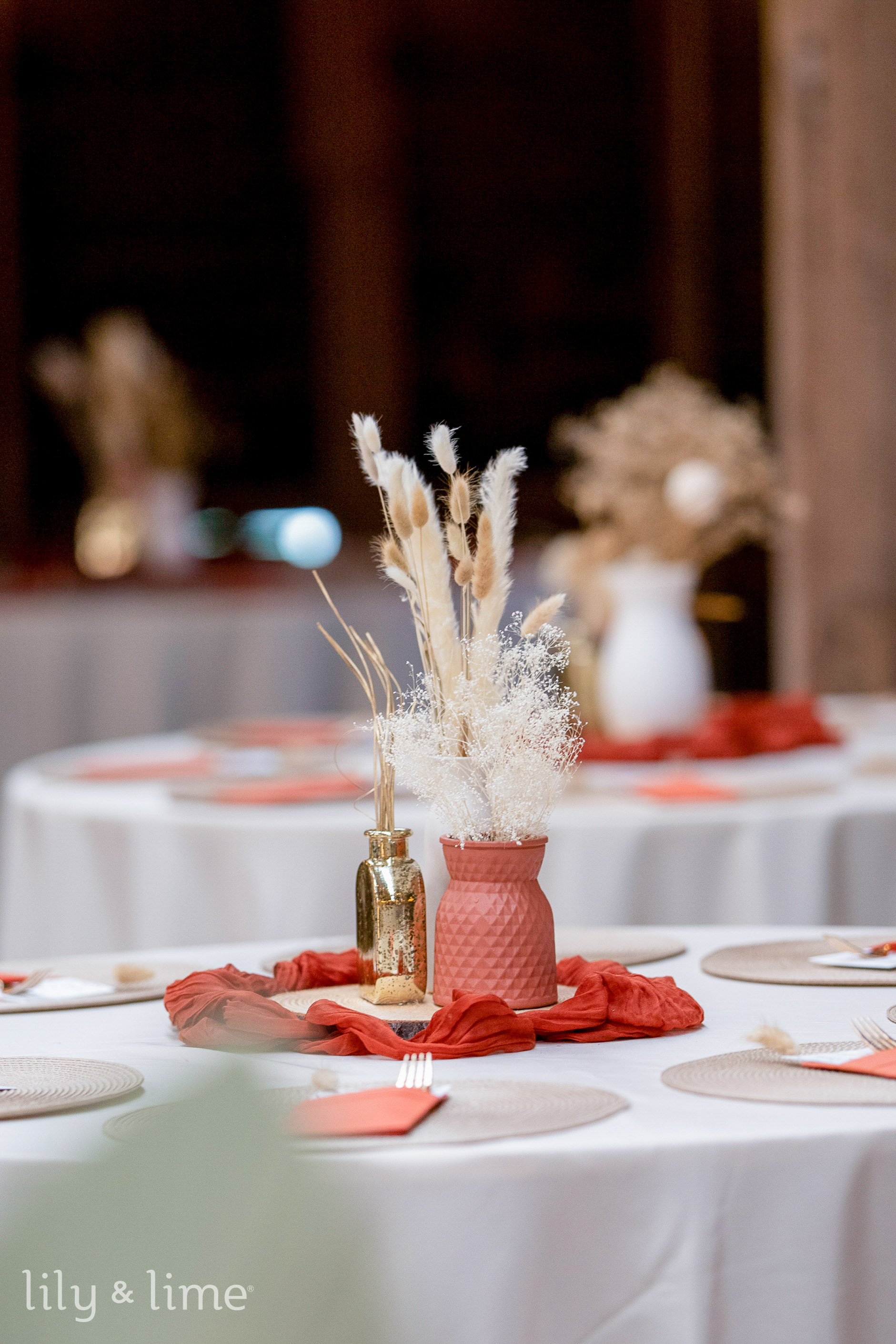 Floral Arrangements and Centerpieces: Immerse your Fall backyard wedding in the rich and enchanting hues of the season with exquisite floral arrangements and centerpieces. Capture the essence of autumn's beauty by incorporating a symphony of deep burgundy dahlias, burnt orange roses, and golden sunflowers, all interwoven with the rustic charm of dried wheat and fragrant eucalyptus leaves. These arrangements will evoke a sense of warmth and intimacy as they adorn your tables, creating an inviting atmosphere for your guests to enjoy. The bountiful textures and earthy tones of the flowers will harmonize perfectly with the natural surroundings, celebrating the magic of the season and infusing your special day with the essence of fall's romance. Incorporate elements like pinecones, berries, and dried leaves for added texture and charm.