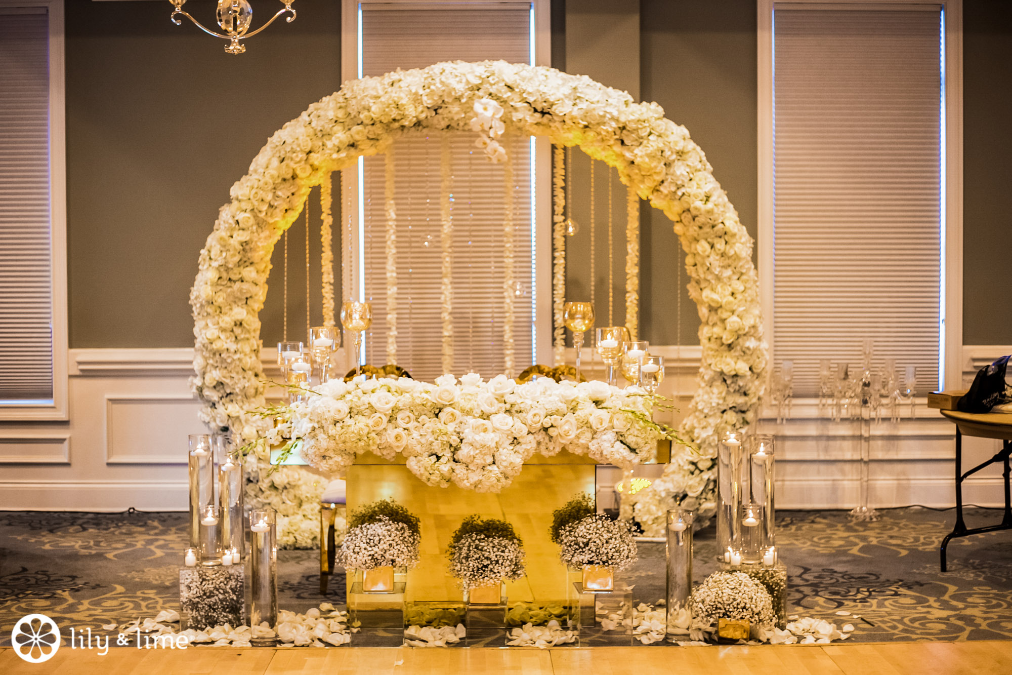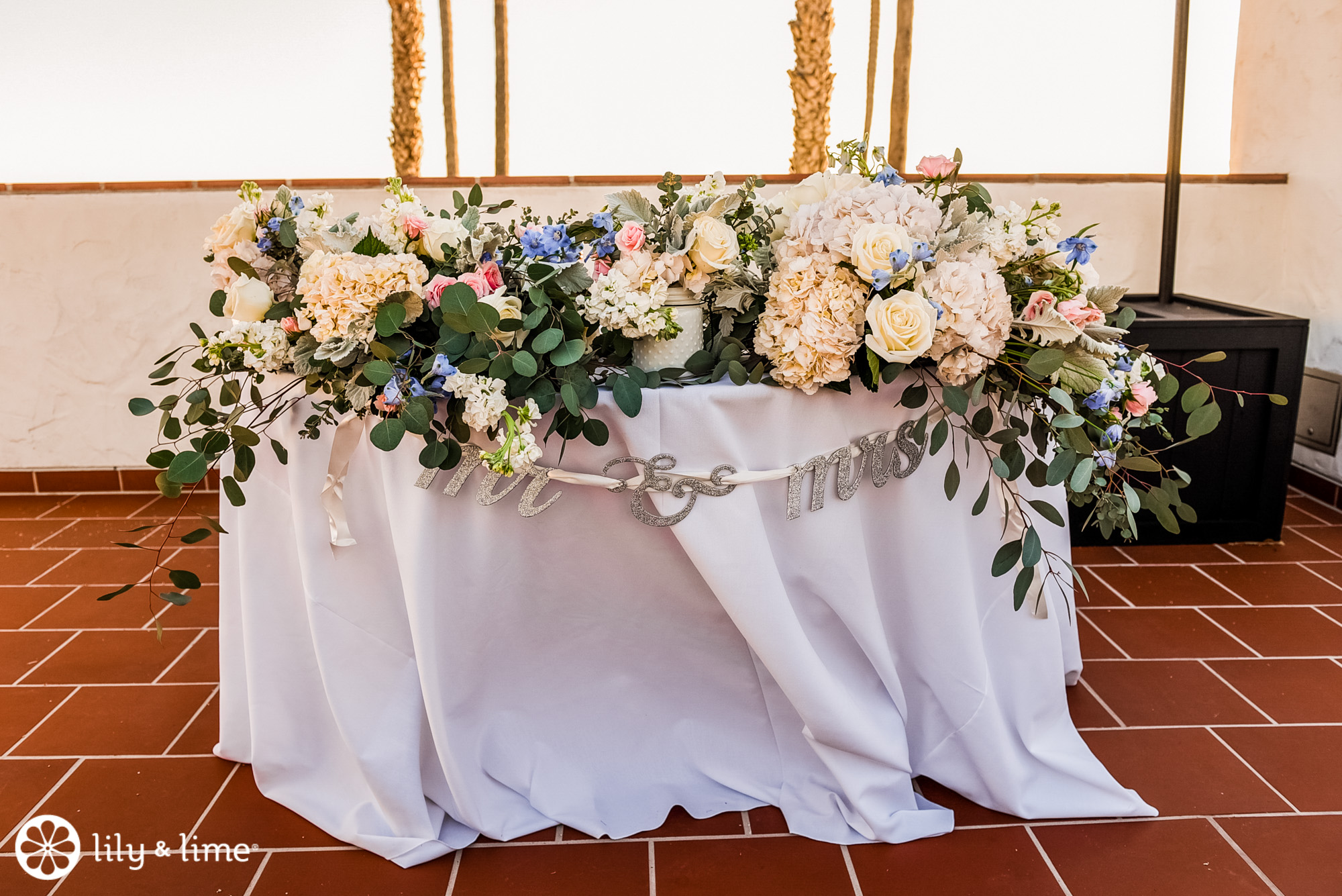 For some extra flair, you can incorporate floral backdrops or arches. And if you used one in your ceremony, it might be possible to reuse the same one as a backdrop for your sweetheart table. Drama meets practicality!