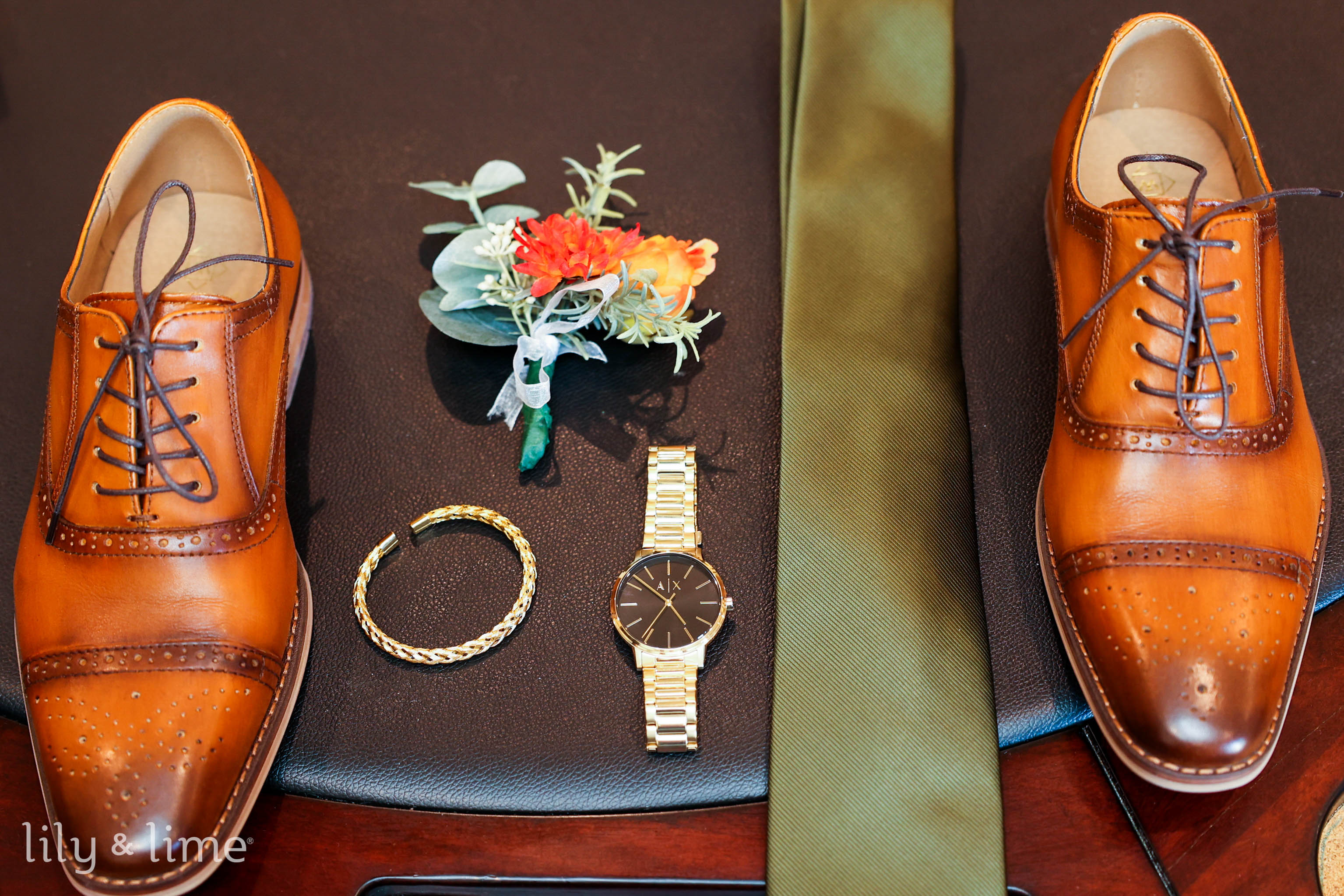 These beach wedding colors not only complement the landscape but also contribute to the overall thematic cohesion of the wedding. Rust and beige wedding suits as well as white groom suit ideas emerge as classic choices, echoing the sandy beaches and offering a neutral base that can be accentuated with bolder summer groom accessories.