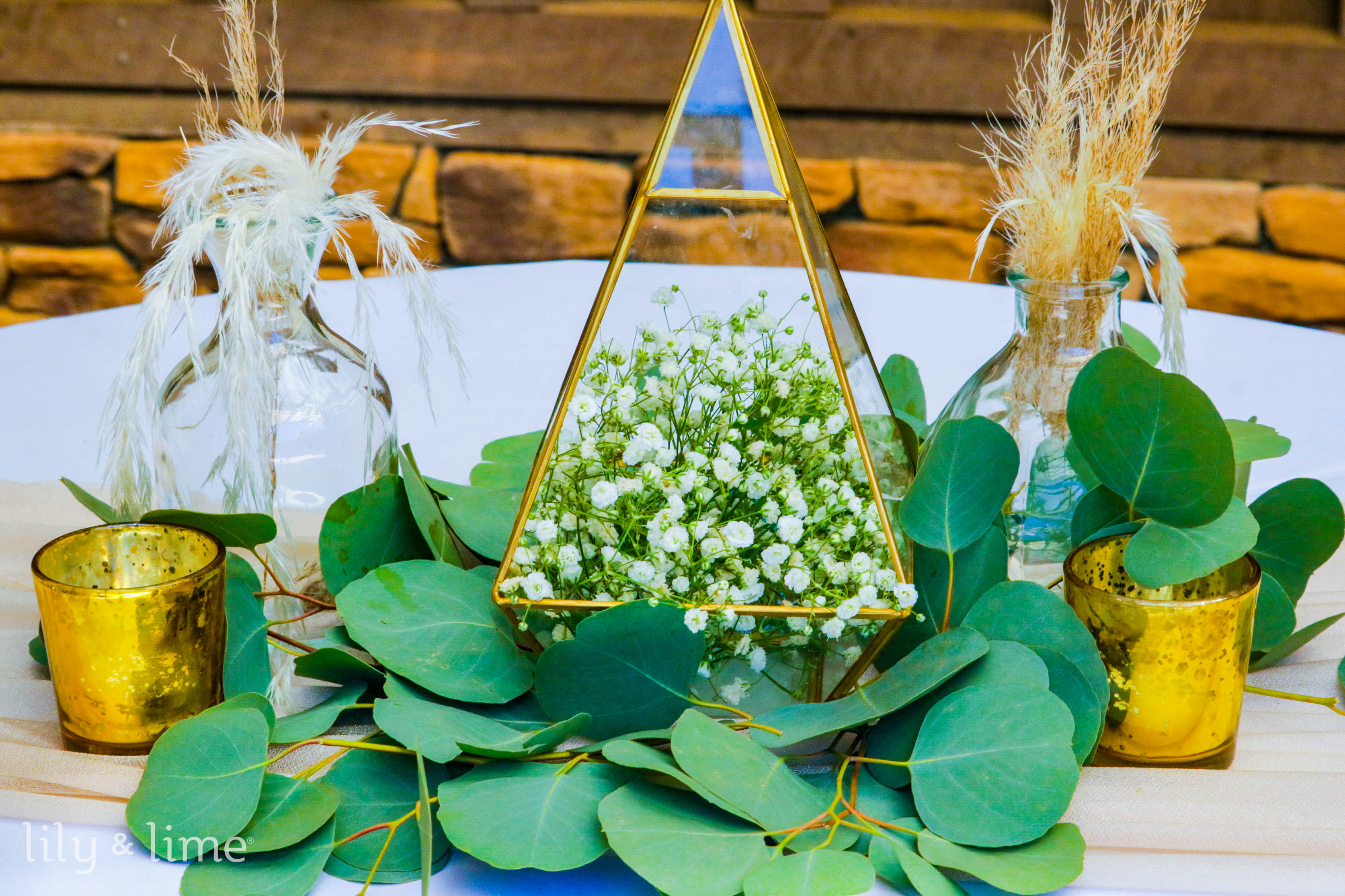 If completely greenery-filled centerpieces don’t suit your style, mixing in florals ensures a touch of softness and color.
