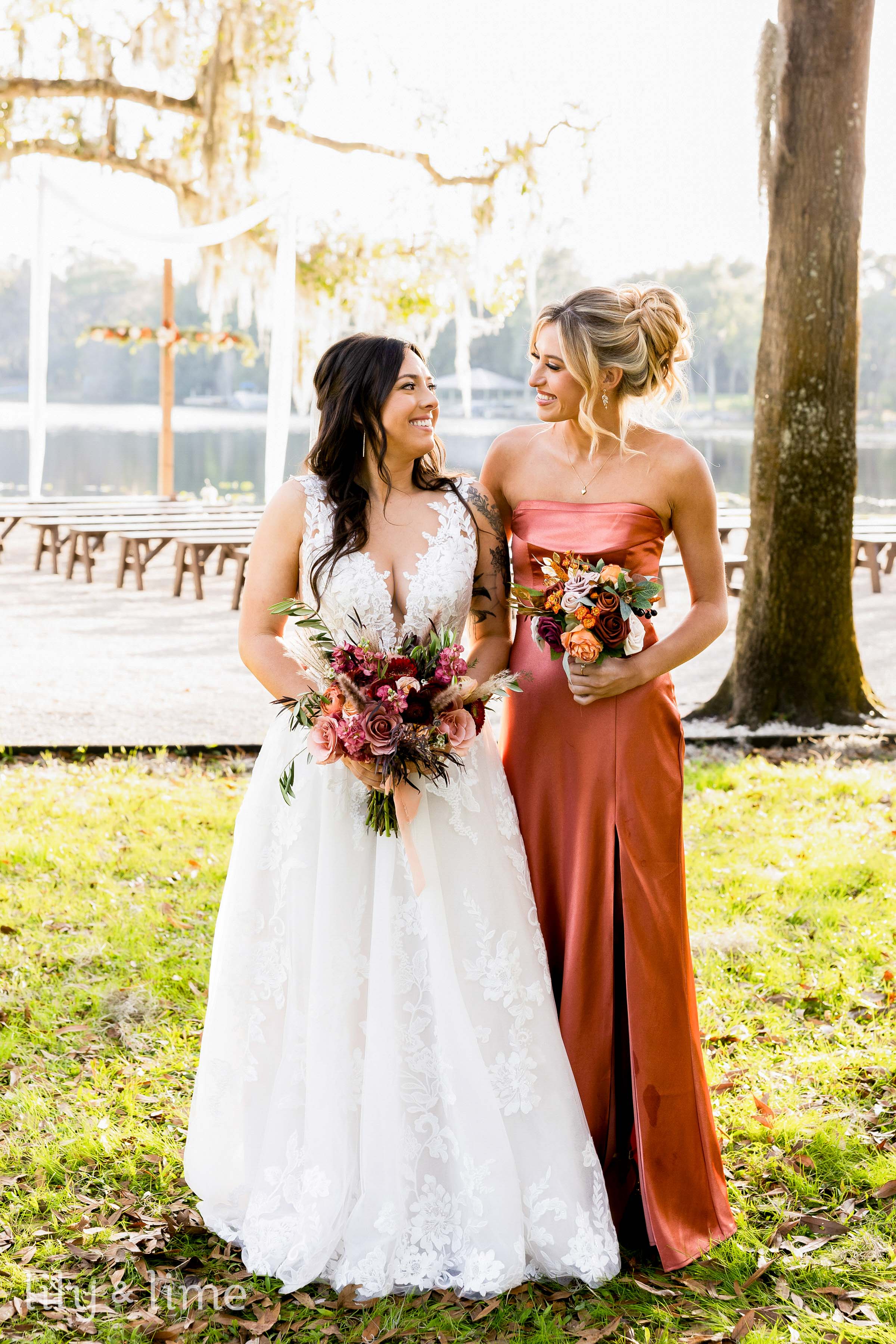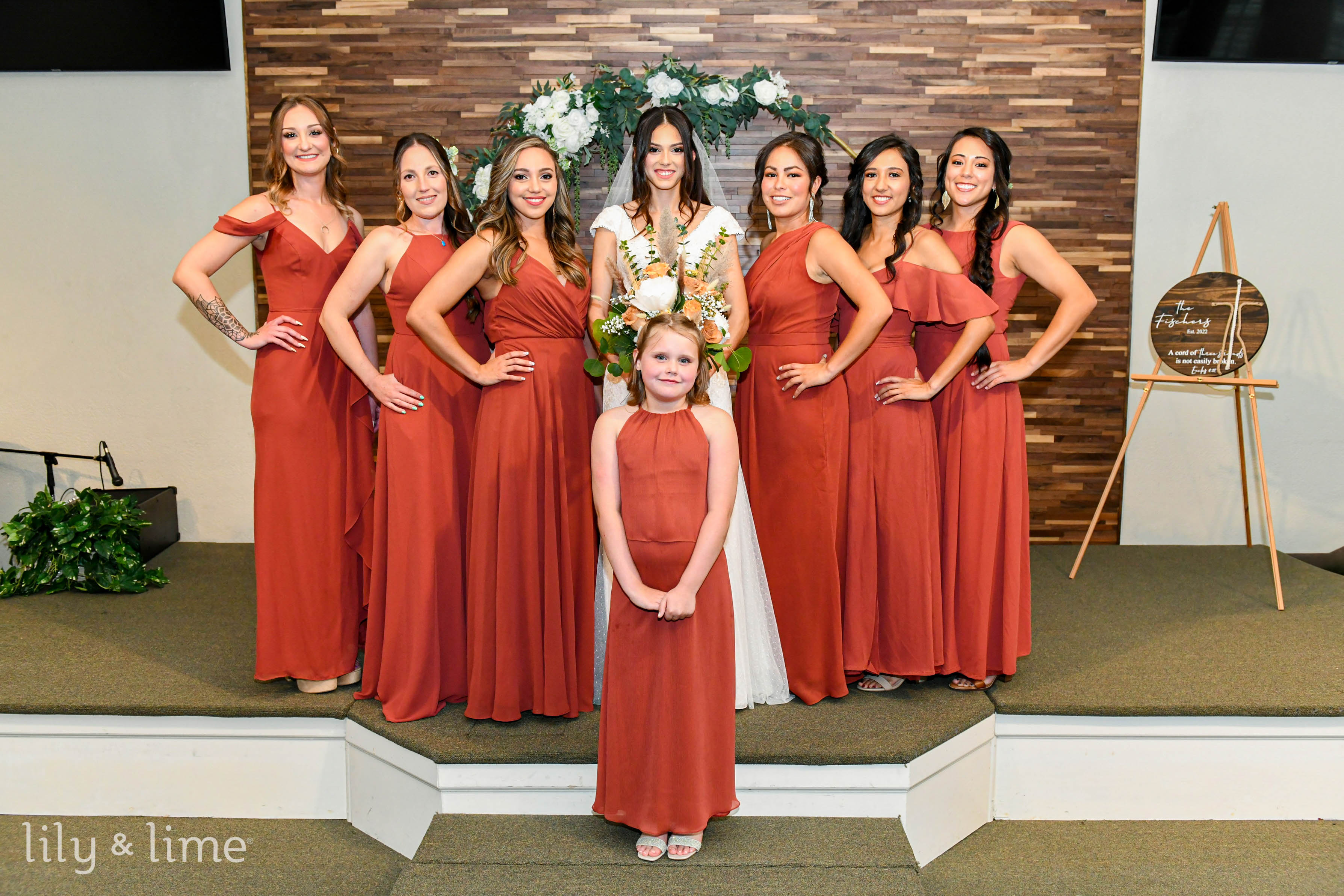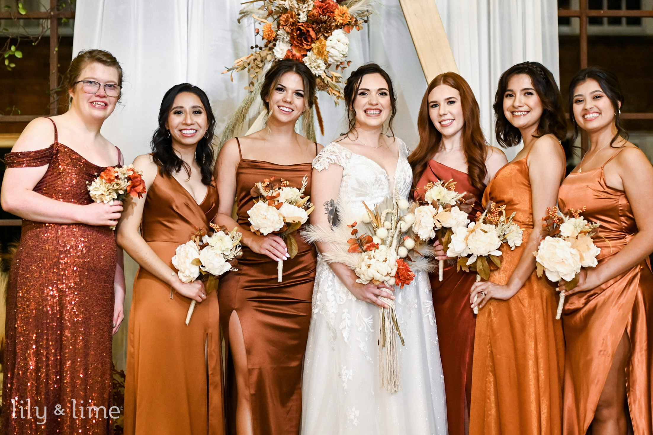 Burnt Orange Hues: Burnt orange is a quintessential fall color that adds warmth and vibrancy to your wedding palette. Dresses in this shade are eye-catching and beautiful, perfectly capturing the essence of autumn. Burnt orange bridesmaid dresses can be paired with complementary colors like deep browns, golds, and greens to create a rich and cohesive look. This warm hue is flattering on various skin tones and adds a cozy, inviting feel to your wedding celebration.
