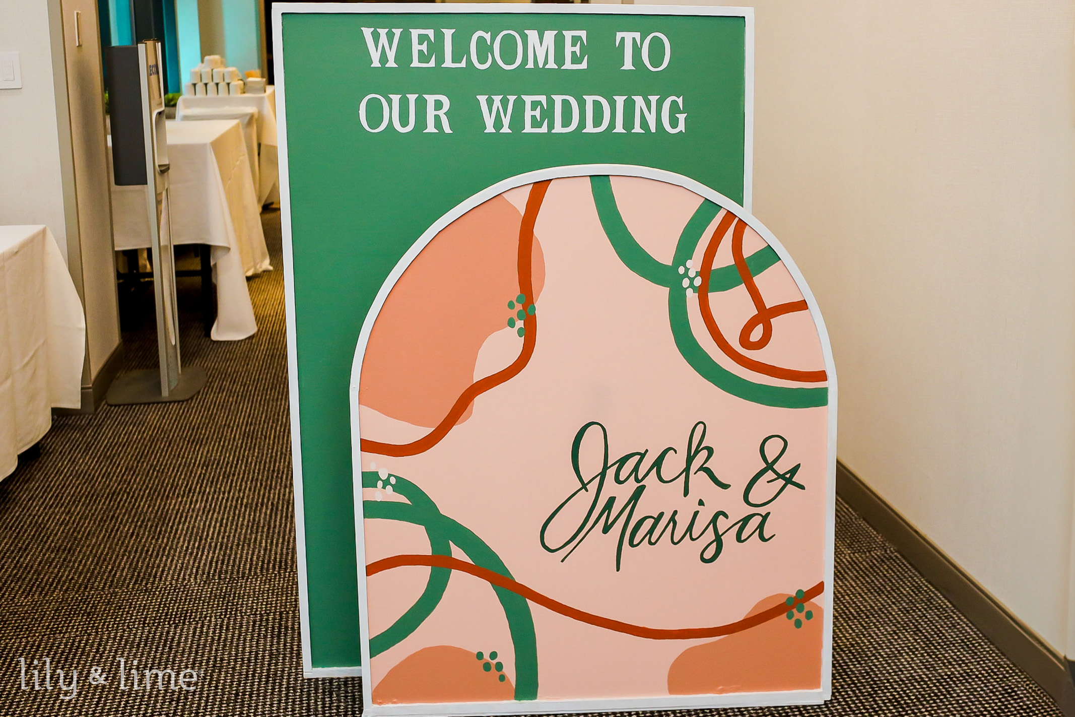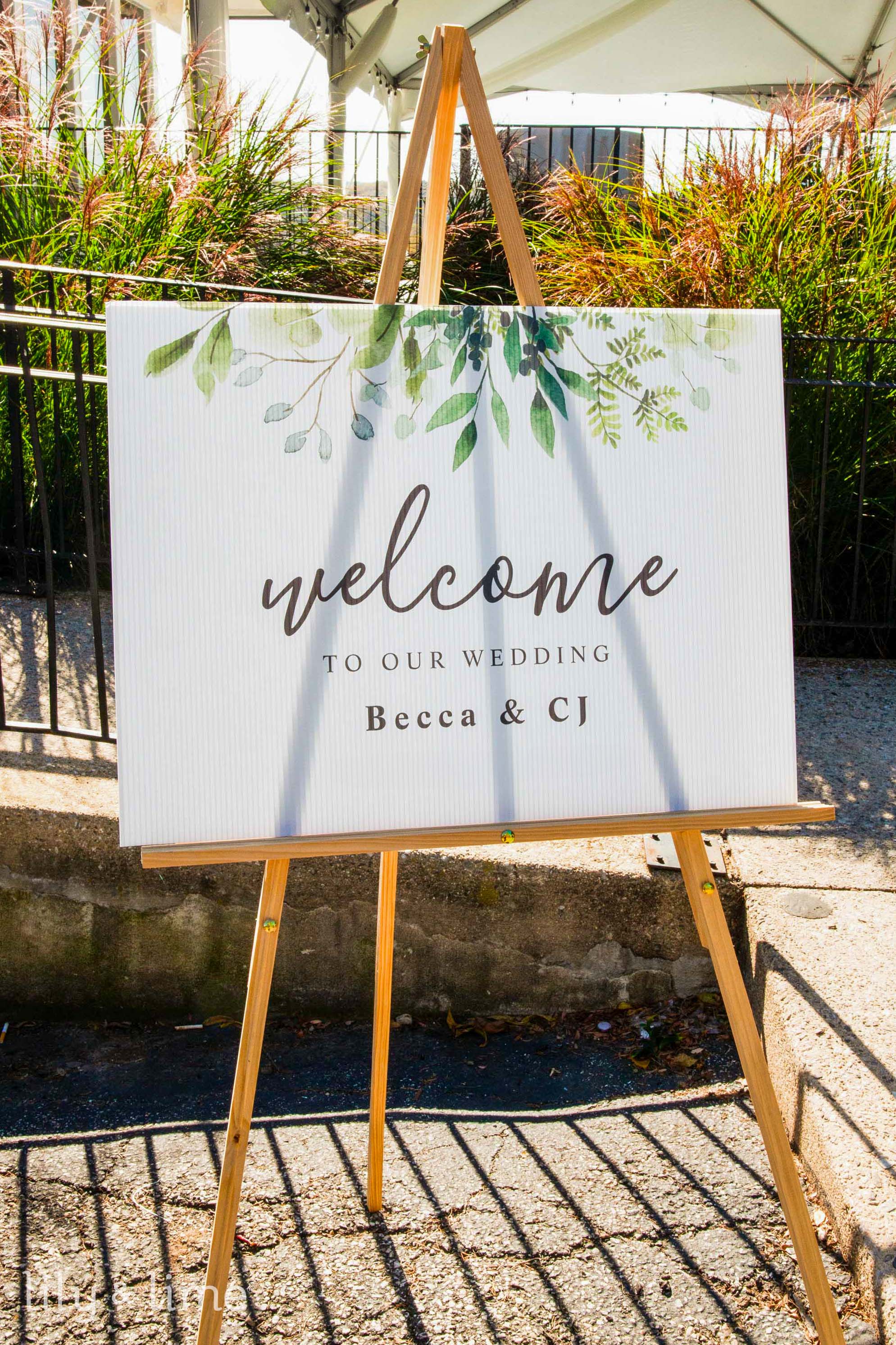 Celebrate your stunning venue with an illustrated backdrop sign showcasing its architectural charm or natural beauty. Position it at the ceremony altar or near the reception seating area for photo opportunities. Add touches of greenery or fairy lights for decoration. This creative wedding signage idea combines personalization with an elegant nod to your wedding location, making it a timeless addition to your decor.