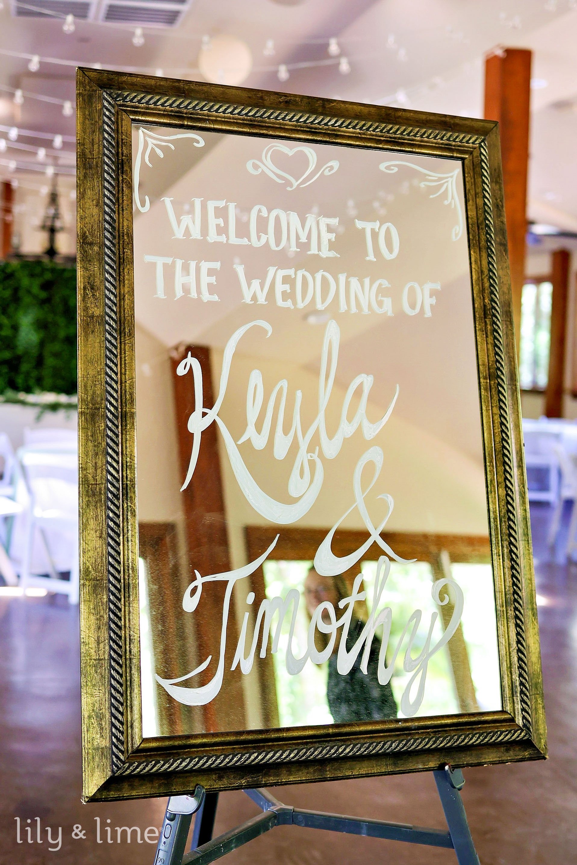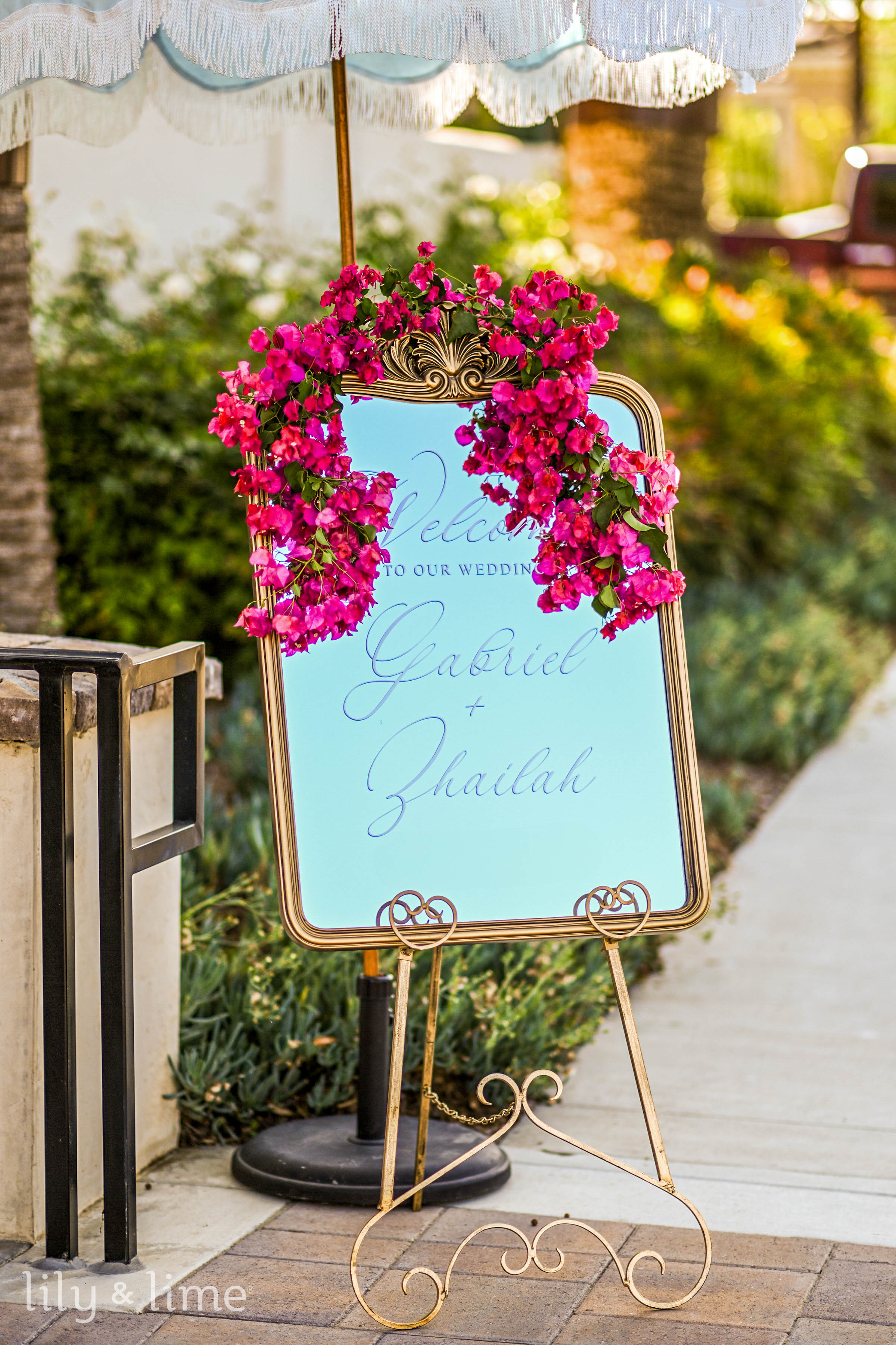 Elevate your bar area with a stunning mirror featuring an elegantly scripted drink menu. Lean the mirror against the wall or prop it on an easel, surrounding it with string lights or floral garlands. This luxurious reception bar sign idea adds a chic touch to a glamorous wedding theme while serving as a functional focal point.