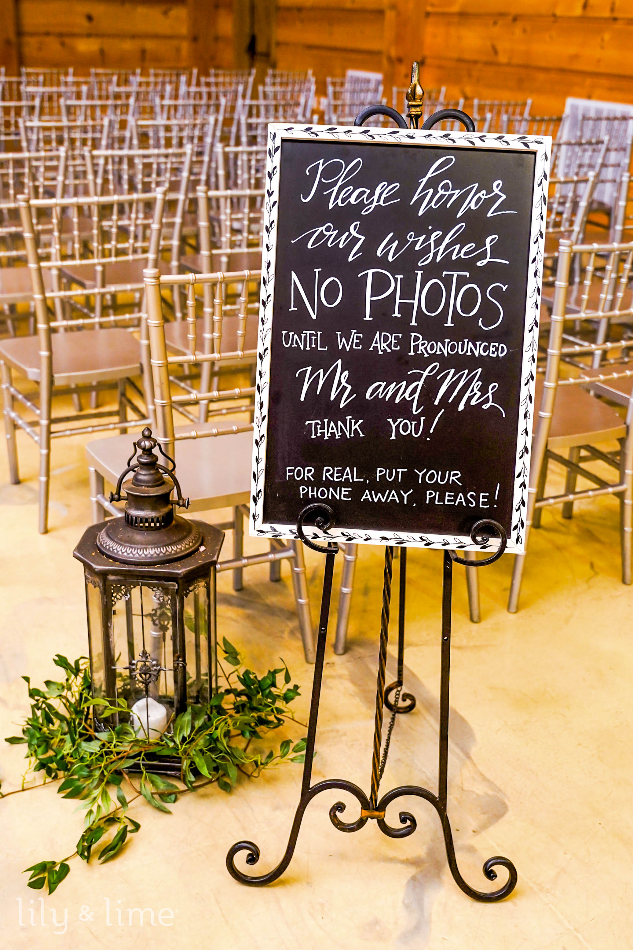 Ensure your ceremony remains intimate and distraction-free with a hand-lettered unplugged ceremony wooden board inviting guests to put away their phones and cameras. Decorate the board with sprigs of baby's breath or ivy to enhance its appeal. Place this functional wedding sign at the ceremony entrance for a thoughtful touch.