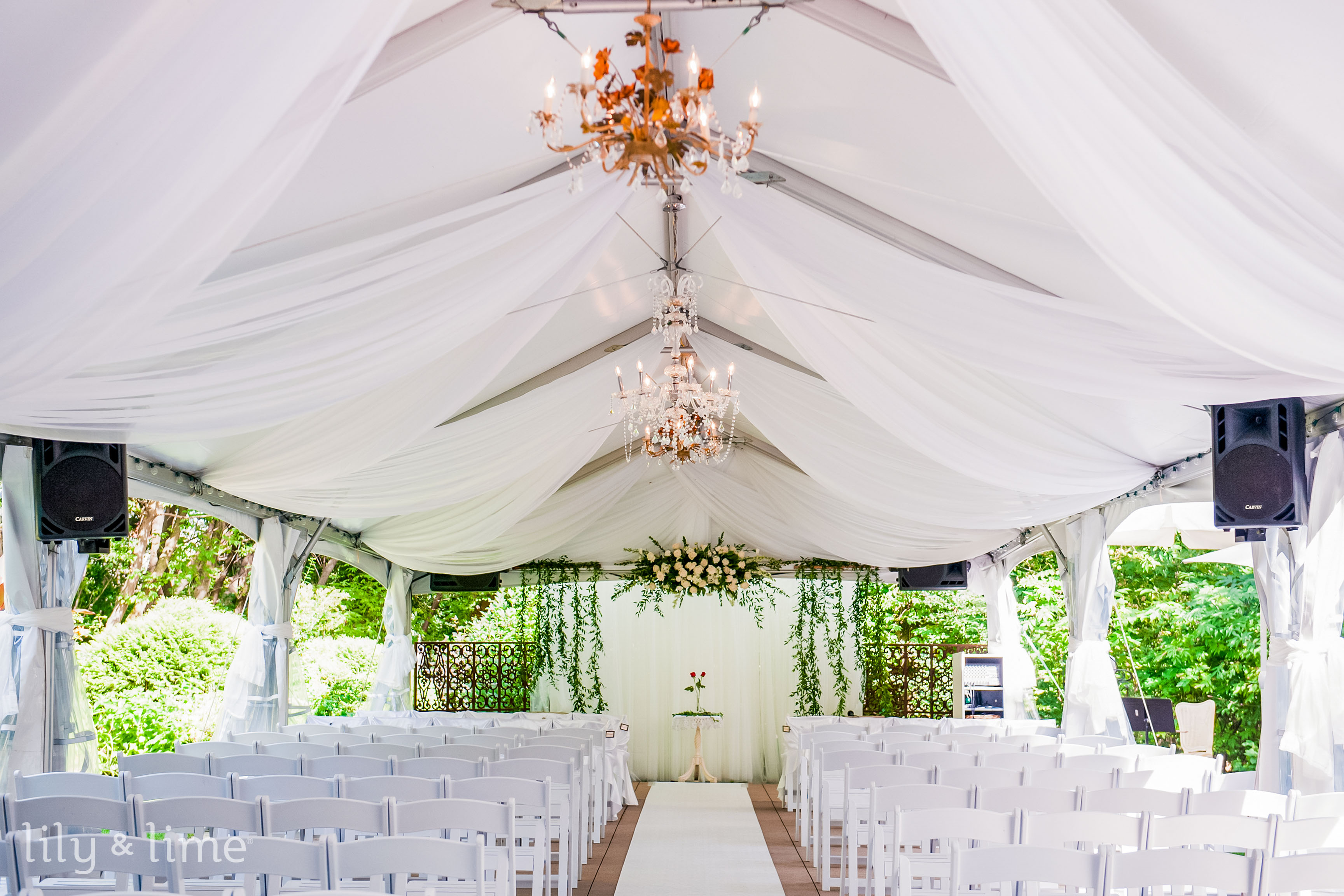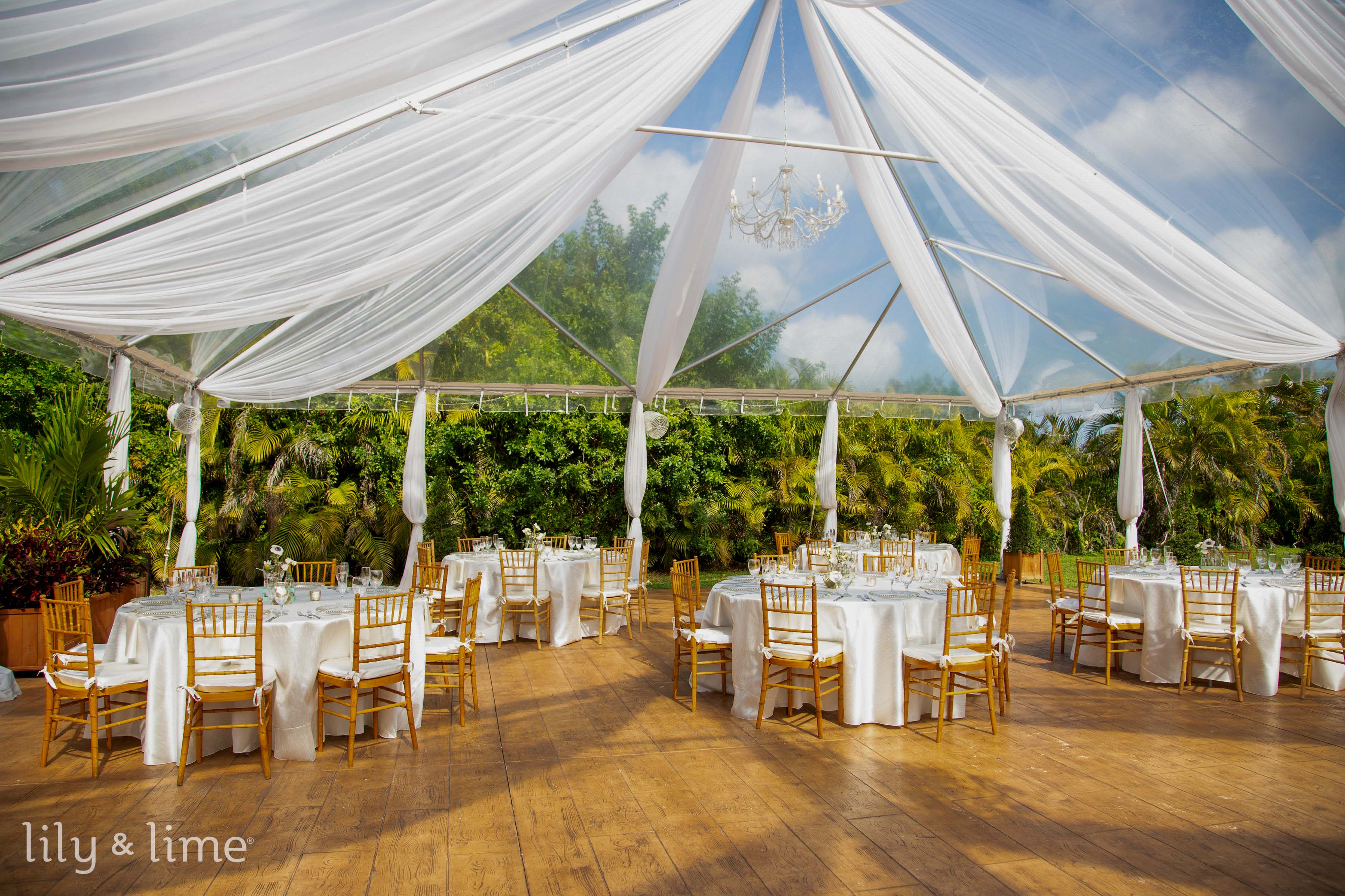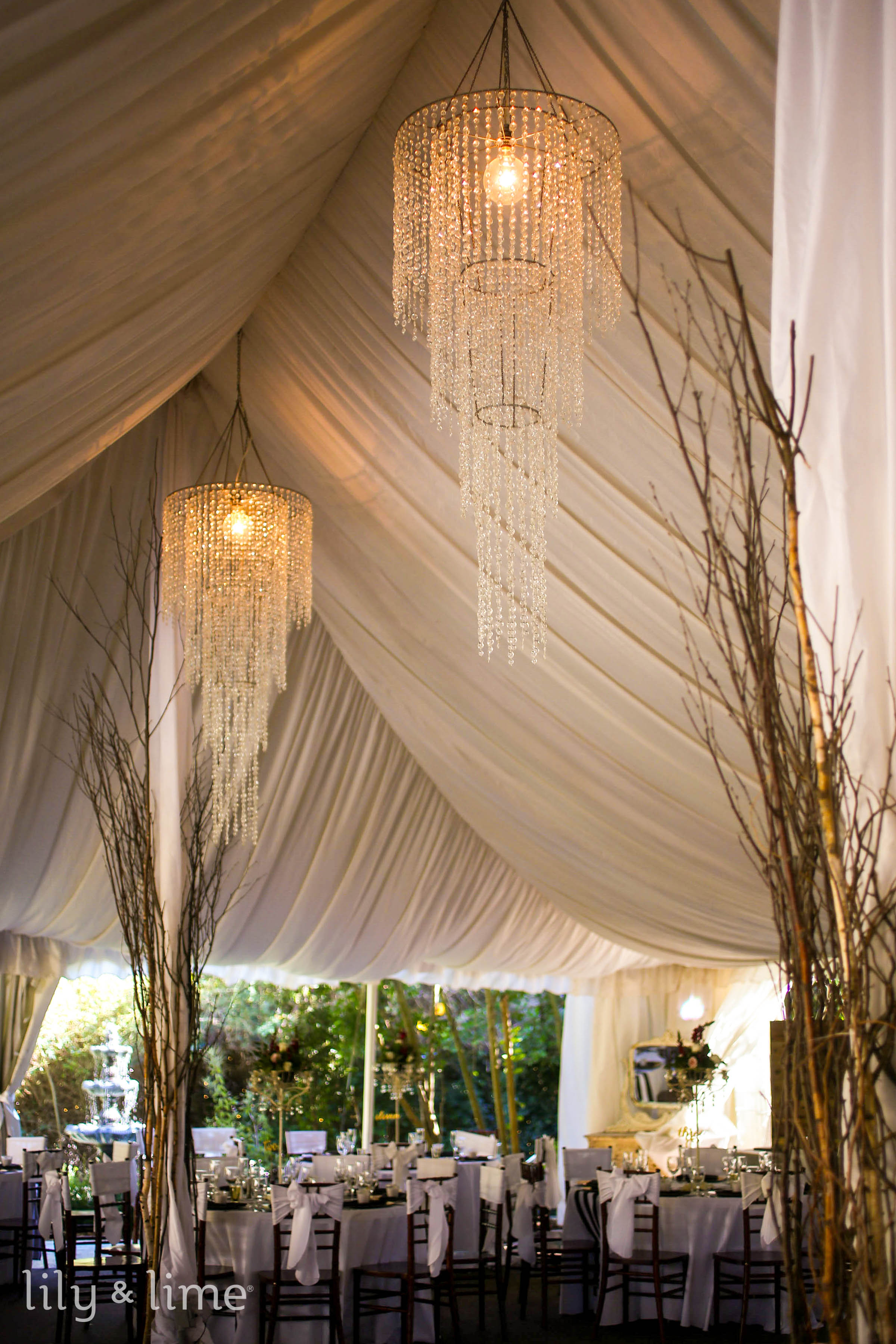 Elevate an outdoor tent by adding draped fabric to the ceiling for a faux-ceiling effect. Interlace the fabrics with greenery or flowers for a botanical touch, or hang lights above the drapes for a mesmerizing evening effect. This design perfectly complements outdoor wedding themes with a versatile, elegant style.