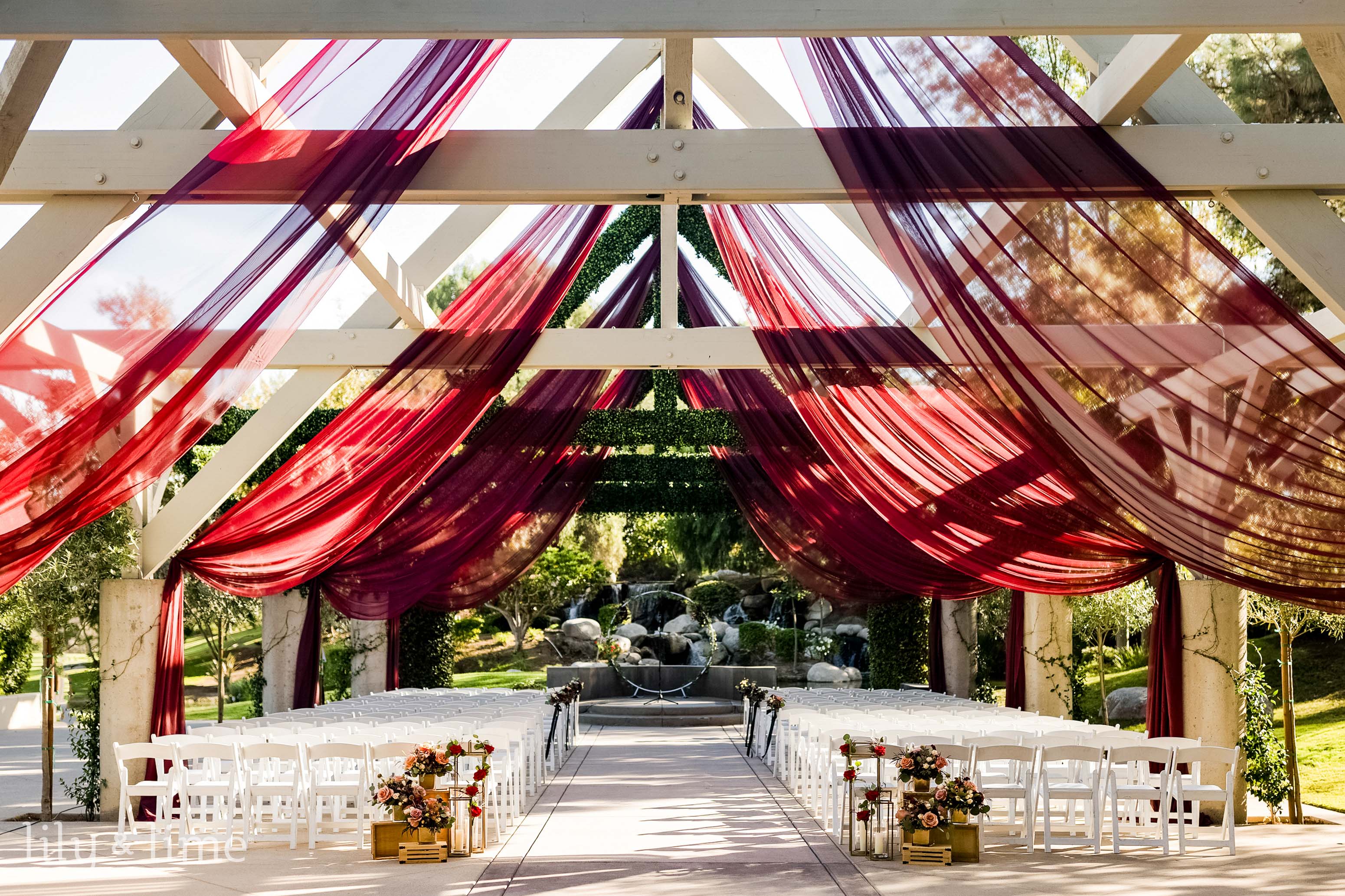 Enhance an outdoor pavilion by using drapery to define the space. Soft, flowing fabrics like white muslin or linen create a relaxed, rustic vibe, perfect for barn wedding venues. Incorporate garlands of greenery or dried flowers for a bohemian twist. This design softens the structure, complements the natural environment, and provides a dreamy setting for both the ceremony and reception festivities.
