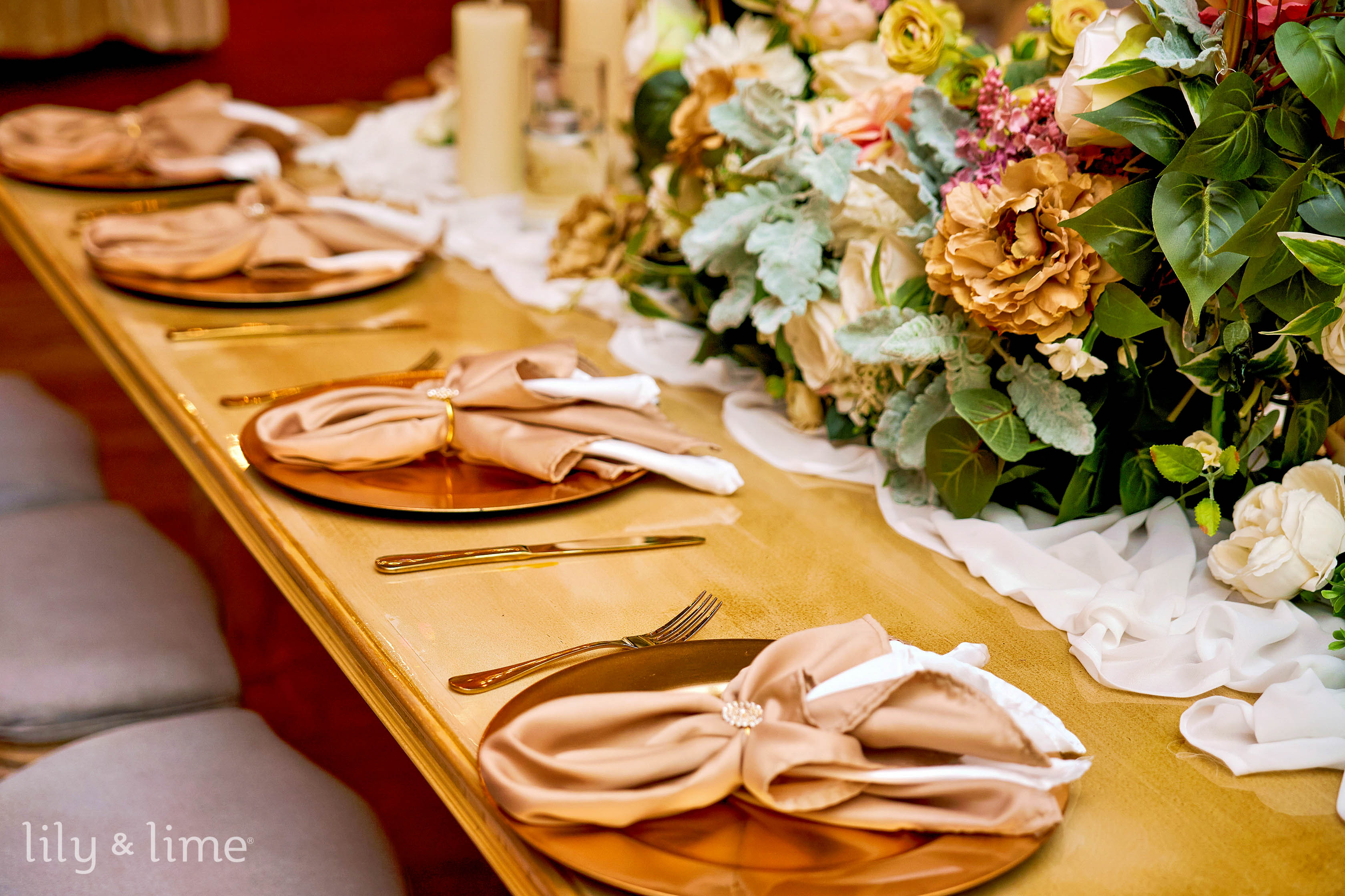 Infuse warmth and romance with these stunning warm autumn wedding tones. Beige provides a soft foundation, while blush and deep red steal the show in bouquets, draping, and candle arrangements. Accessorize with blush napkins, deep red floral centerpieces, and gilded accents for extra glamor.