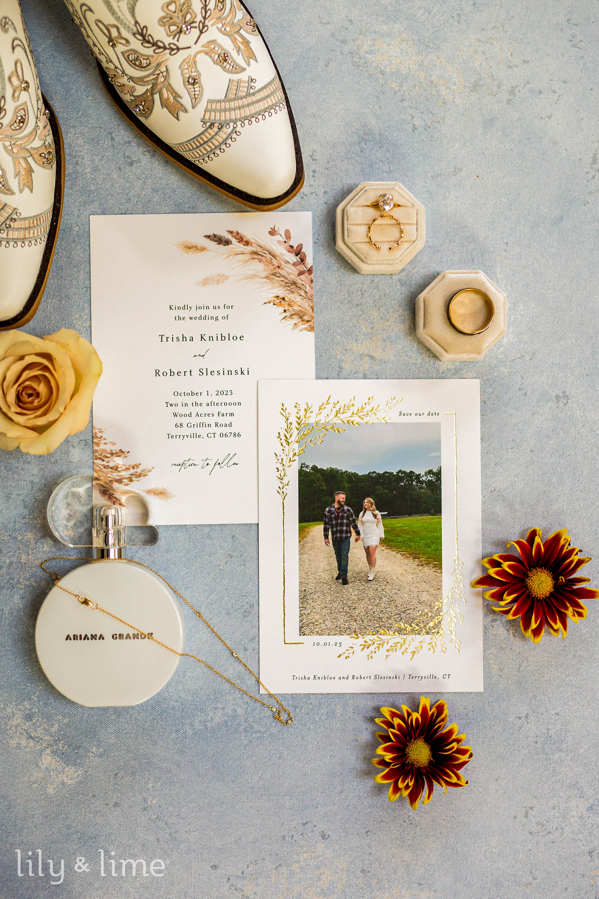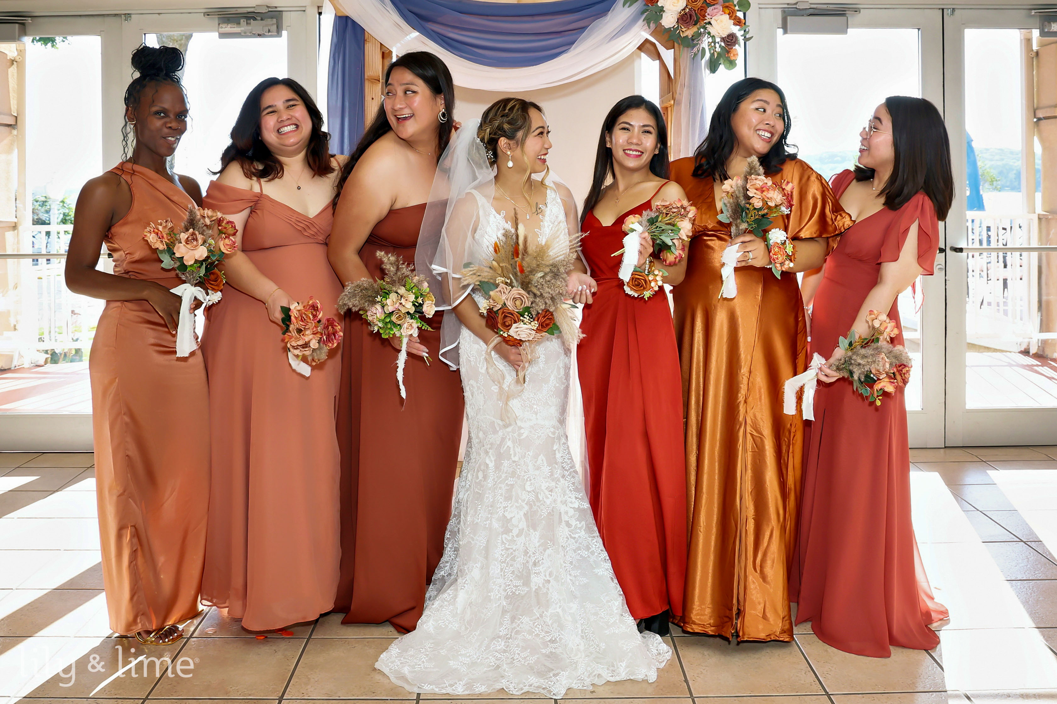 Terracotta’s rustic warmth pairs exquisitely with the serene charm of dusty blue, creating an earthy-meets-elegant vibe. These rust wedding color palettes are perfect for outdoor barn weddings or intimate indoor settings. Accessorize with terracotta vase centerpieces, ribbon details for invitations, and dusty blue linen draping.