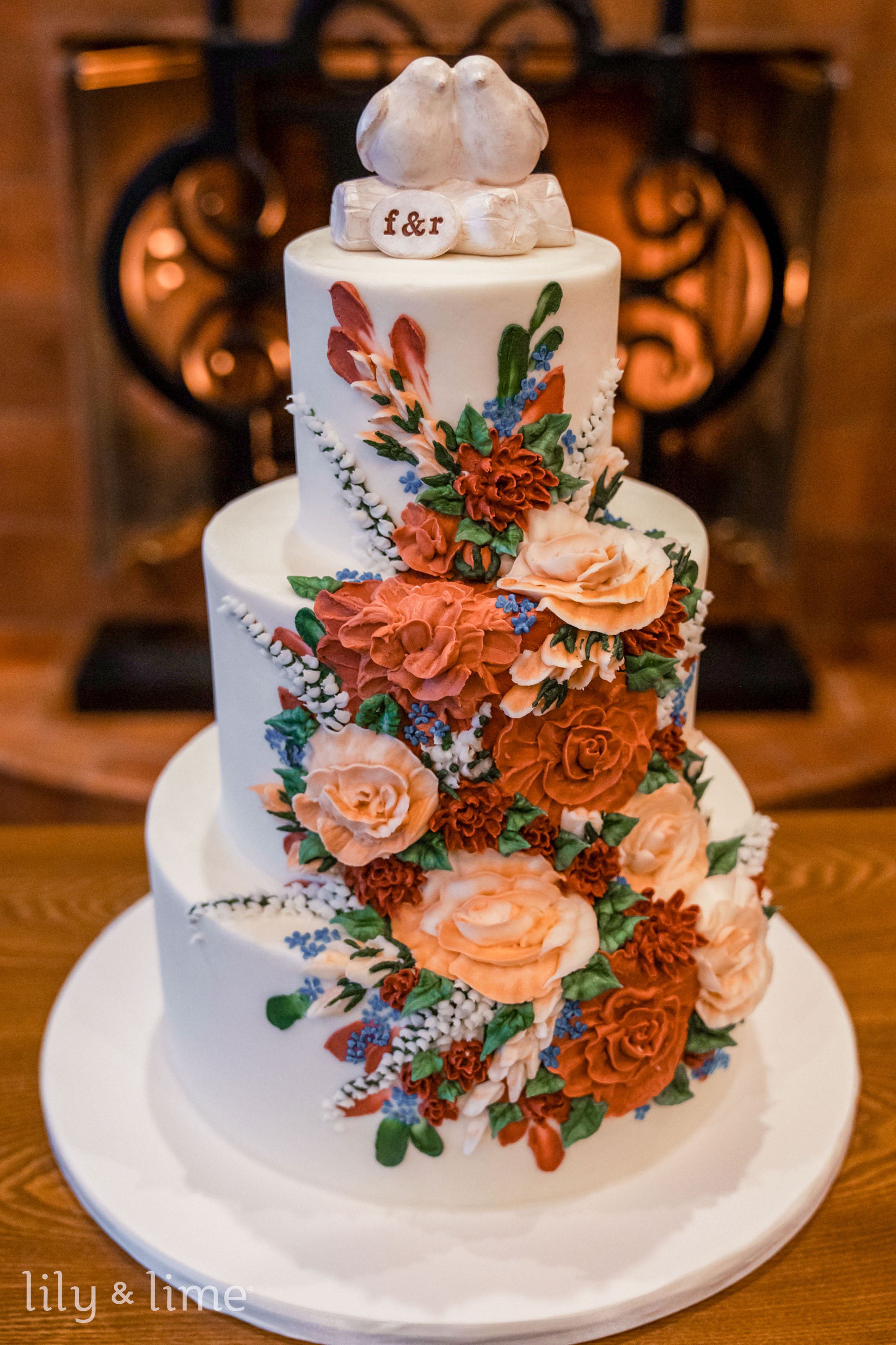 A sophisticated choice, a marble-effect cake features swirls of gray and white frosting accented with edible gold leaf. Add small sugar flowers in muted fall tones to complete the elegant look. This design is perfect for brides looking for something modern while nodding subtly to the season.