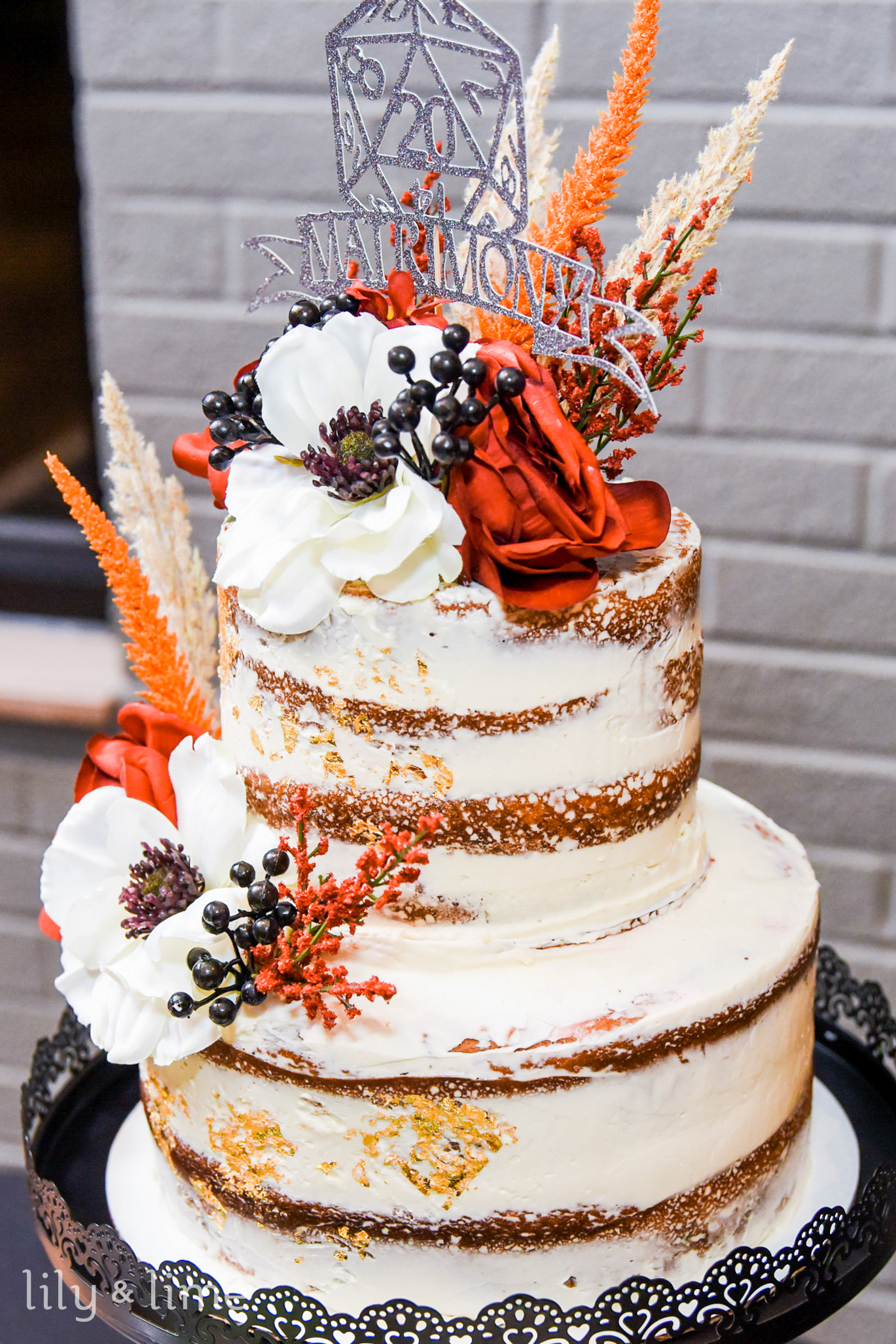 Rich, dark chocolate layers paired with bright pomegranate seeds create a striking fall wedding cake. The juicy pomegranate provides a burst of seasonal flavor, while its crimson hue adds vibrance to the dark chocolate cake. This design is elegant yet bold, ideal for brides who want their wedding dessert table to stand out.