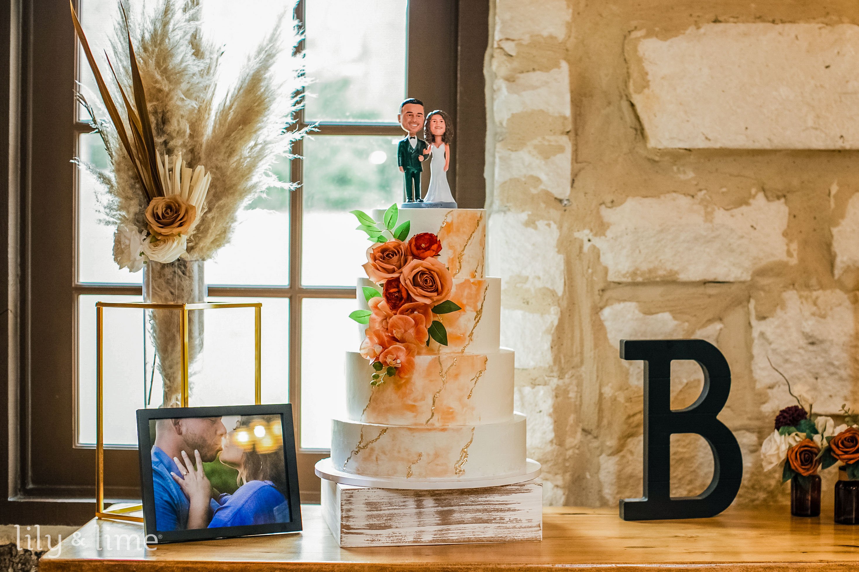 This artistic wedding cake combines the metallic sheen of rusted copper fondant with hand-painted gold brushstroke details. Topped with marbled sugar leaves or figs, the design has an avant-garde charm that's ideal for modern brides. It’s a bold and trend-forward take on a fall wedding cake.