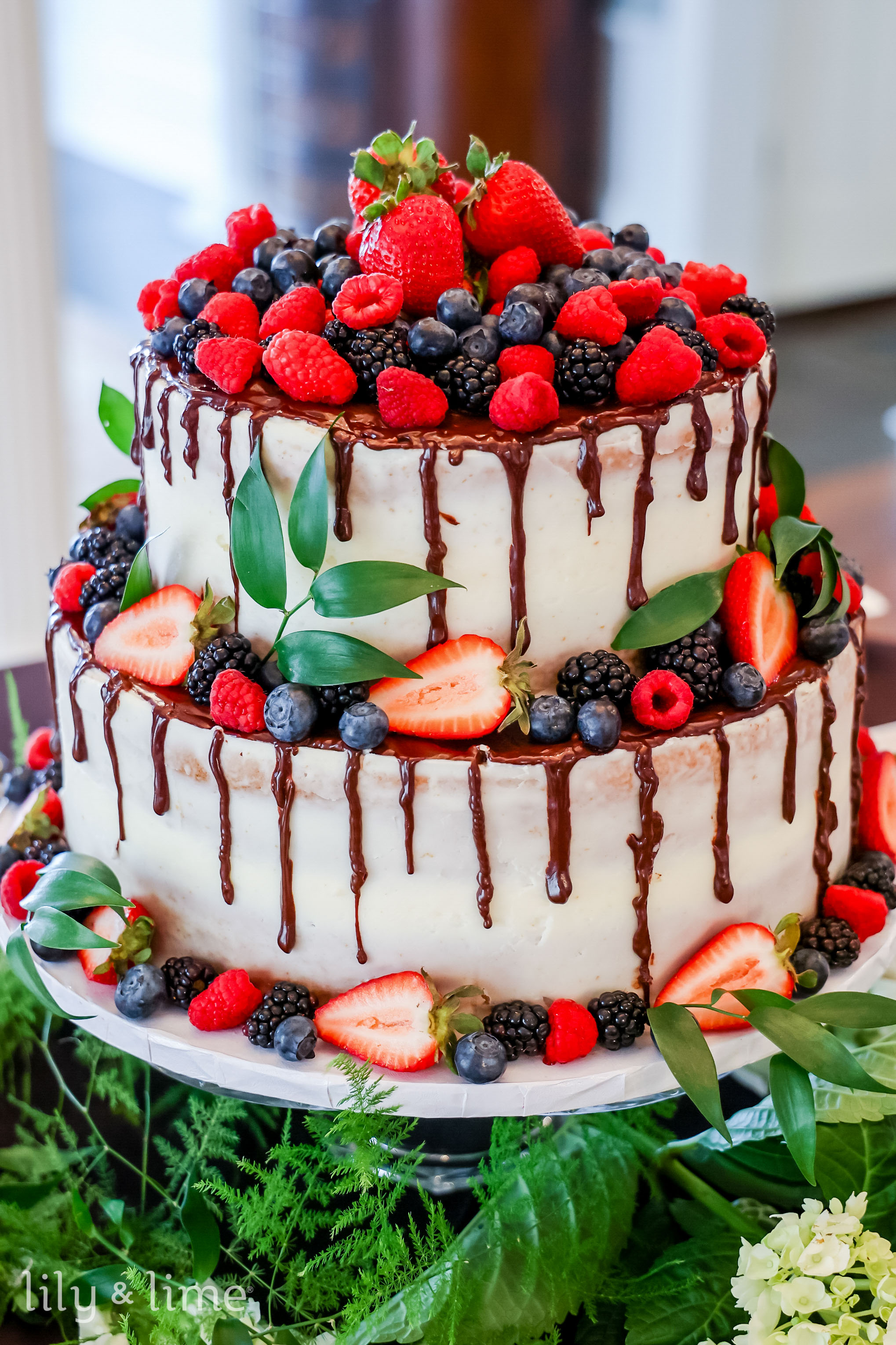 A luscious chocolate ganache drip cake beautifully combines indulgence and elegance. The glossy ganache drips down its layers, highlighted by seasonal additions like figs, deep-hued blooms, and rust-colored foliage. The rich tones of the cake and its autumnal accents make it a decadent choice for couples with a love of classic wedding desserts.