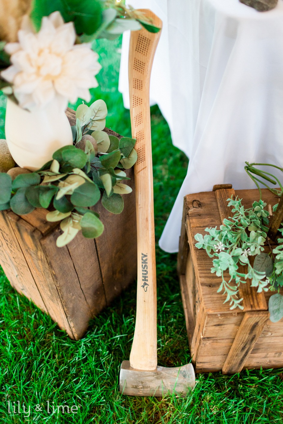 Swap traditional wedding dessert displays for rustic tree trunk slices. Use them as stands for your wedding cake, cupcakes, and other treats. This natural element ties perfectly into your camping theme and gives your dessert table an earthy yet elegant presentation. Rustic cake displays are a wedding cake trend that’s both eco-friendly and chic.
