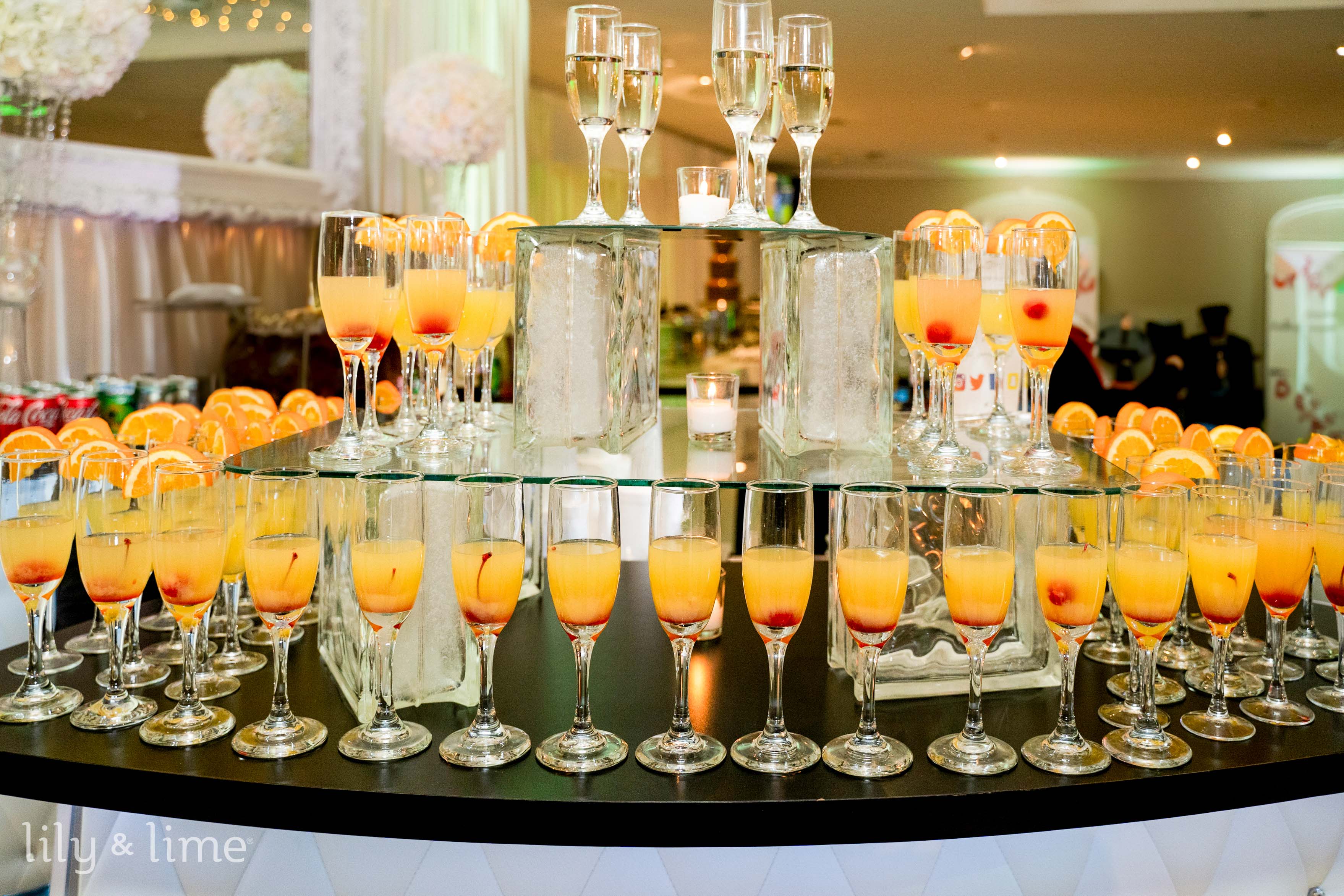 Take your bubbly station to new heights with a tiered champagne tree display. This multi-level setup ensures easy access for guests while offering a unique visual spectacle. This tiered champagne wall concept is both functional and seriously striking for any reception.