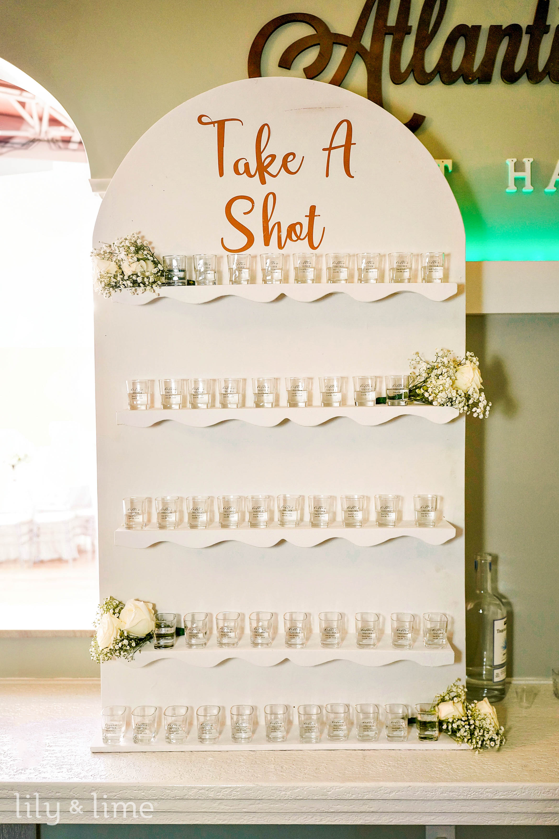 Add a personal touch to your champagne wall by incorporating your wedding monogram. Display the initials of you and your partner at the center, surrounded by glasses of bubbly. This custom monogram champagne wall not only elevates the personalization of your decor but also provides an incredible photo opportunity for guests.
