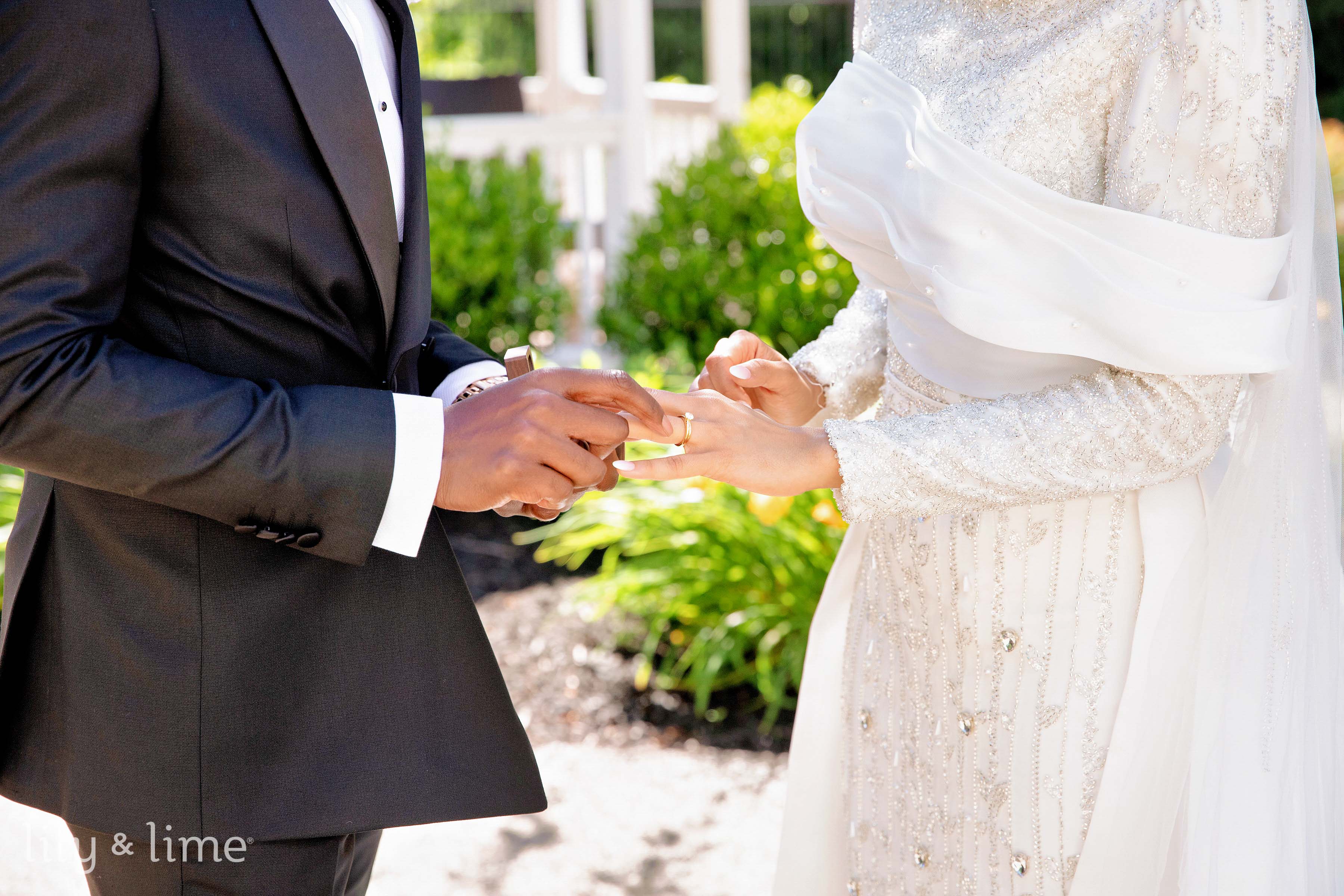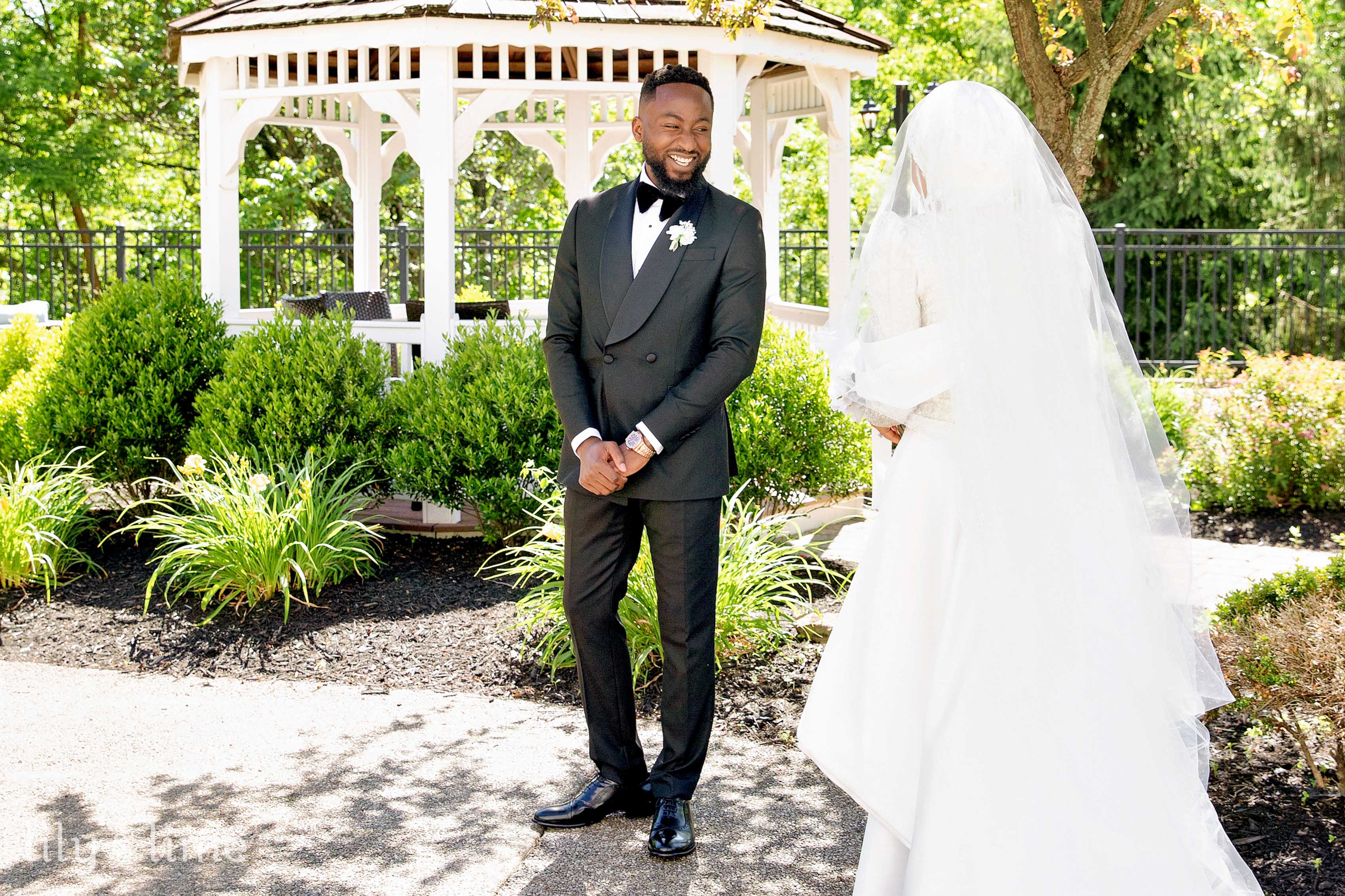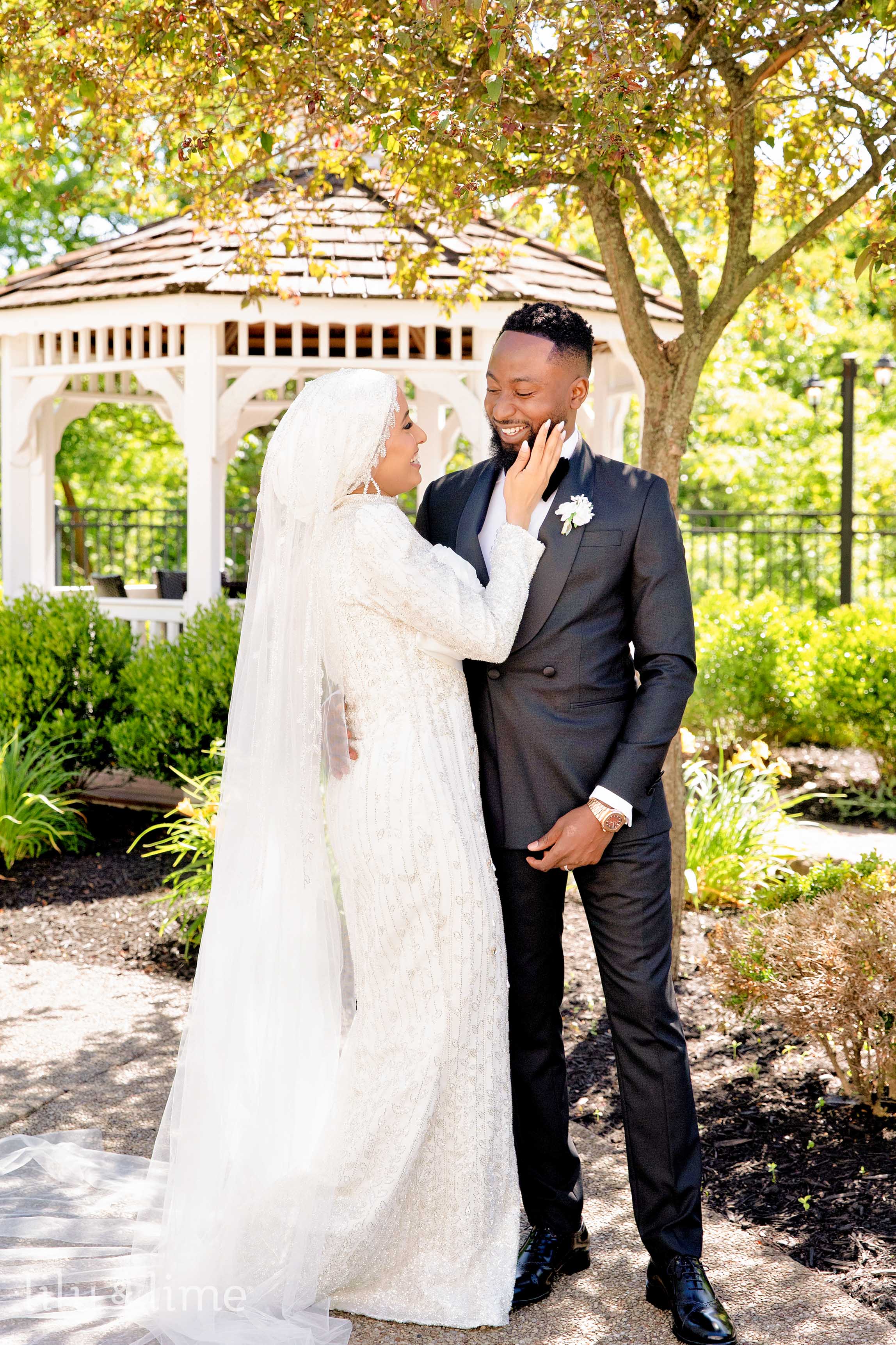The first look session between Nuhu and Abeer was truly magical. It was here we saw Abeer for the first time, adorned in a traditional wedding dress featuring intricate beads and crystal appliques with a long sweeping train and a beautiful head veil. Her timeless white manicure and gorgeous white bridal bouquet featuring roses completed her breathtaking look. The soft sunlight filtering through the trees added a touch of enchantment to the bride and groom portraits taken in the venue's gardens and gazebos.