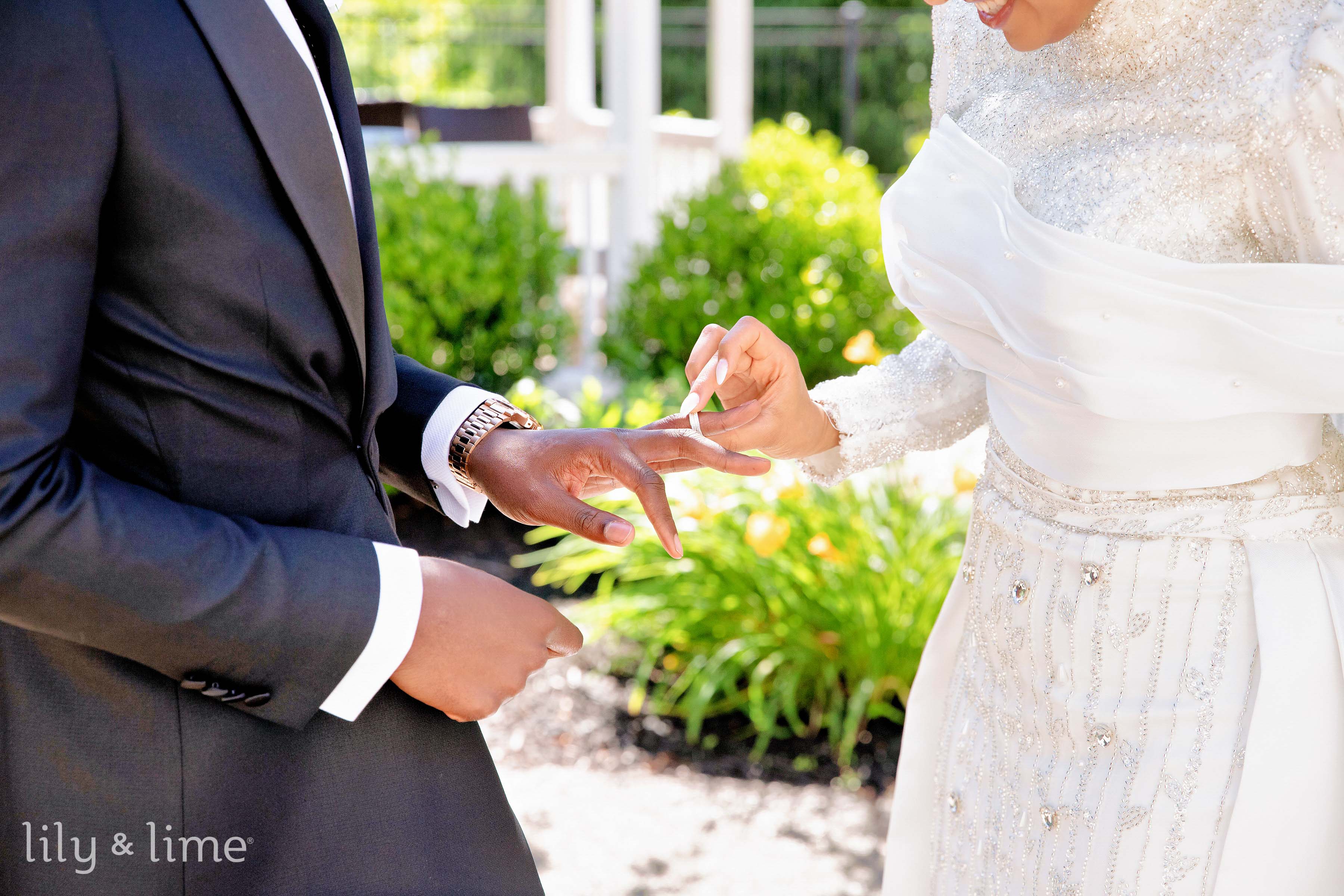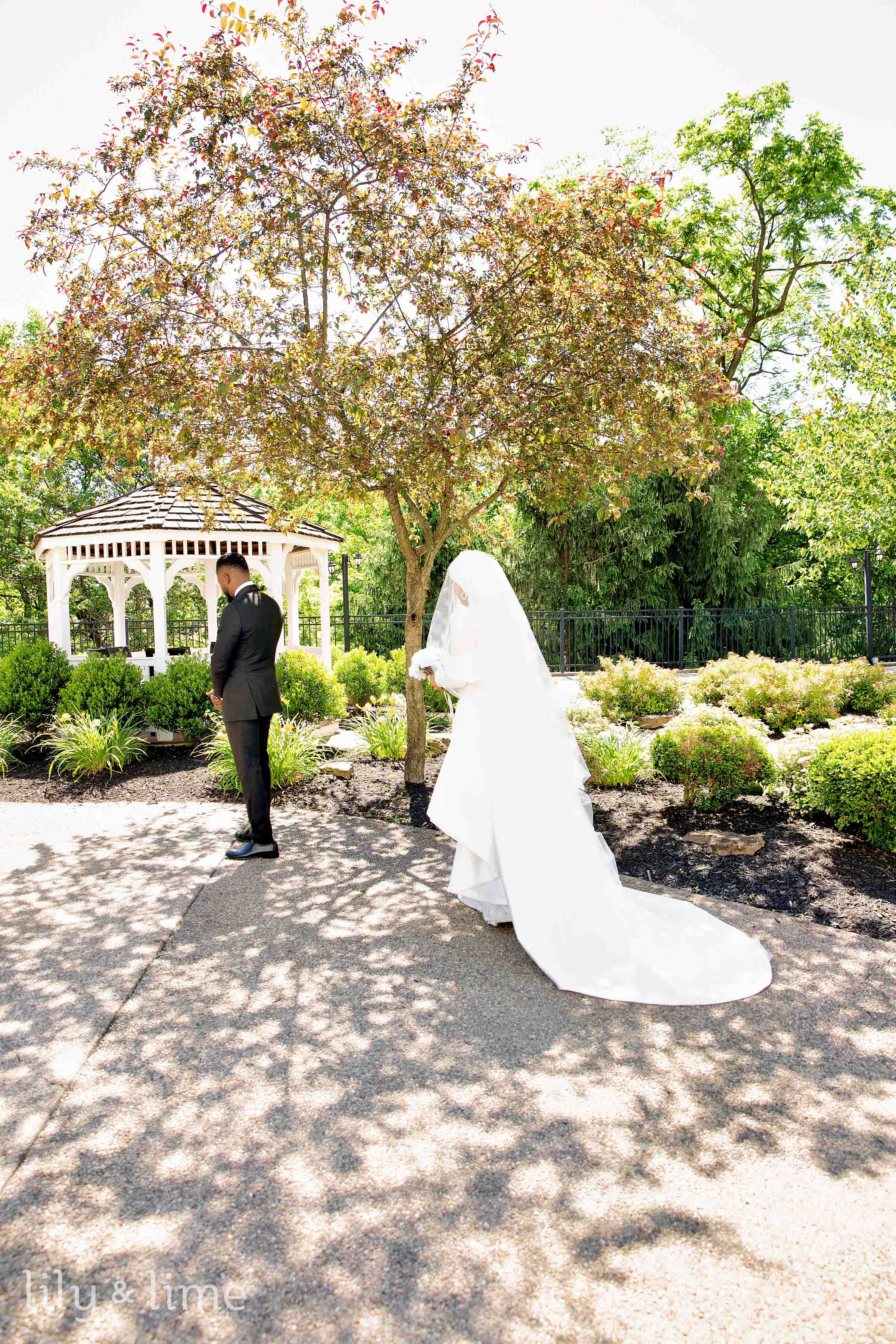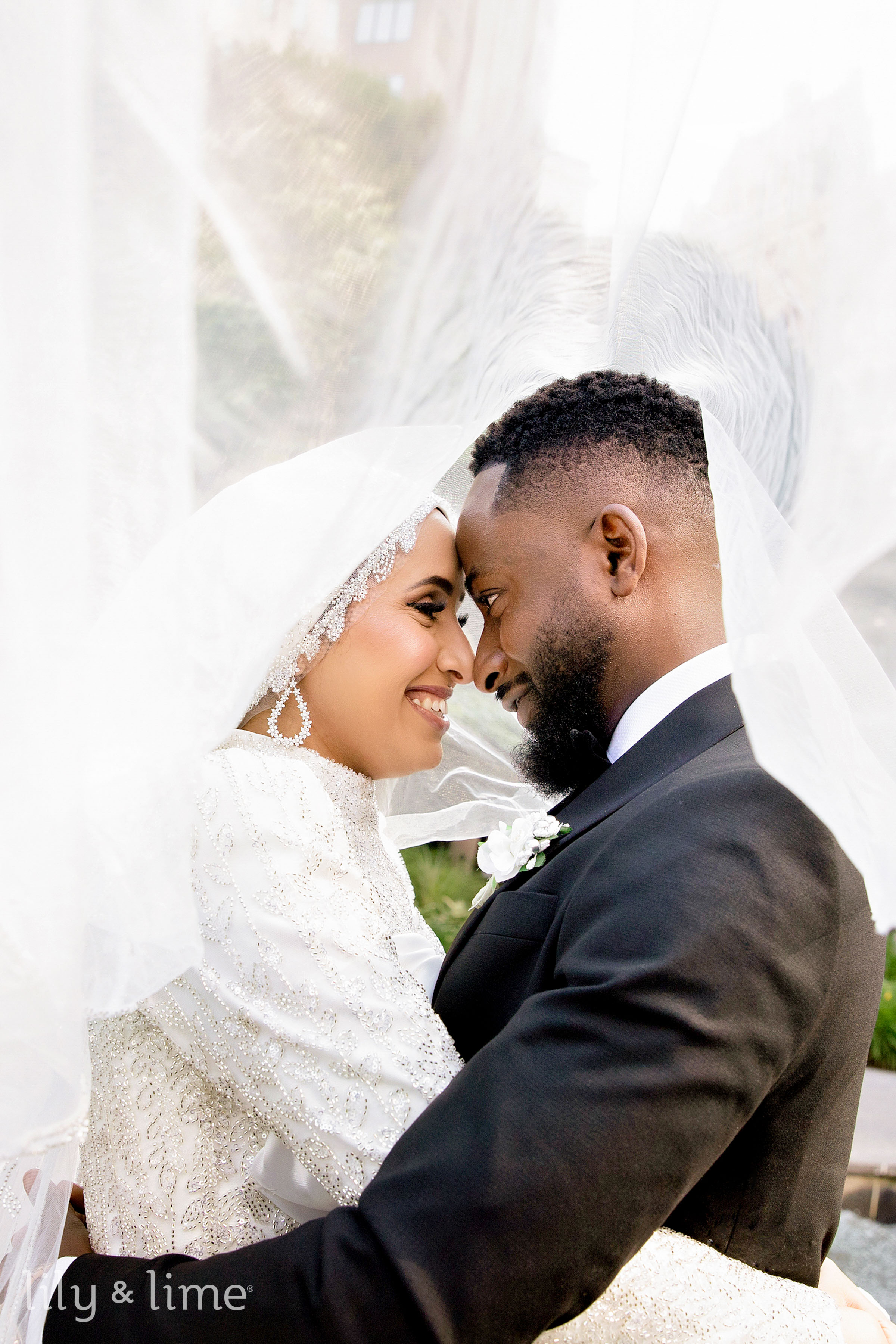 The first look session between Nuhu and Abeer was truly magical. It was here we saw Abeer for the first time, adorned in a traditional wedding dress featuring intricate beads and crystal appliques with a long sweeping train and a beautiful head veil. Her timeless white manicure and gorgeous white bridal bouquet featuring roses completed her breathtaking look. The soft sunlight filtering through the trees added a touch of enchantment to the bride and groom portraits taken in the venue's gardens and gazebos.