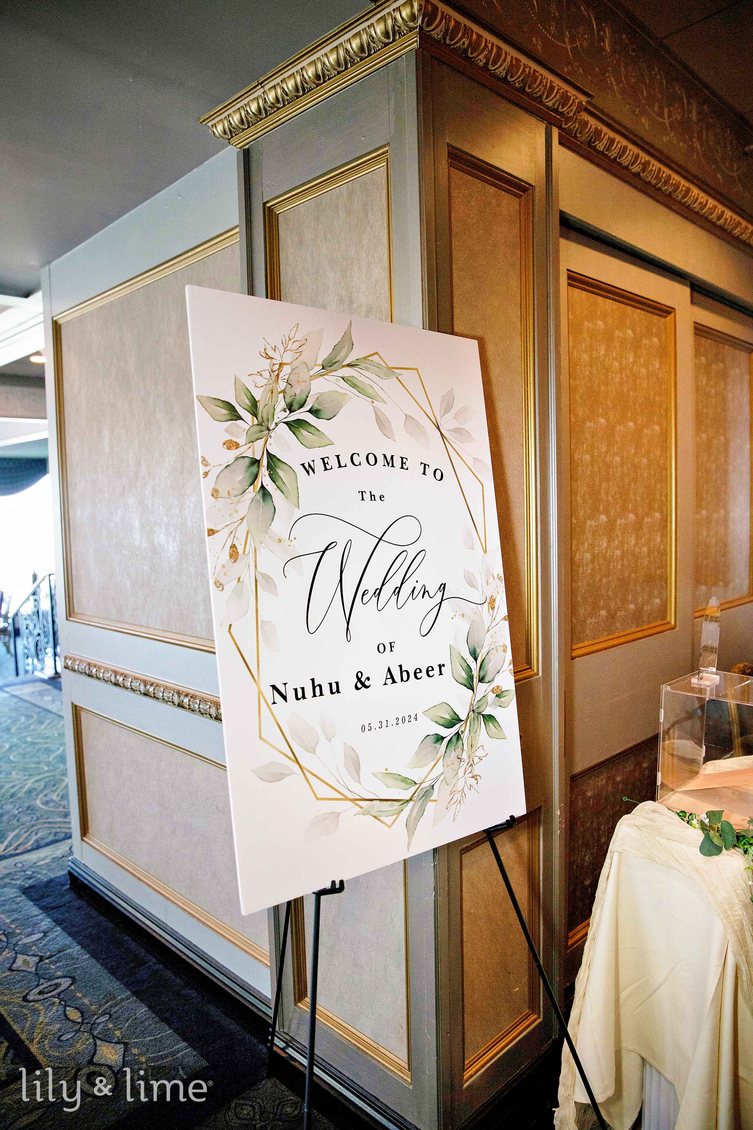 Nuhu and Abeer’s wedding ceremony was traditional and heartfelt, followed seamlessly by a lively reception at the same venue. The reception area was adorned with gourmet wedding menu displays, acrylic wedding gift table ideas, all-white wedding signs accented with greenery details, and a beautiful sweetheart table decorated with greenery and white roses. Each wedding table place setting was thoughtfully arranged with thank you cards and personalized gifts for every guest, adding a personal touch to the celebration. The guests' traditional attire added vibrancy and elegance to the entire setup.