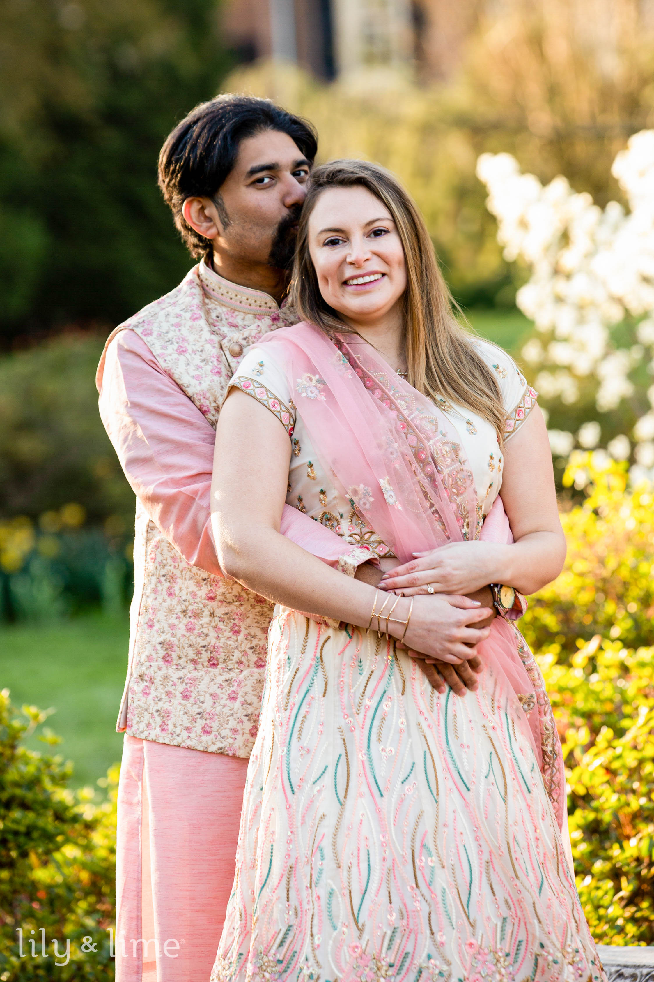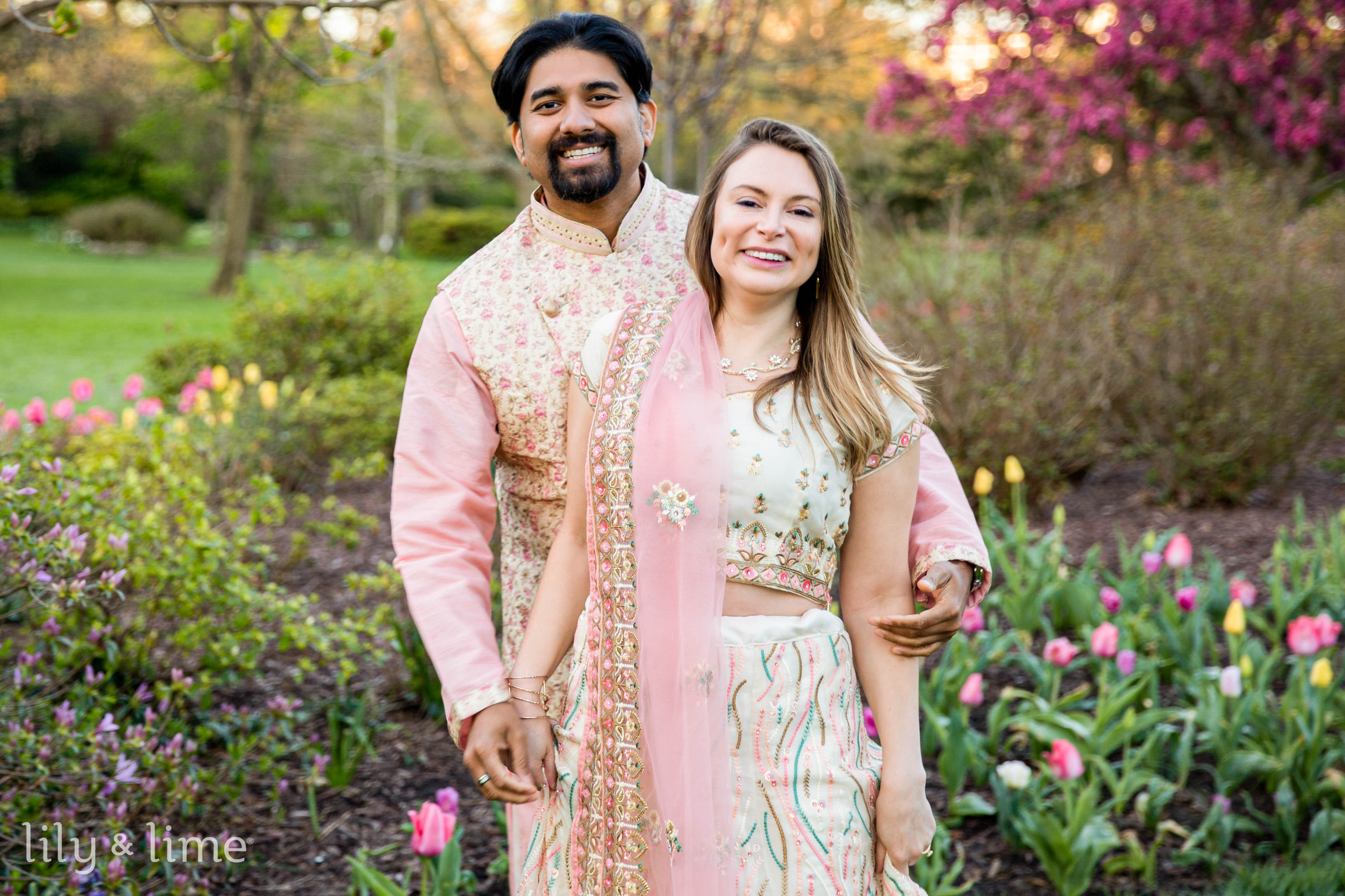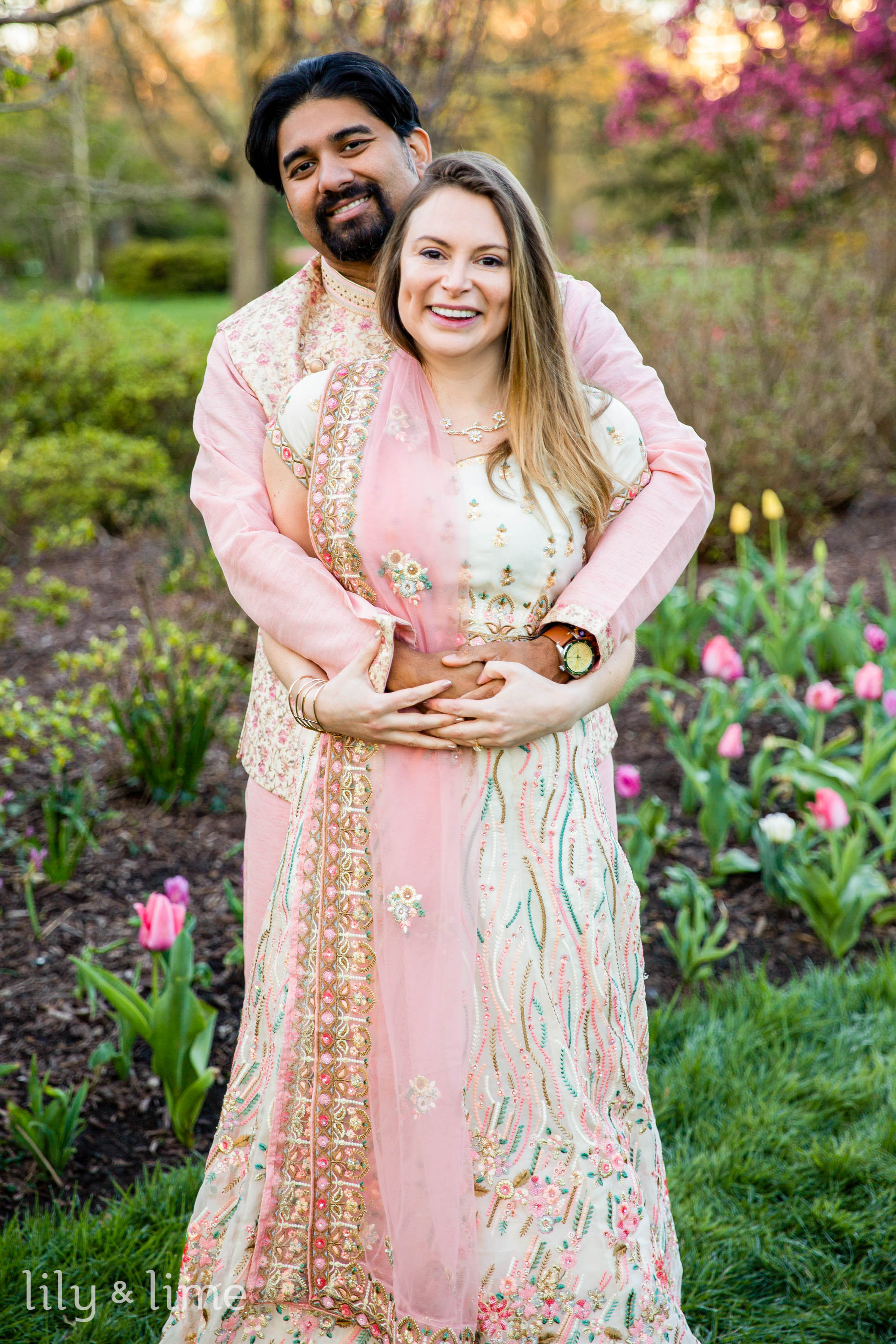 Abhik and Sally’s outdoor engagement photoshoot was a breathtaking blend of love, culture, and the vivid vibrancy of nature. Set against the lush tapestry of a flower-filled garden, their session unfolded like a fairy tale written in blooms and tender glances. The day began with the garden cloaked in the soft, golden light of early morning, casting a serene glow over the myriad of flowers that awaited the couple. Abhik and Sally arrived, looking nothing short of royal in their South Asian attire, their excitement palpable in the crisp morning air. Sally, adorned in a cream lehenga with exquisite pink embroidery and embellishments, looked ethereal. Her pink dupatta fluttered gently in the breeze, a perfect complement to her delicate jewelry and soft, open-flowing hair styled with light engagement makeup. Abhik, her fitting counterpart, wore a pink kurta paired with white pajama pants, over which he draped a floral ethnic jacket, mirroring the garden's bloom.