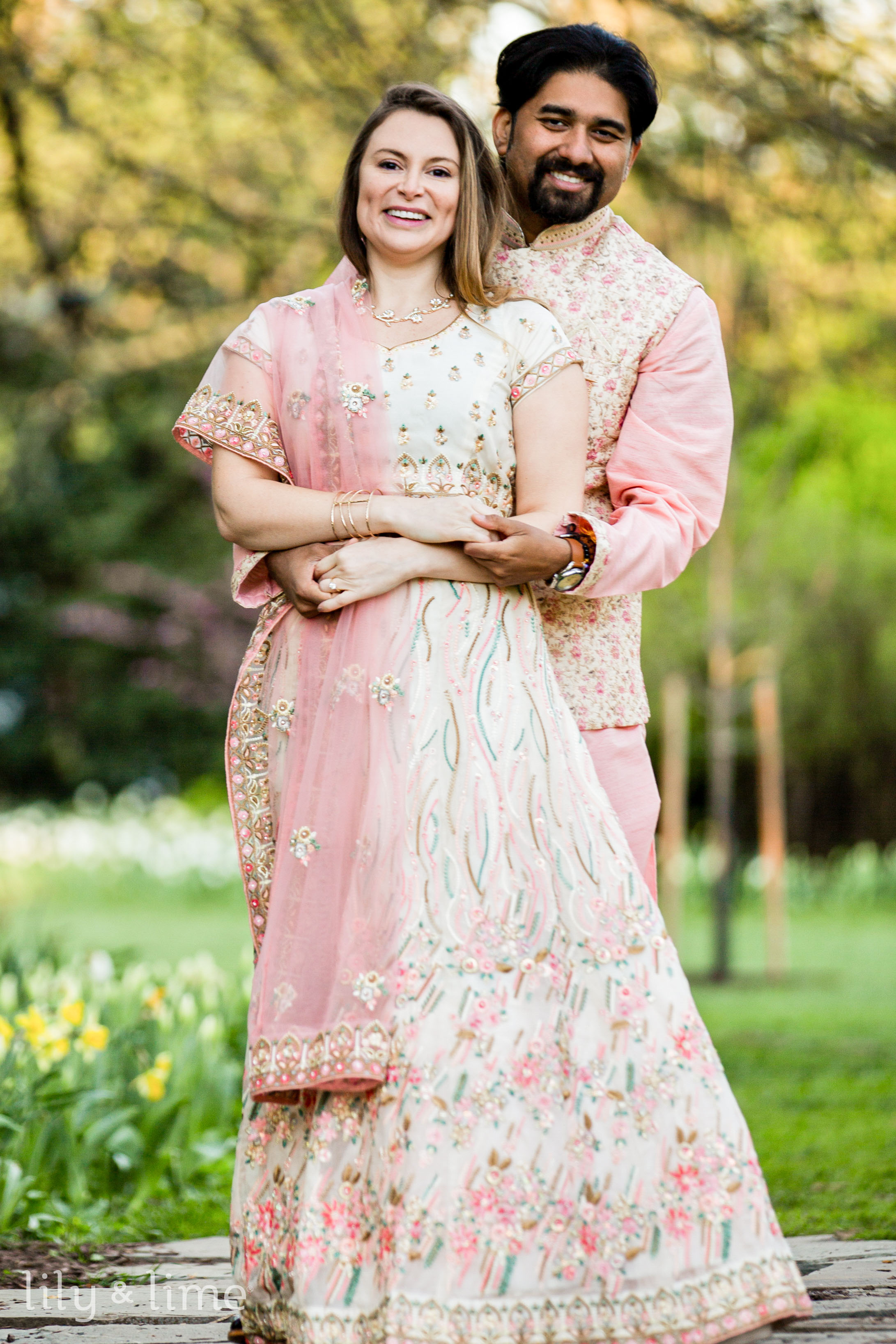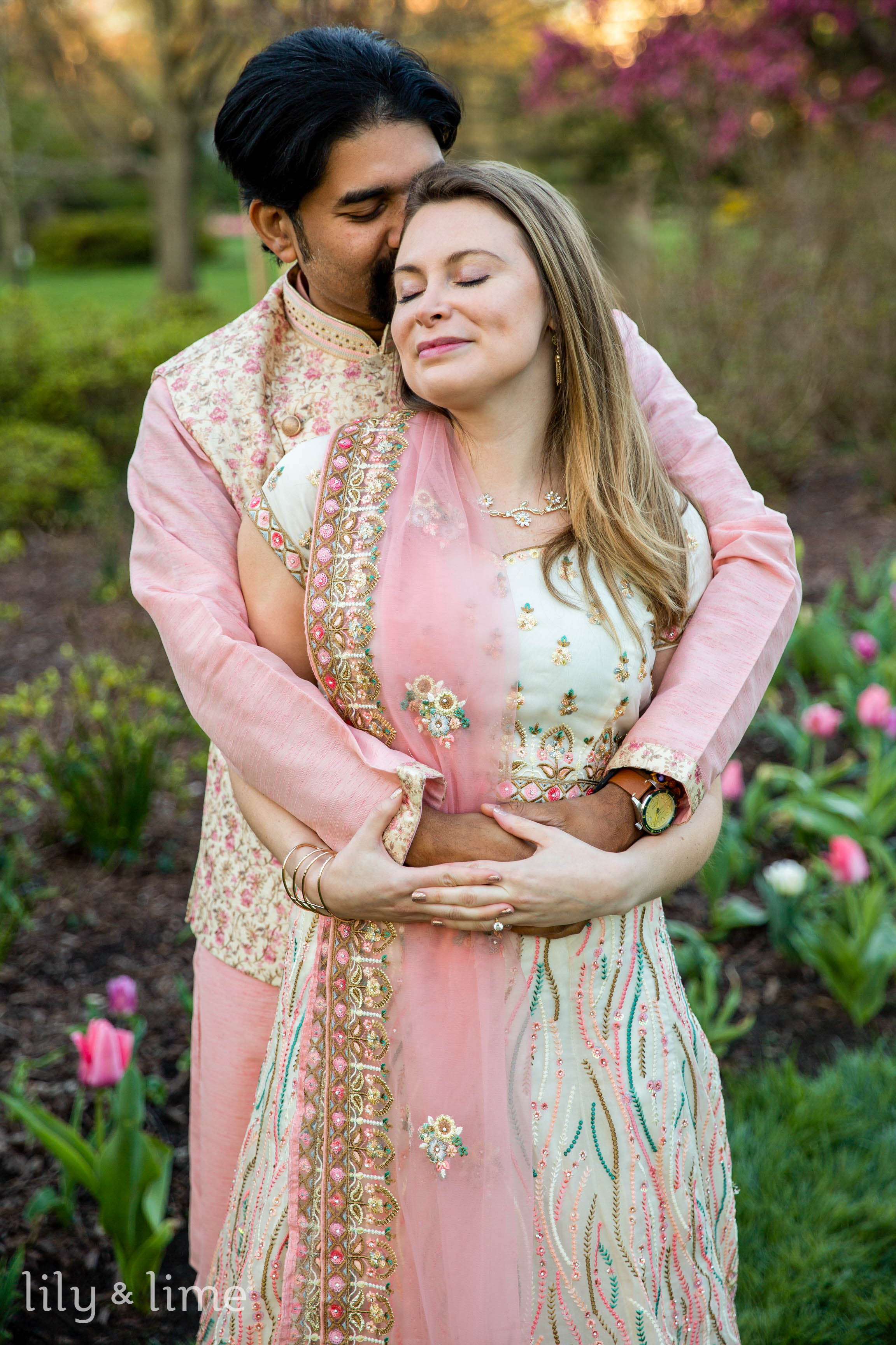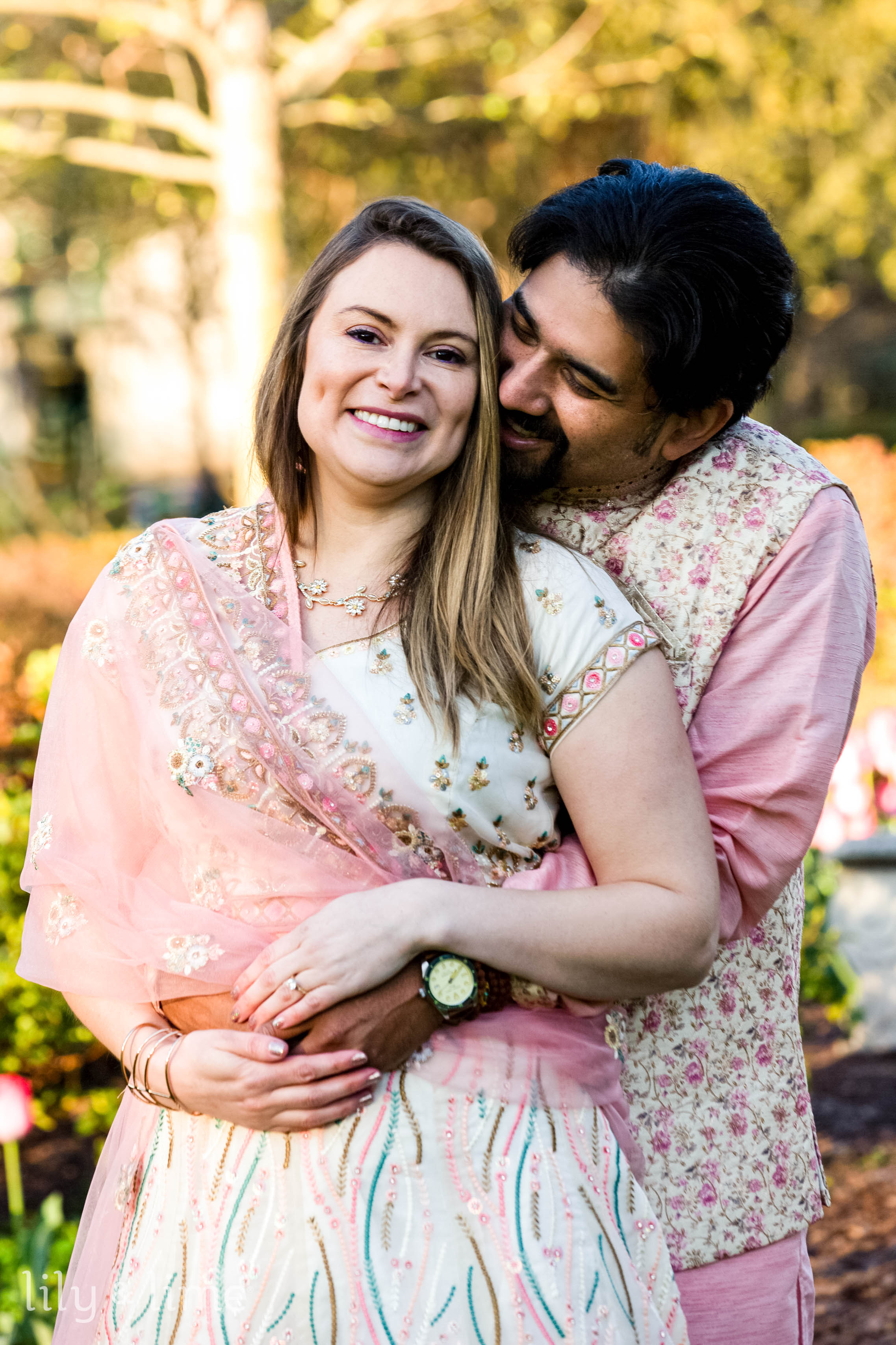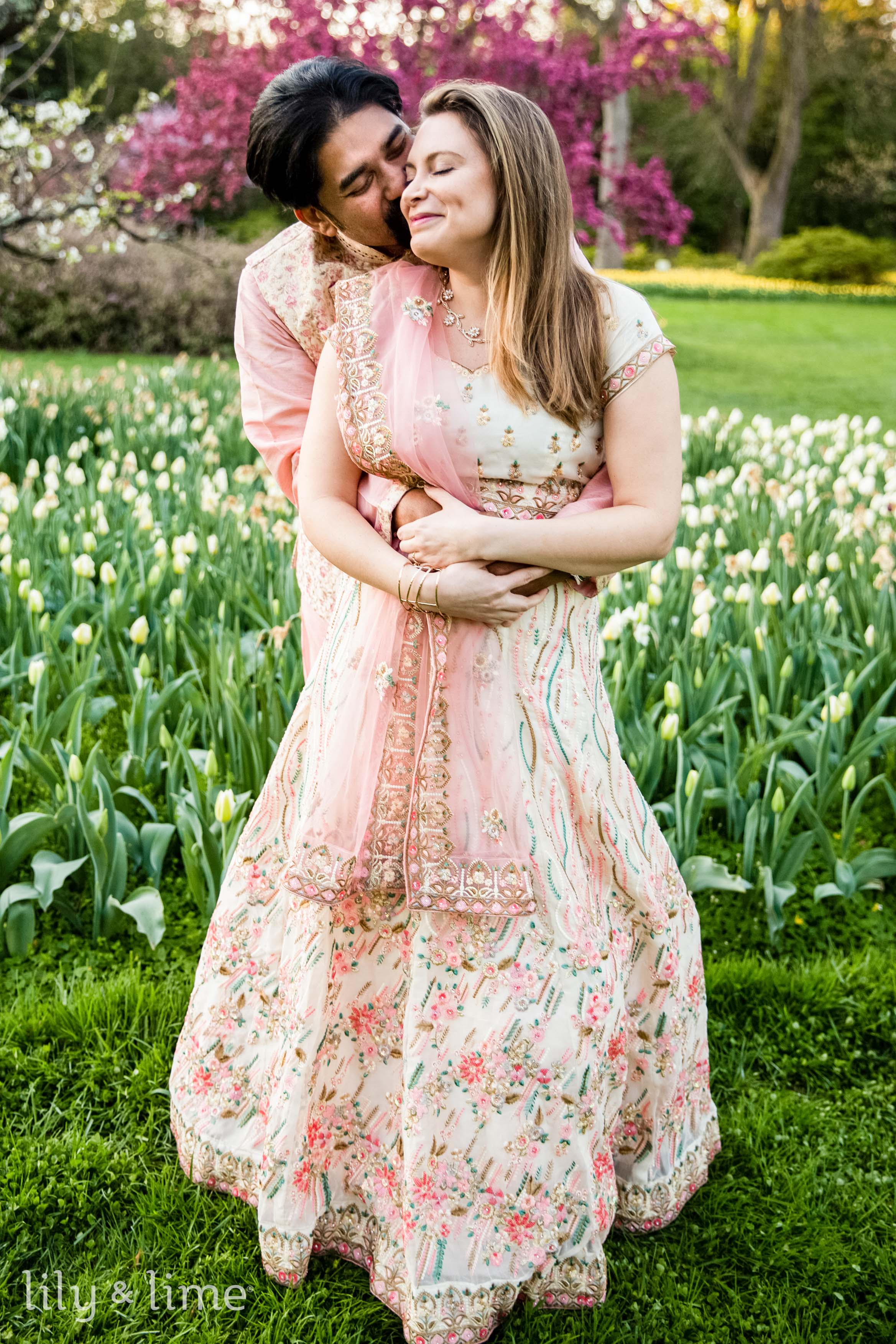 Abhik and Sally’s outdoor engagement photoshoot was a breathtaking blend of love, culture, and the vivid vibrancy of nature. Set against the lush tapestry of a flower-filled garden, their session unfolded like a fairy tale written in blooms and tender glances. The day began with the garden cloaked in the soft, golden light of early morning, casting a serene glow over the myriad of flowers that awaited the couple. Abhik and Sally arrived, looking nothing short of royal in their South Asian attire, their excitement palpable in the crisp morning air. Sally, adorned in a cream lehenga with exquisite pink embroidery and embellishments, looked ethereal. Her pink dupatta fluttered gently in the breeze, a perfect complement to her delicate jewelry and soft, open-flowing hair styled with light engagement makeup. Abhik, her fitting counterpart, wore a pink kurta paired with white pajama pants, over which he draped a floral ethnic jacket, mirroring the garden's bloom.