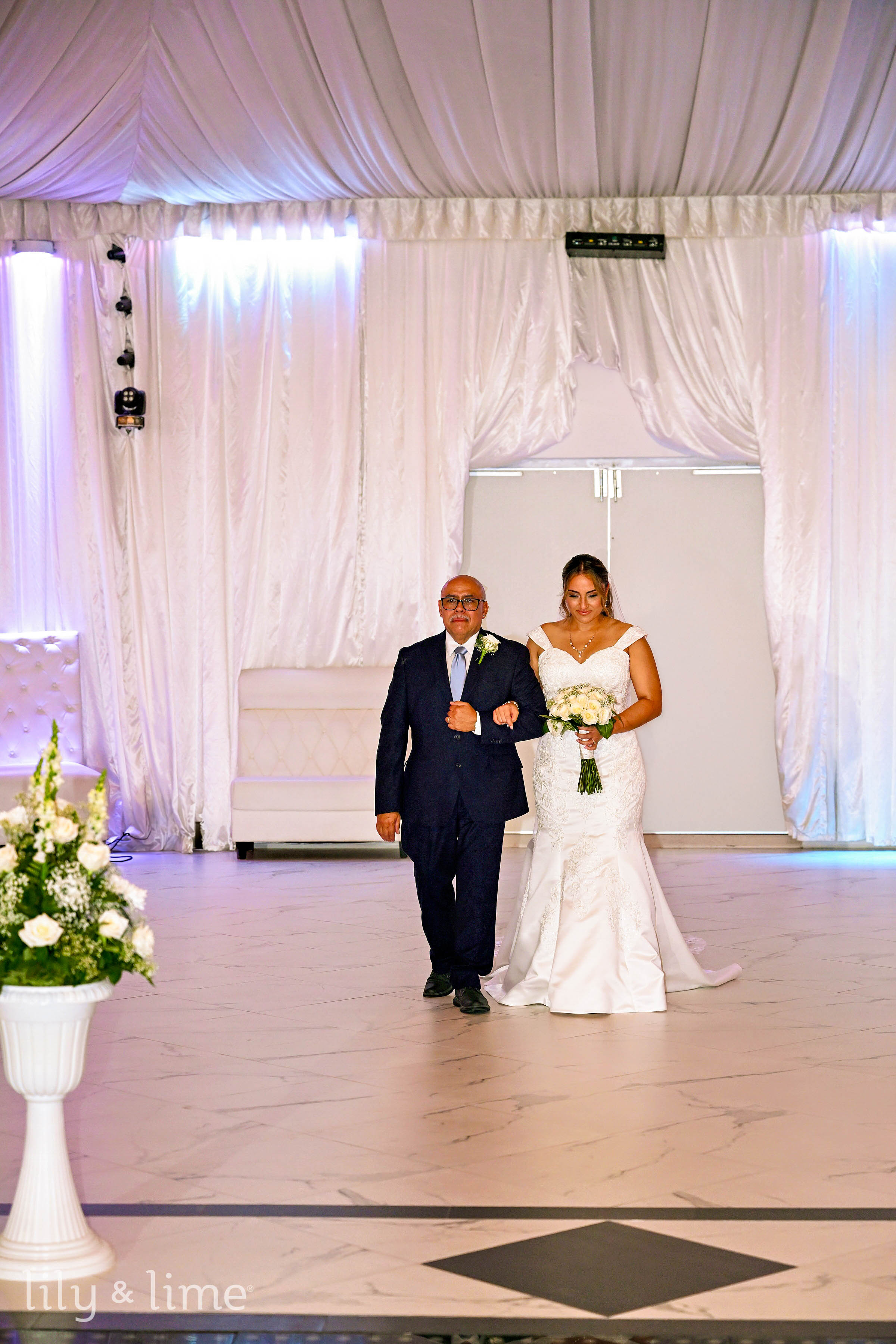The venue’s versatile layout allowed Alicia and Nicholas to effortlessly transition between their ceremony, cocktail hour, and reception without a moment of disruption. The ceremony space, framed by a cascading draped backdrop, set a serene tone as their vows were shared. Later, the reception hall, draped in soft white accents and glimmering lights, became the stage for a night of joy and celebration. Its blend of minimalist allure with decorative touches gave the couple the freedom to imbue every space with their unique style.
