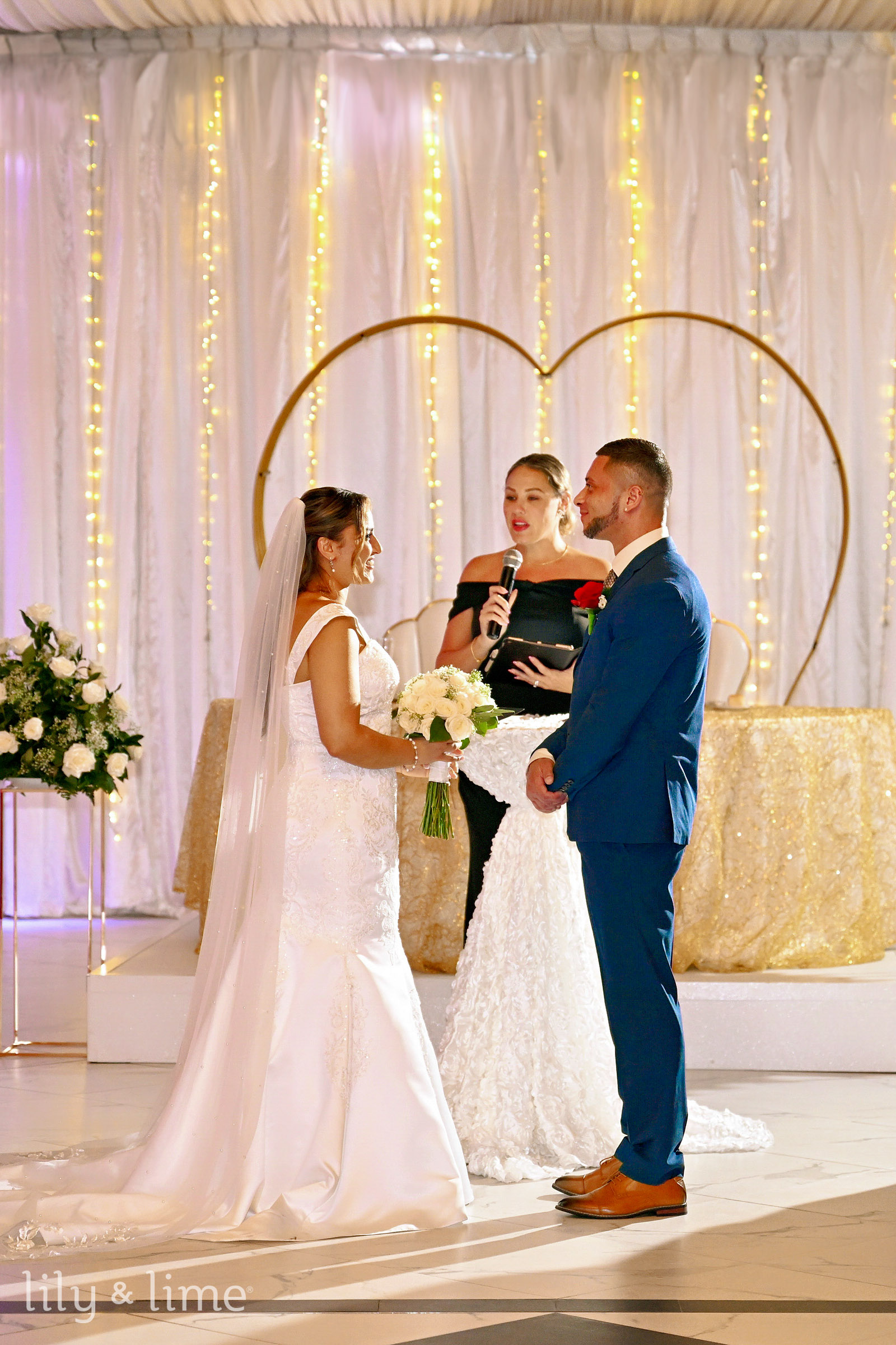 The wedding ceremony itself was a masterpiece of design and sentiment. Held in a stunning indoor venue, it featured elegant drapery, dreamy string lights, a majestic crystal chandelier, and a heart-shaped floral backdrop. The space was bathed in dramatic lighting, creating an ethereal atmosphere. Guests witnessed the heartfelt exchange of vows as their Miami wedding photographers immortalized every tear, glance, and smile.