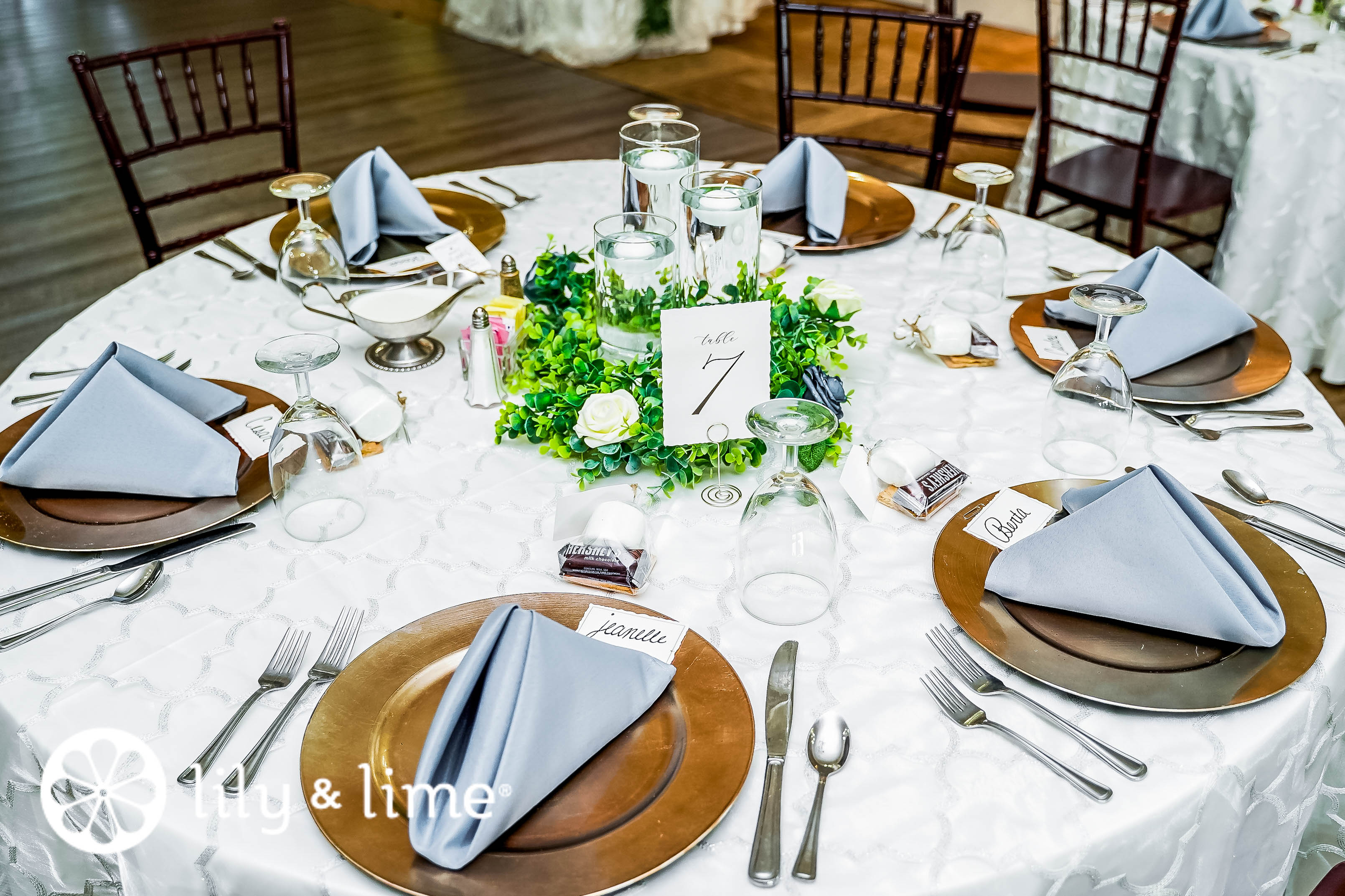 If you are looking to create a dreamy atmosphere- the kind you can only get at an all-white wedding can be created by wedding guests seated at all-white tables and on all-white chairs. For a romantic appearance, drape chairs in white floral garlands that coordinate with the other floral bouquets at the wedding. Add silver chargers and white plates on silky white tablecloths to add layers and textures. White napkins with gold or silver accents can be paired with glittery gold or crystal goblets and place cards. Crystal candlesticks can be strewn across the tables, adding a gleam to the otherwise all-white wedding reception table setting.