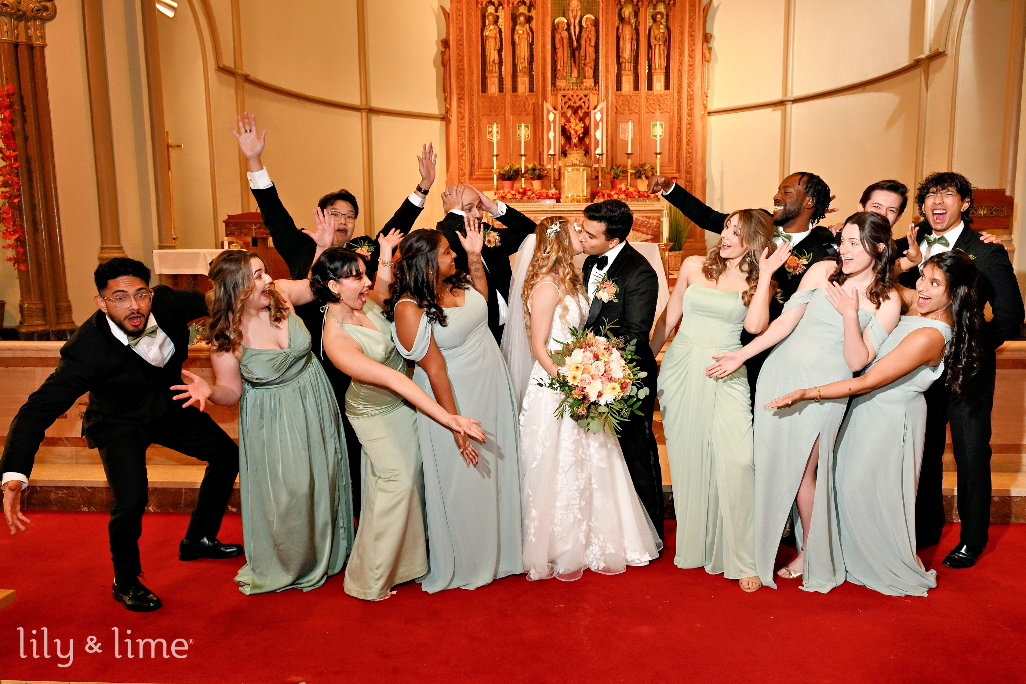 The wedding ceremony took place in a breathtaking church venue, where every detail added to the romantic ambiance. The wooden interiors and stained glass windows bathed the space in warm, colorful light, while the wedding aisle was adorned with pink florals and lush greenery. The floral arrangements added a soft, romantic touch to the sacred space. As Alyson walked down the aisle, emotions ran high, and the heartfelt vows exchanged between the couple were beautifully captured in emotional wedding ceremony photographs.