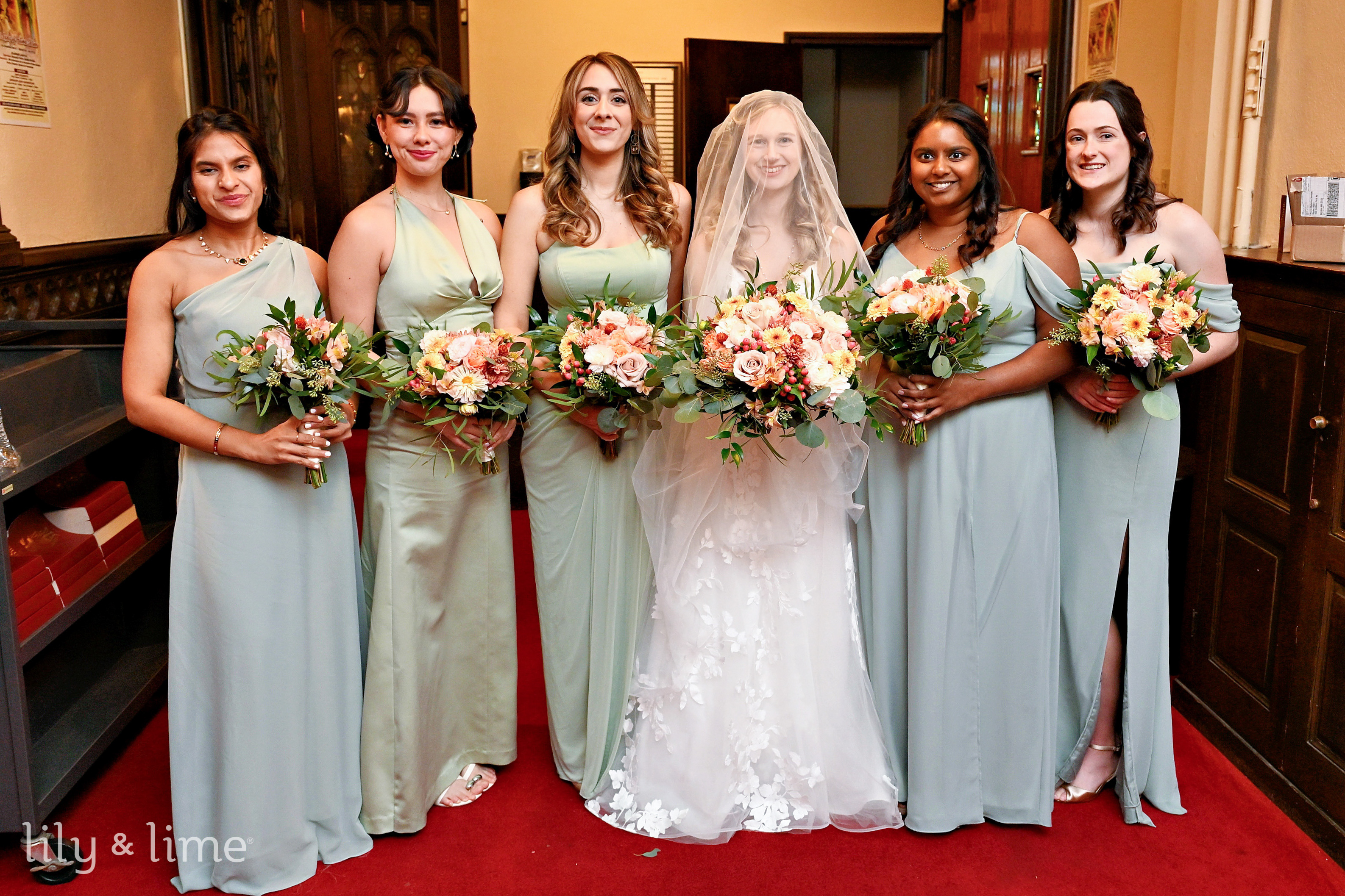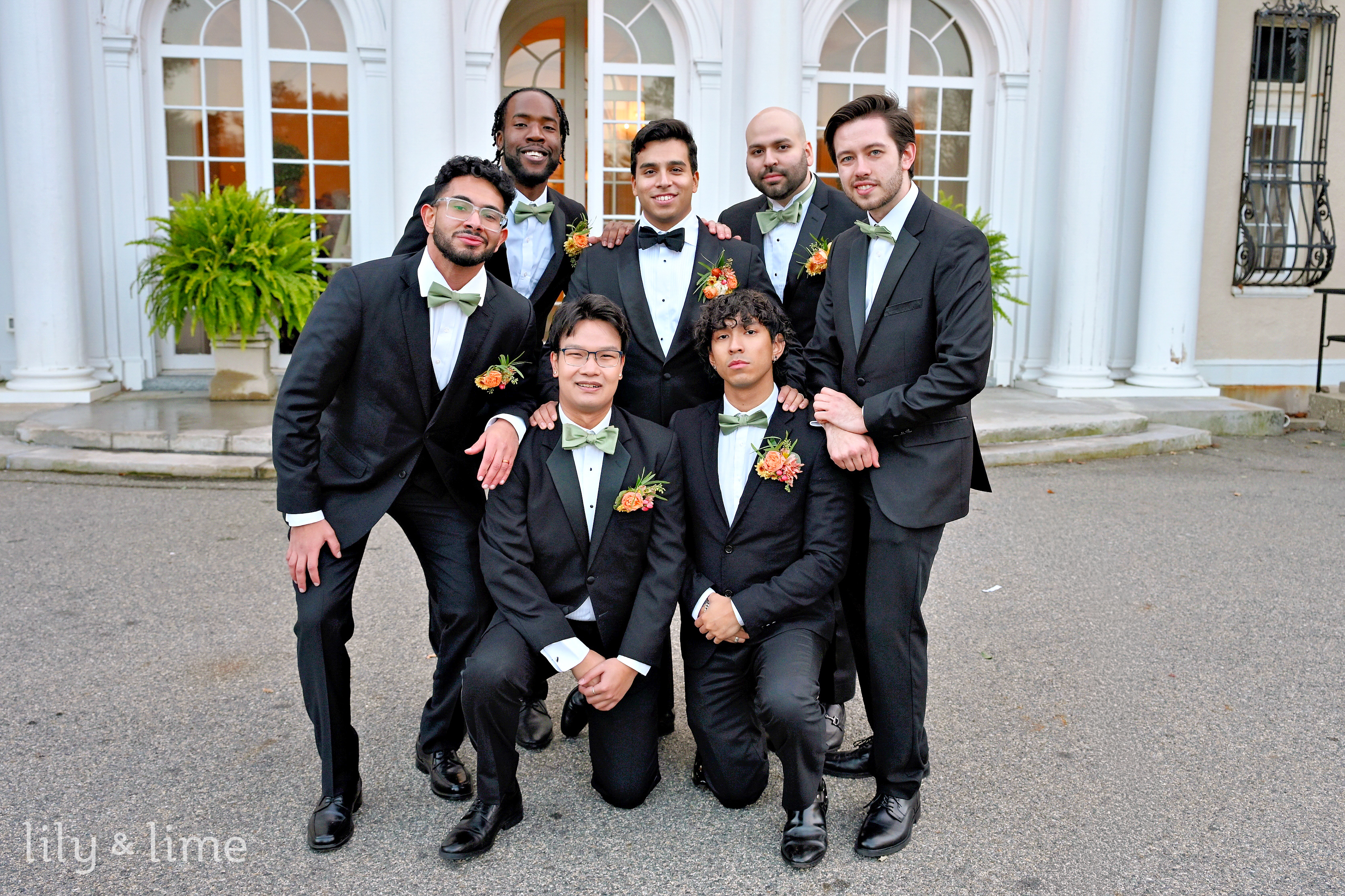 Meanwhile, Carlos exuded charm and confidence in his dapper two-piece black wedding suit. Paired with a crisp white formal shirt, shiny black shoes, a black silk bowtie, and a peach rose boutonniere, his ensemble was the epitome of classic wedding style. The wedding party’s attire harmonized beautifully with the couple’s look. The bridesmaids wore stunning green dresses and carried matching peach and white bouquets, while the groomsmen donned stylish black suits with green bowties, creating a cohesive and elegant aesthetic.