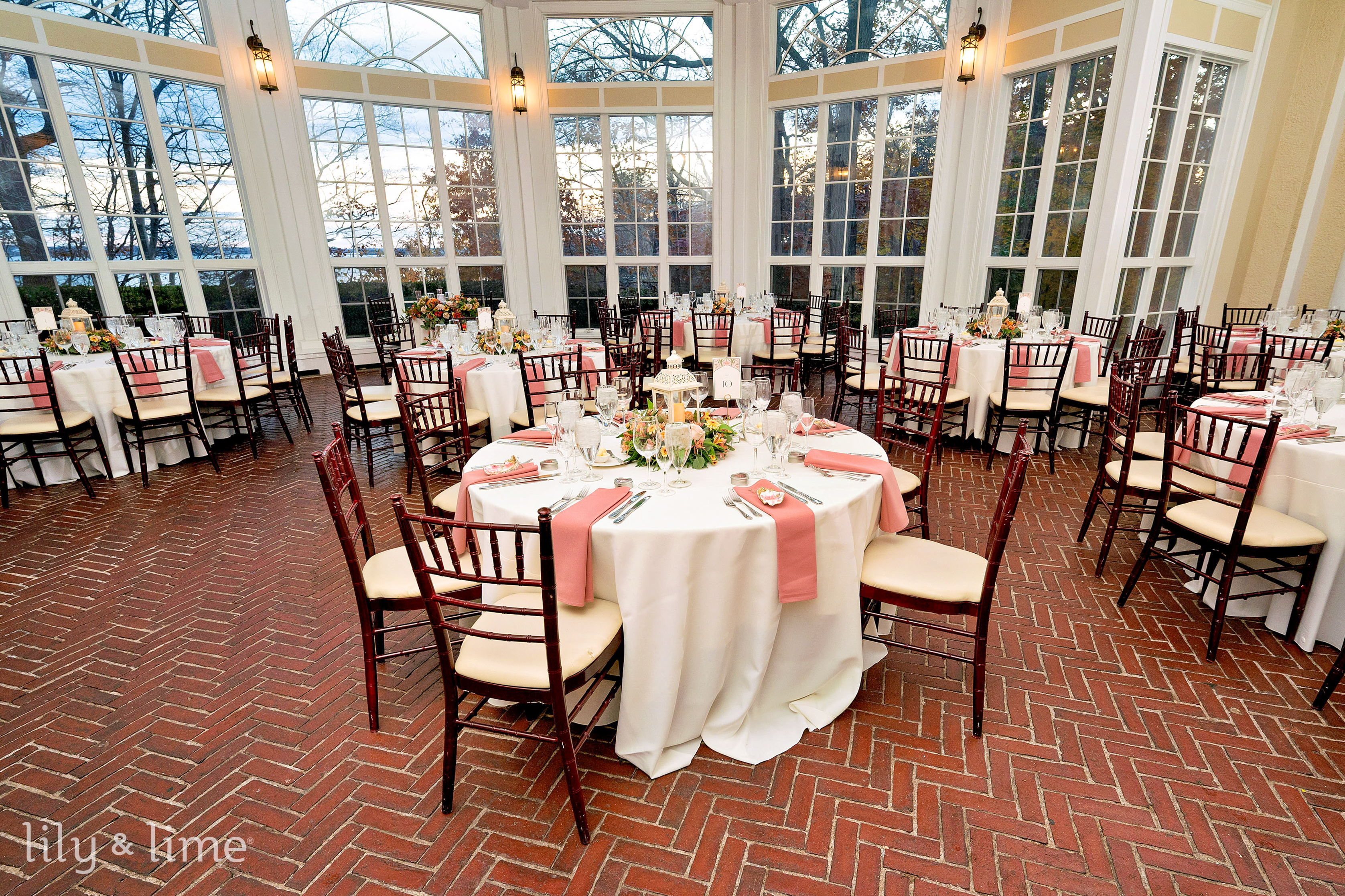 The celebration continued with an elegant indoor reception that was nothing short of enchanting. The venue featured vintage book collections in the library, a roaring fireplace, and a sparkling crystal chandelier that added a touch of old-world charm. The tables were adorned with white and pink settings, accented by pink floral arrangements and greenery details, creating a warm and inviting atmosphere.