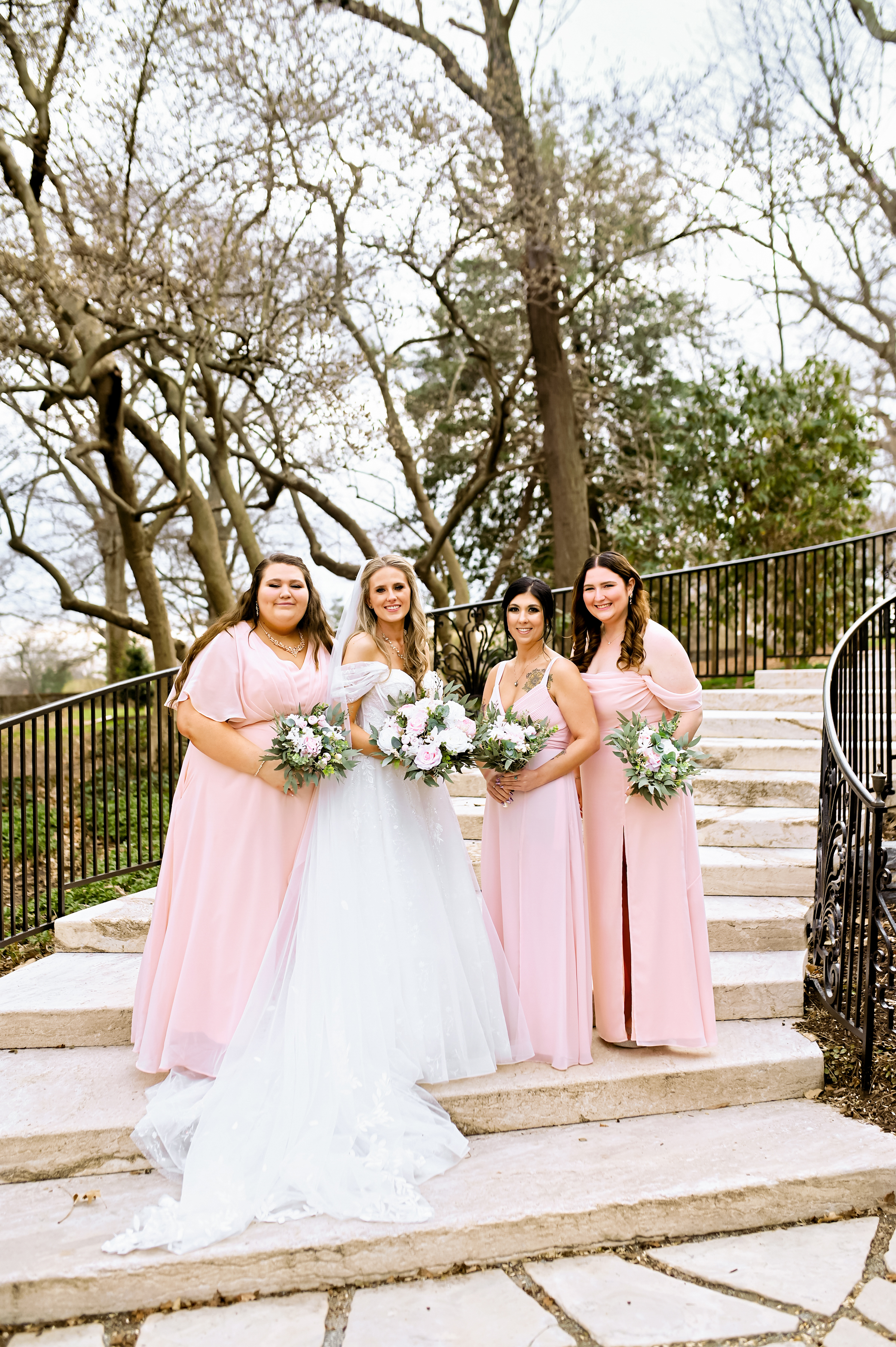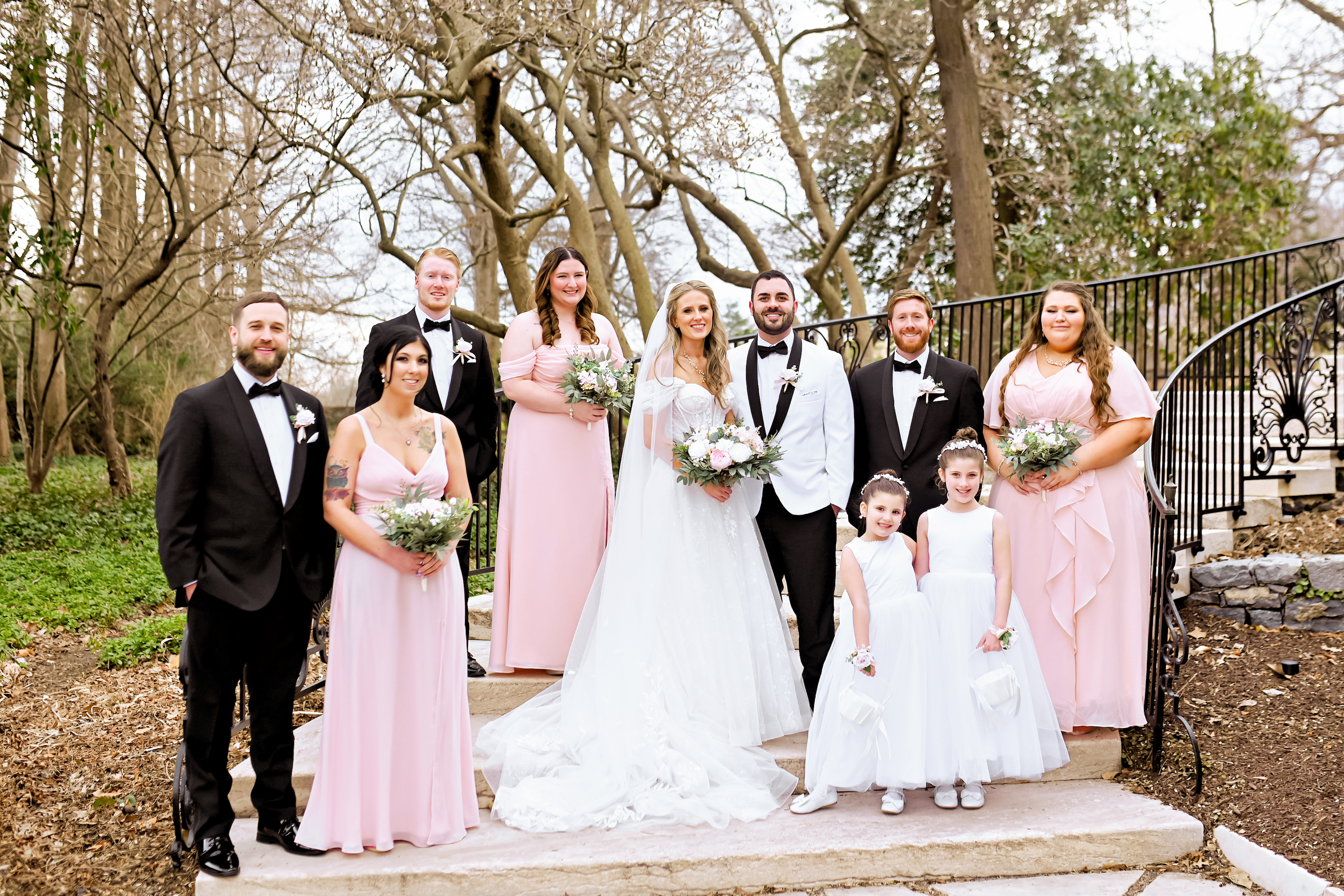 Anthony looked equally striking, ready for his big day in a completely dapper white tuxedo paired with a crisp white formal shirt, shiny black shoes, a black silk bowtie, and a white rose boutonniere. The wedding party attire perfectly complemented the couple, with the women dressed in pastel powder pink bridesmaid dresses carrying small wedding bouquets, while the men wore stylish black wedding suits.