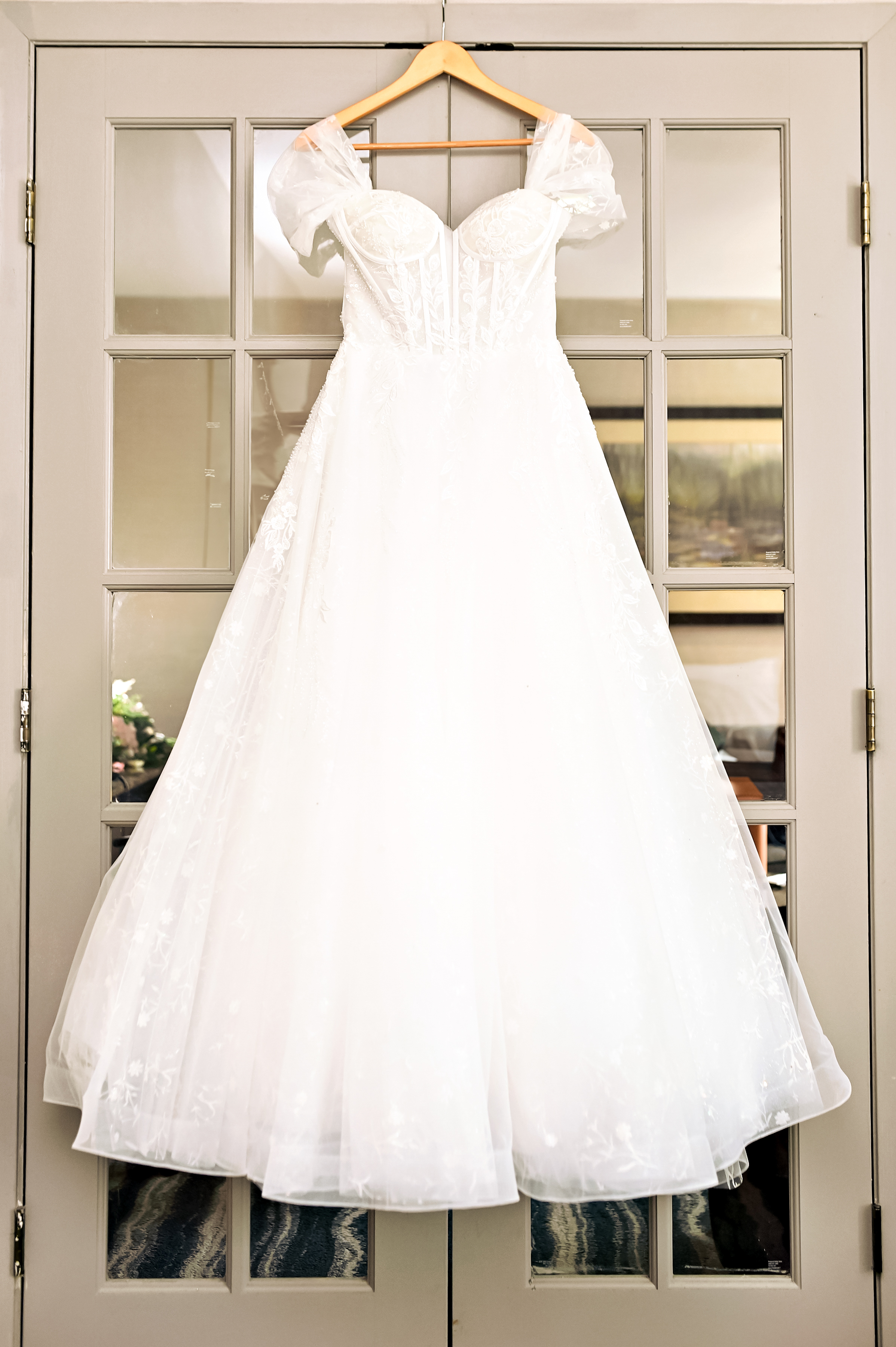 When it was time to dress, Ashley stunned everyone in a chic corset wedding dress featuring detachable off-the-shoulder sleeves, intricate crystal appliques, and a classic buttoned-down back. She completed her bridal look with an elegant open hair hairstyle, a cathedral-length veil, neutral bridal makeup, and a beautiful pastel wedding bouquet.