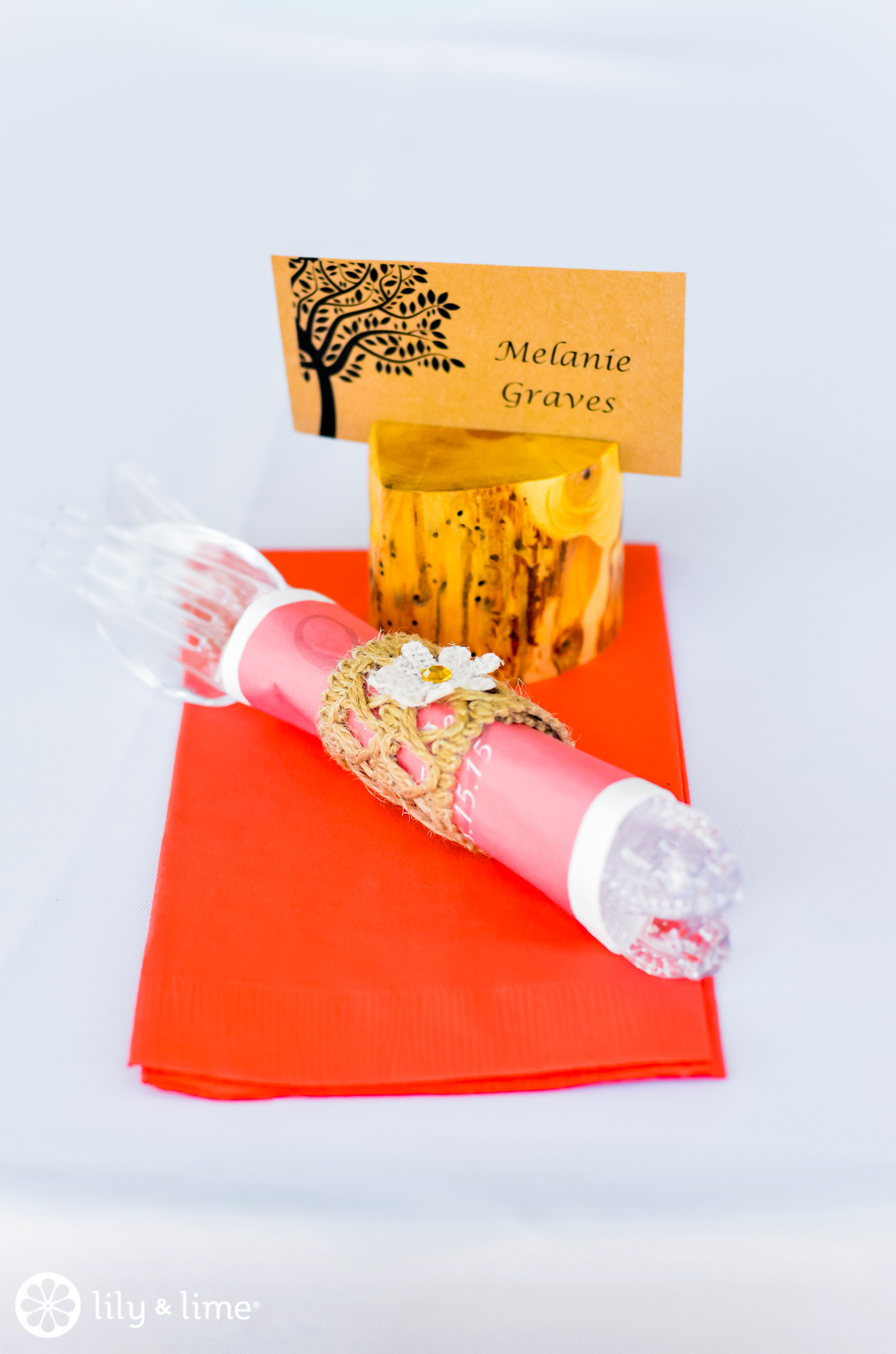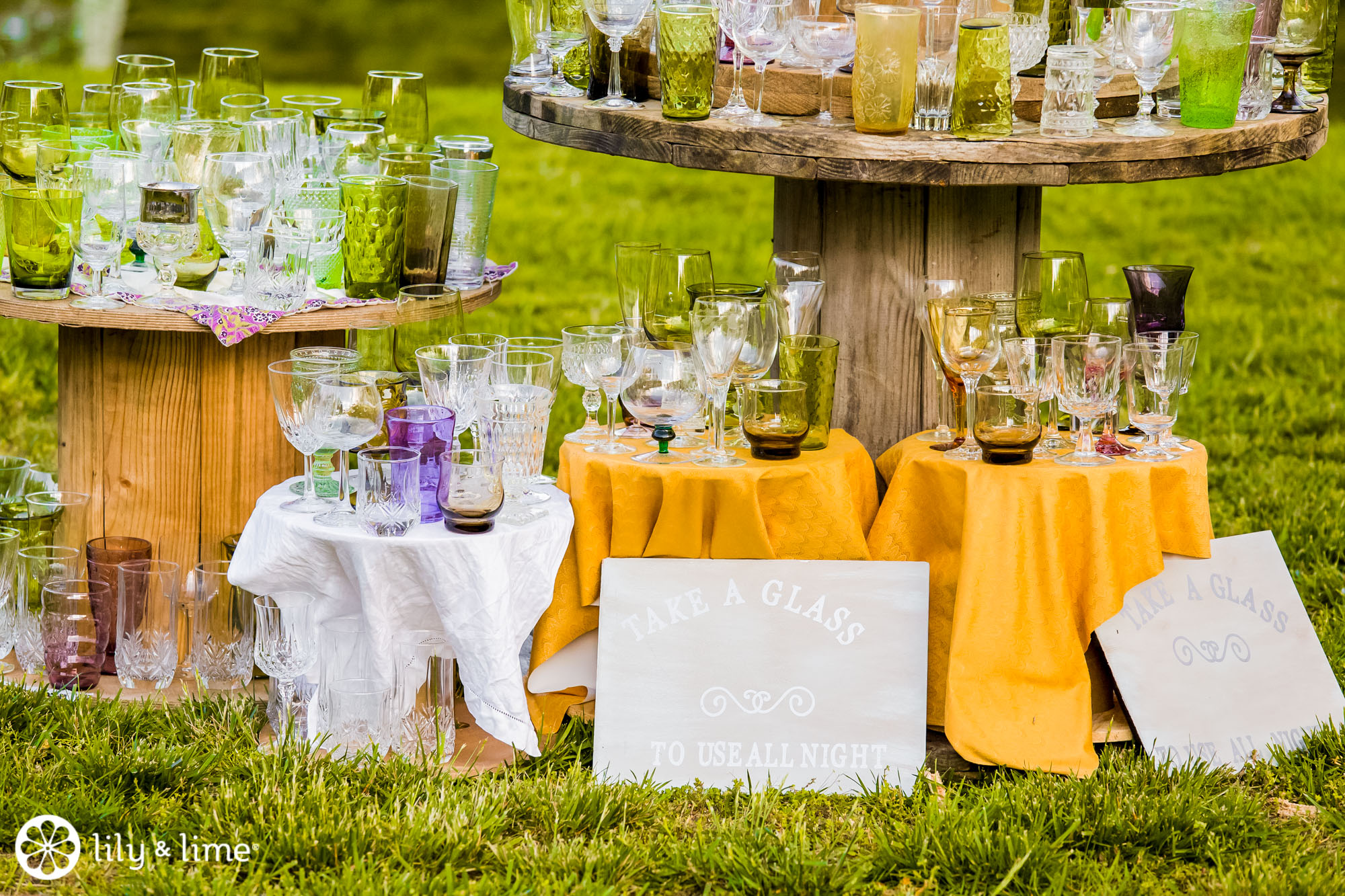 Mixed glassware on the tables adds a fun, eclectic look, and you can use them as favors for the guest. With a backyard barbecue, you can opt for plastic cutlery to cut down on rental costs. We also love the idea of mix-and-match place settings.
