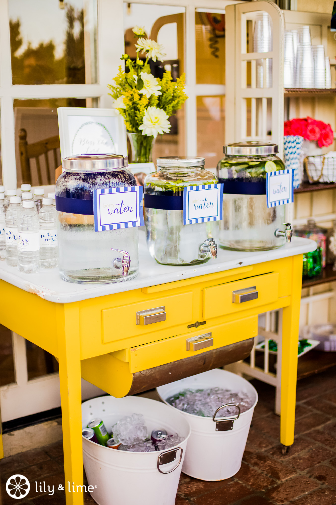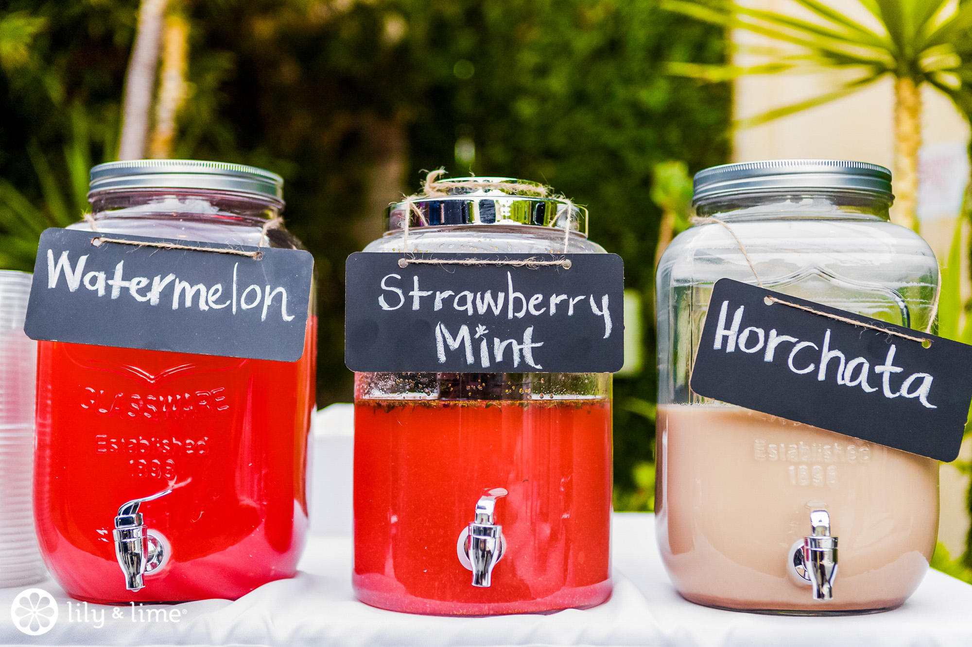 We love that the details of backyard weddings are usually quaint and focused on friends and family. For a fresh approach to beverage service, self-serve libations can be prepared ahead of time, and then guests can choose what they want to drink all night.