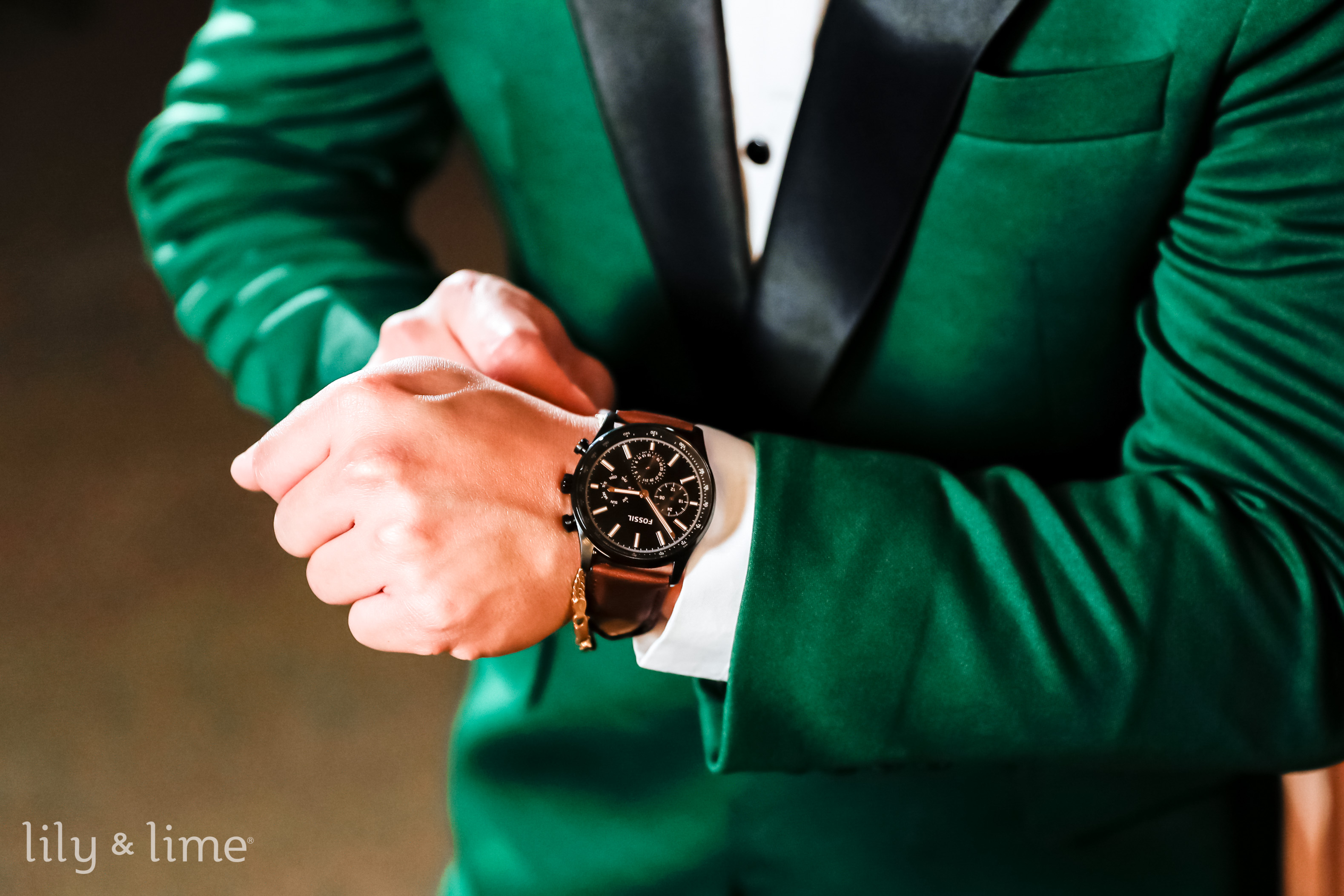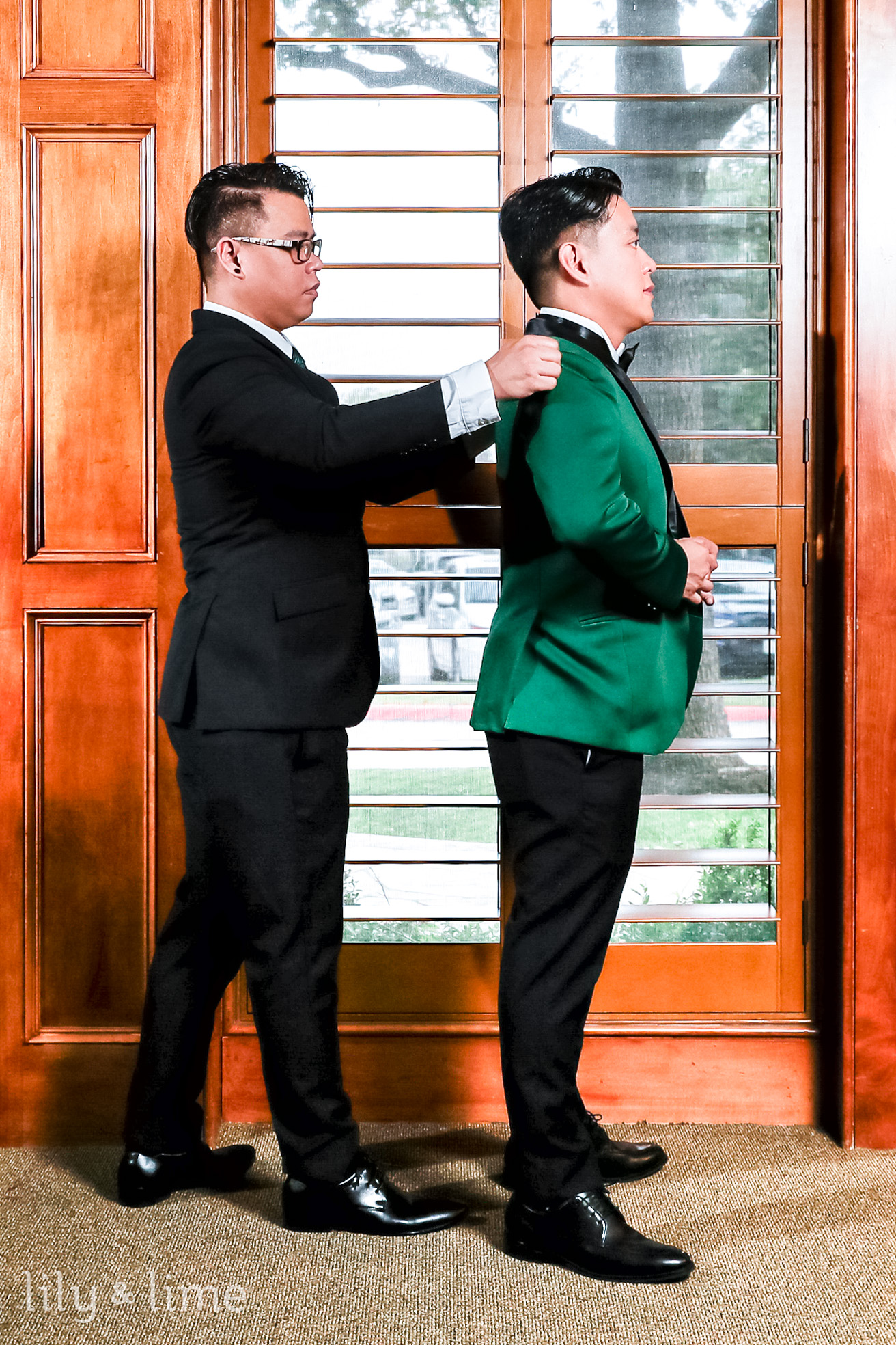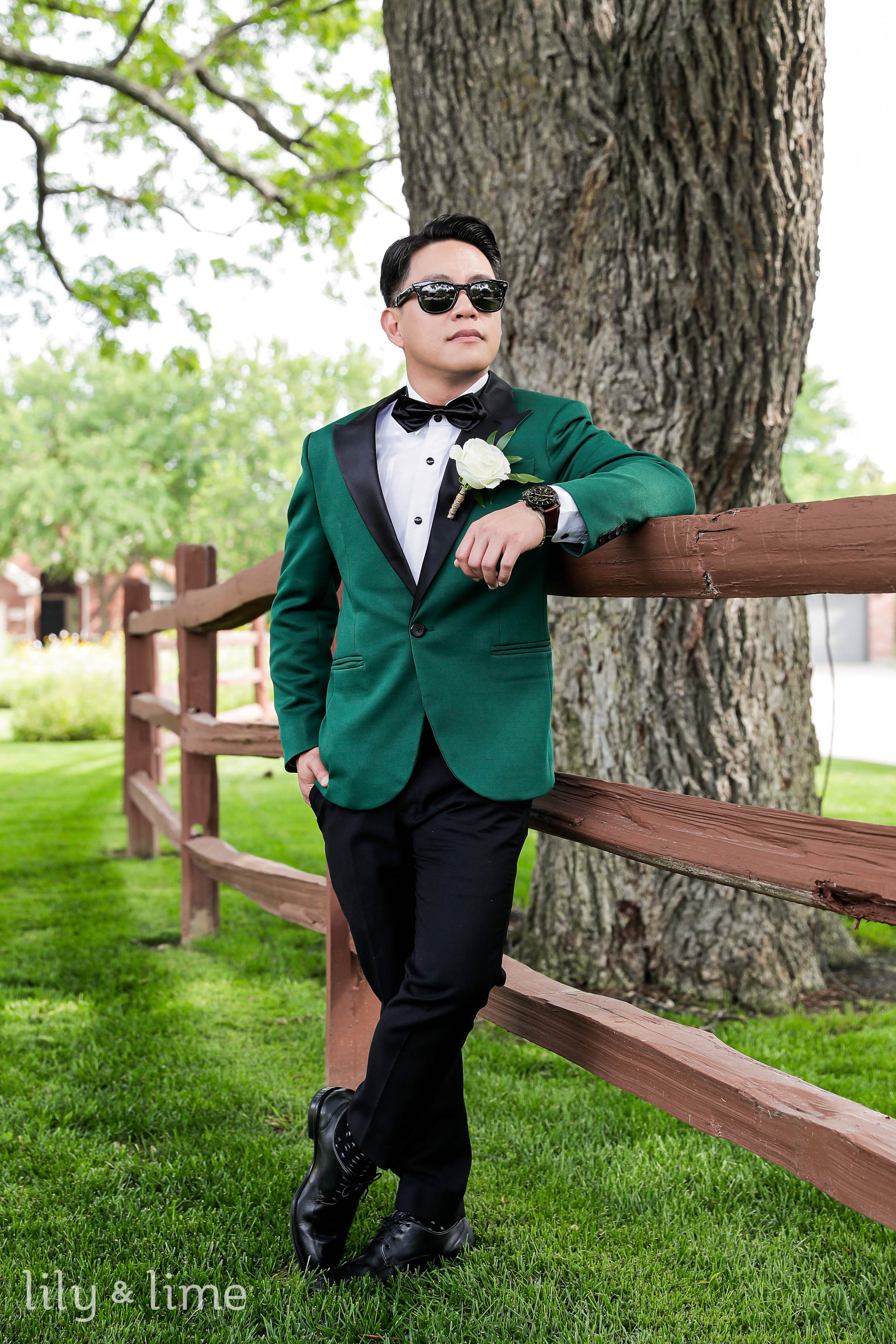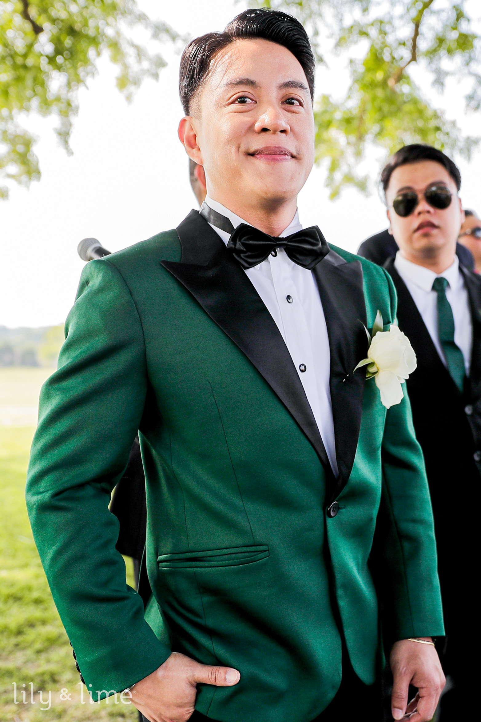 Meanwhile, Tristan prepared for the big day, exuding charm in a vibrant groom tuxedo idea in green paired with a crisp white formal shirt. His ensemble was perfected with shiny black shoes, a sleek black silk bow tie, and a classic white rose boutonniere, epitomizing the dapper groom ready to meet his bride.