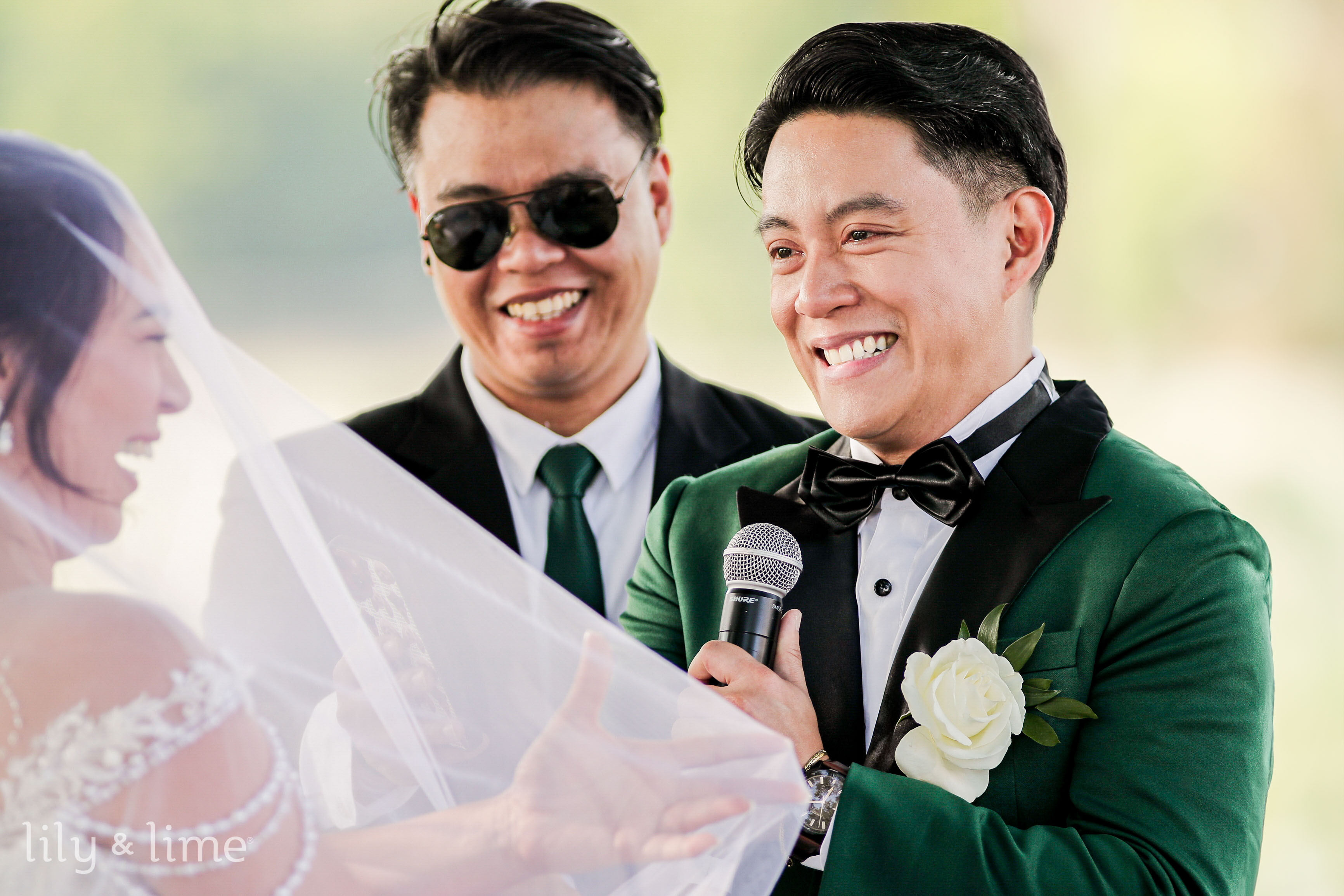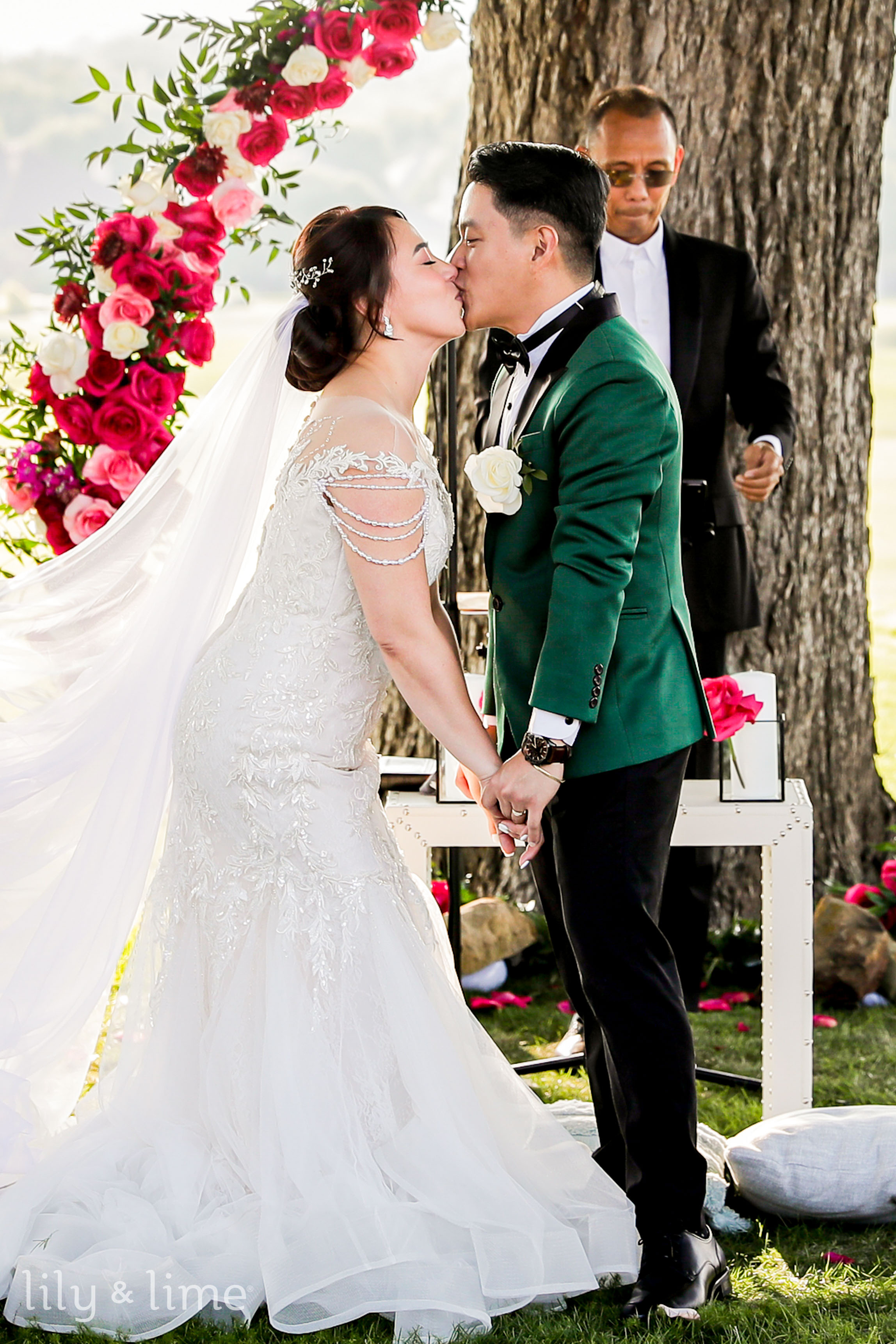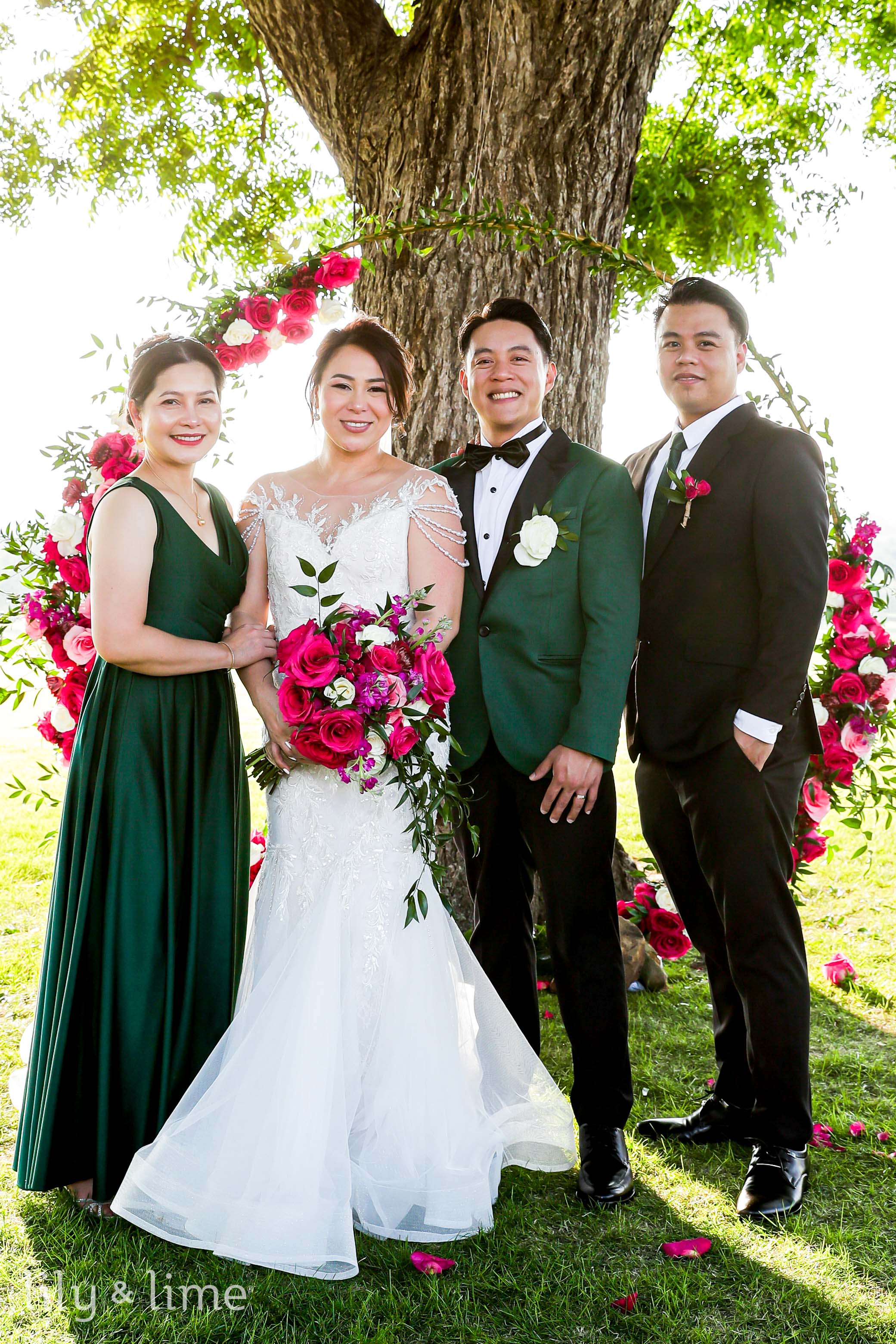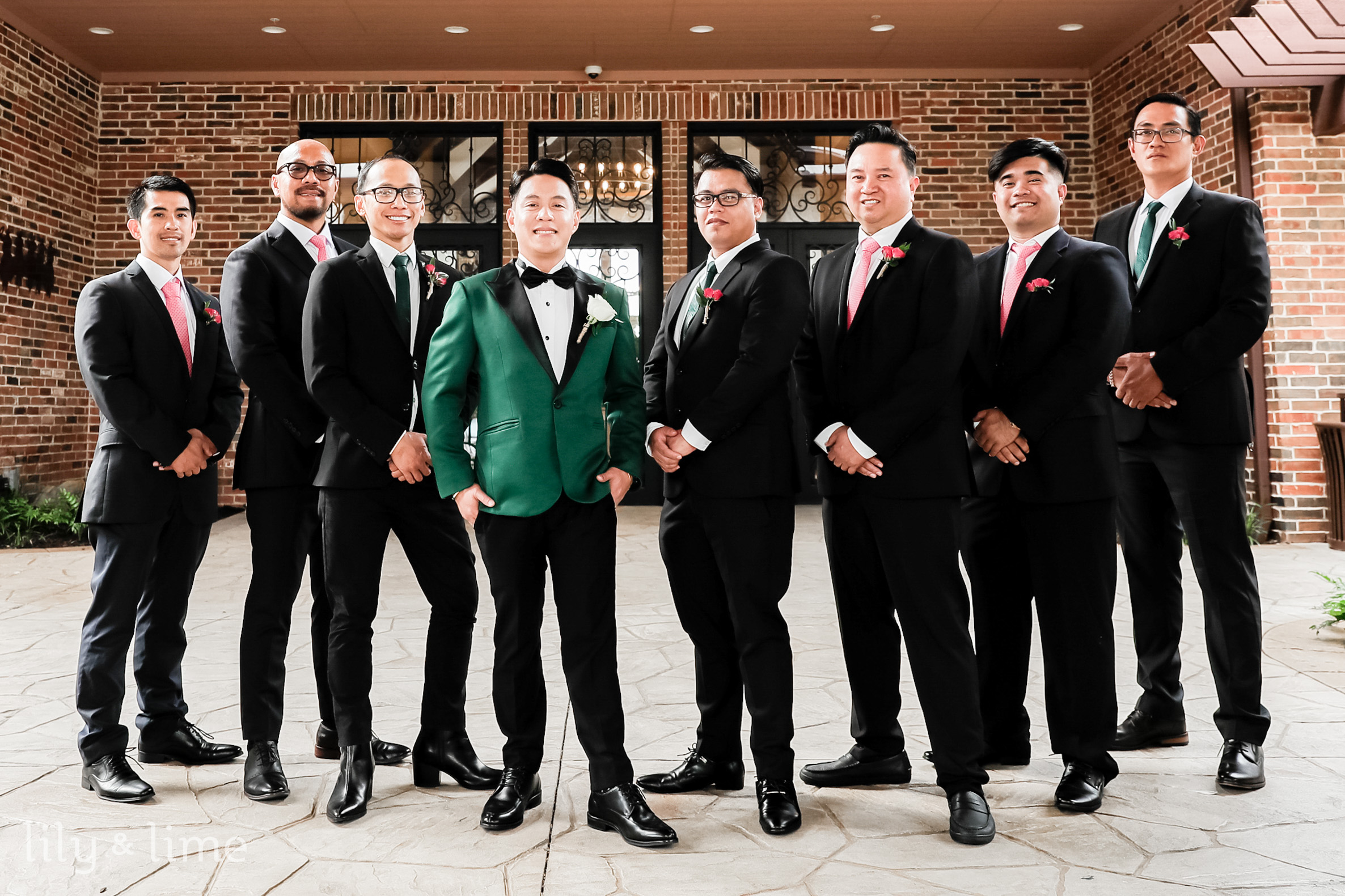 Meanwhile, Tristan prepared for the big day, exuding charm in a vibrant groom tuxedo idea in green paired with a crisp white formal shirt. His ensemble was perfected with shiny black shoes, a sleek black silk bow tie, and a classic white rose boutonniere, epitomizing the dapper groom ready to meet his bride.