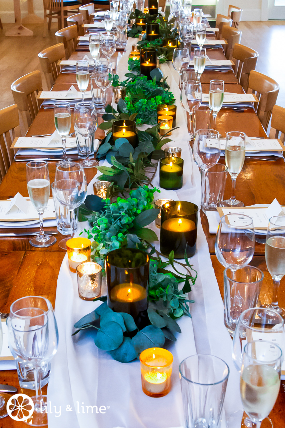 A cozy tablescape: What is more perfect on a winter evening than a warm cozy meal shared with your close ones? The glow of the candles to add to the hygge atmosphere, of course! Host your wedding reception at a rustic long table with your close ones all on the same table, with simple frosted greenery and tapered candles forming the most perfect wedding tablescape. You can add your elements to the tablescape keeping in mind the wedding colors and your wedding theme! Play off the reflection of the candles by adding in mirror trays and mercury glass votive holders.