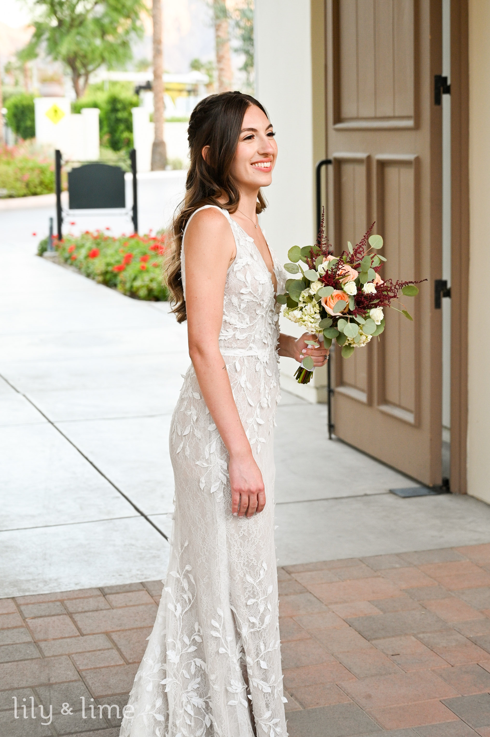The wedding day of Carolina and Preston in Palm Springs unfolded like a meticulously curated story, each chapter brimming with details that bespoke their love and care. The morning air was charged with anticipation as Carolina began her transformation into a bride. She stepped into her creamy white wedding dress, the floral appliqué, plunging neckline, and illusion details melding to form a vision of elegance and grace. Her look was completed with a braided hairstyle, interwoven with flowers, minimal makeup, and a bridal bouquet rich in hues of peach, burgundy, and greenery—a picturesque start to a day full of promise.