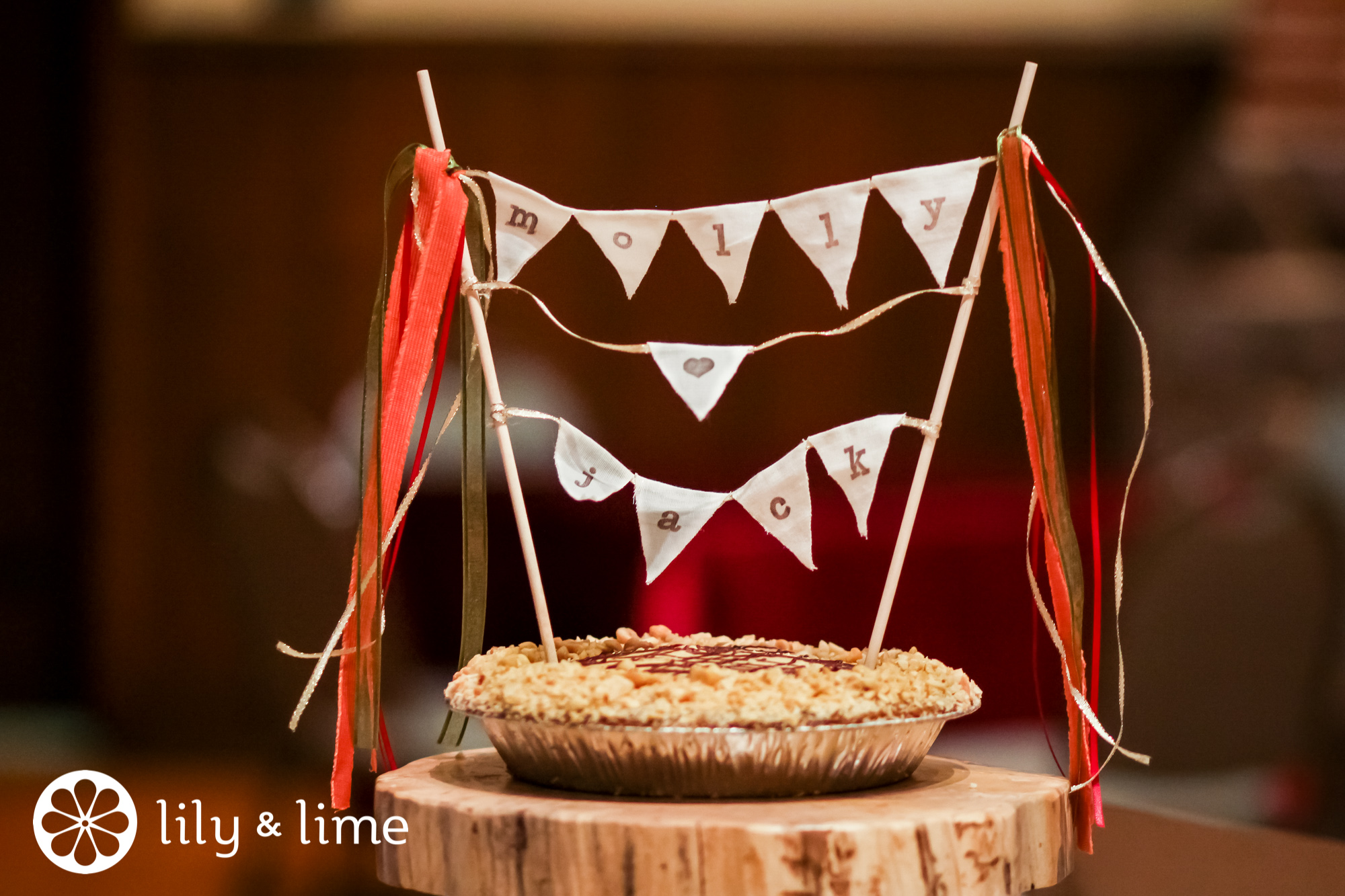 Although pie is perfectly perfect on its own, you may want to dress it up a bit if you plan to do a traditional “cake” cutting at your reception. Any topper meant for a wedding cake will work just as well sitting atop a pie. As always, Etsy is a treasure trove of pure dessert decor goodness.