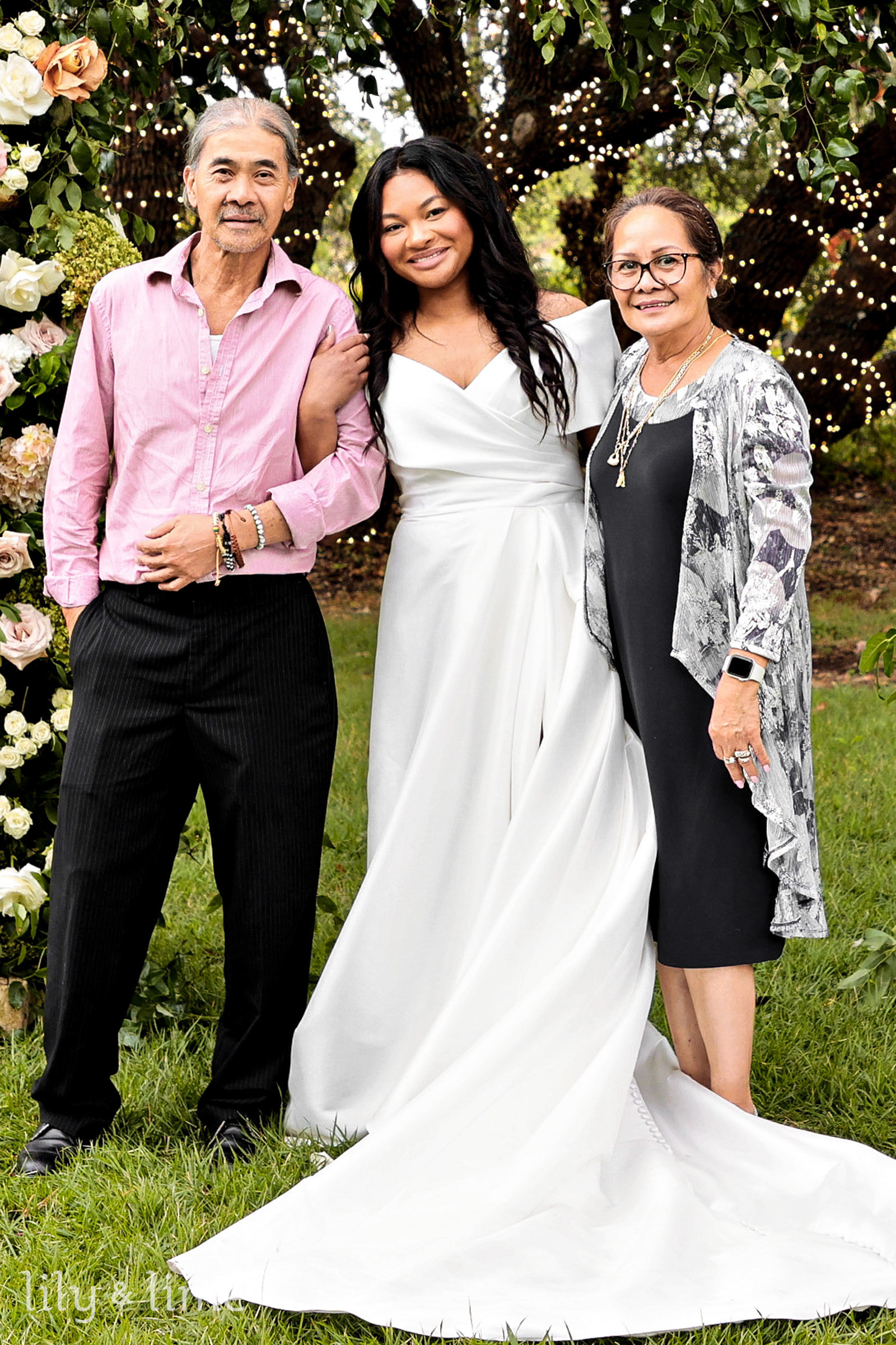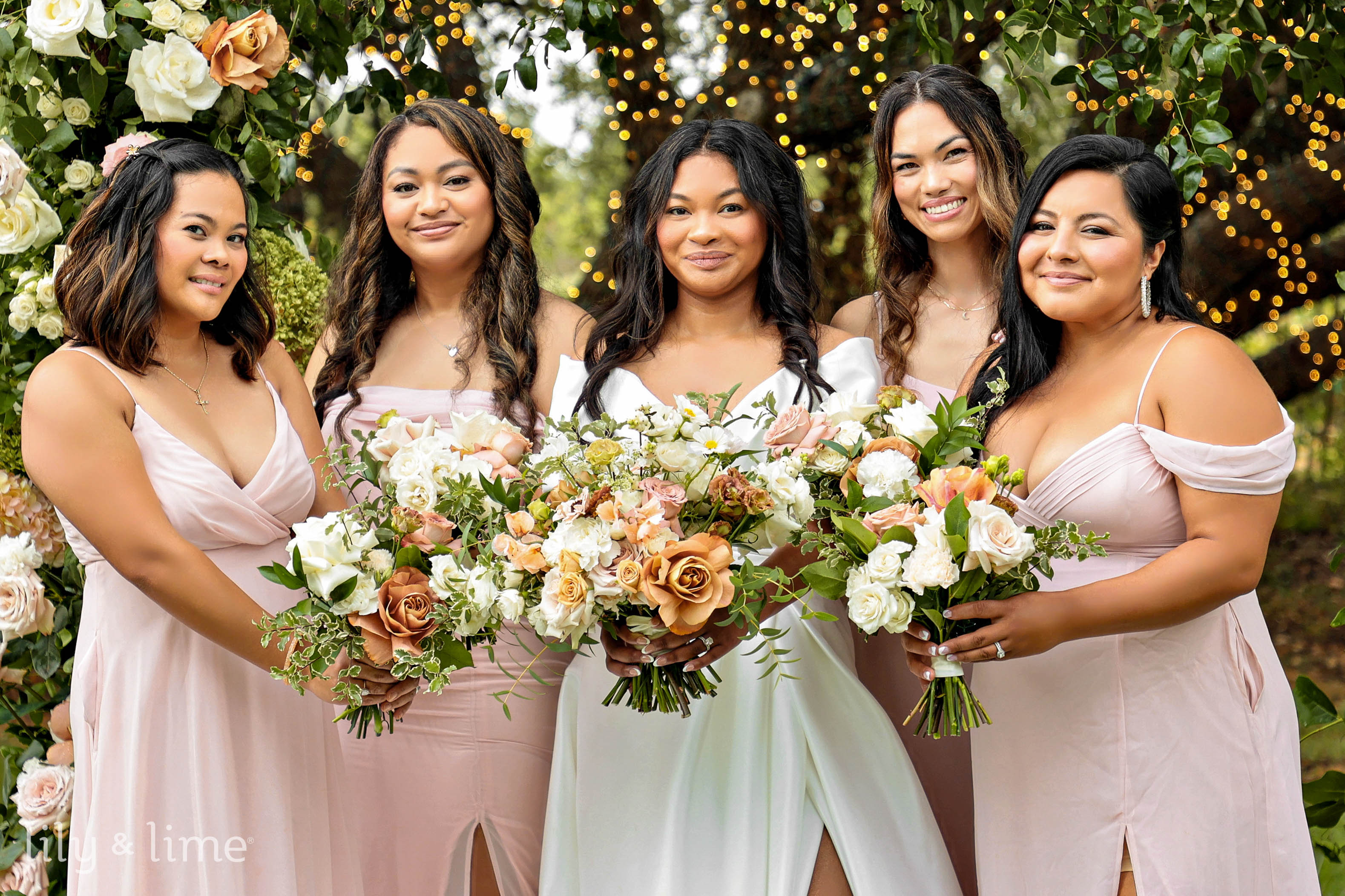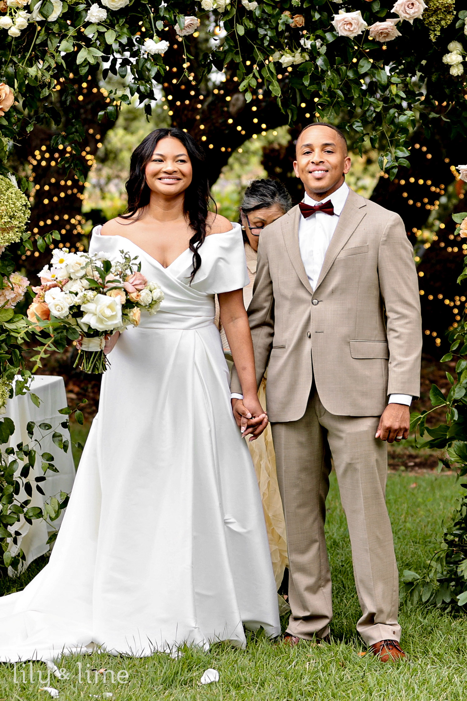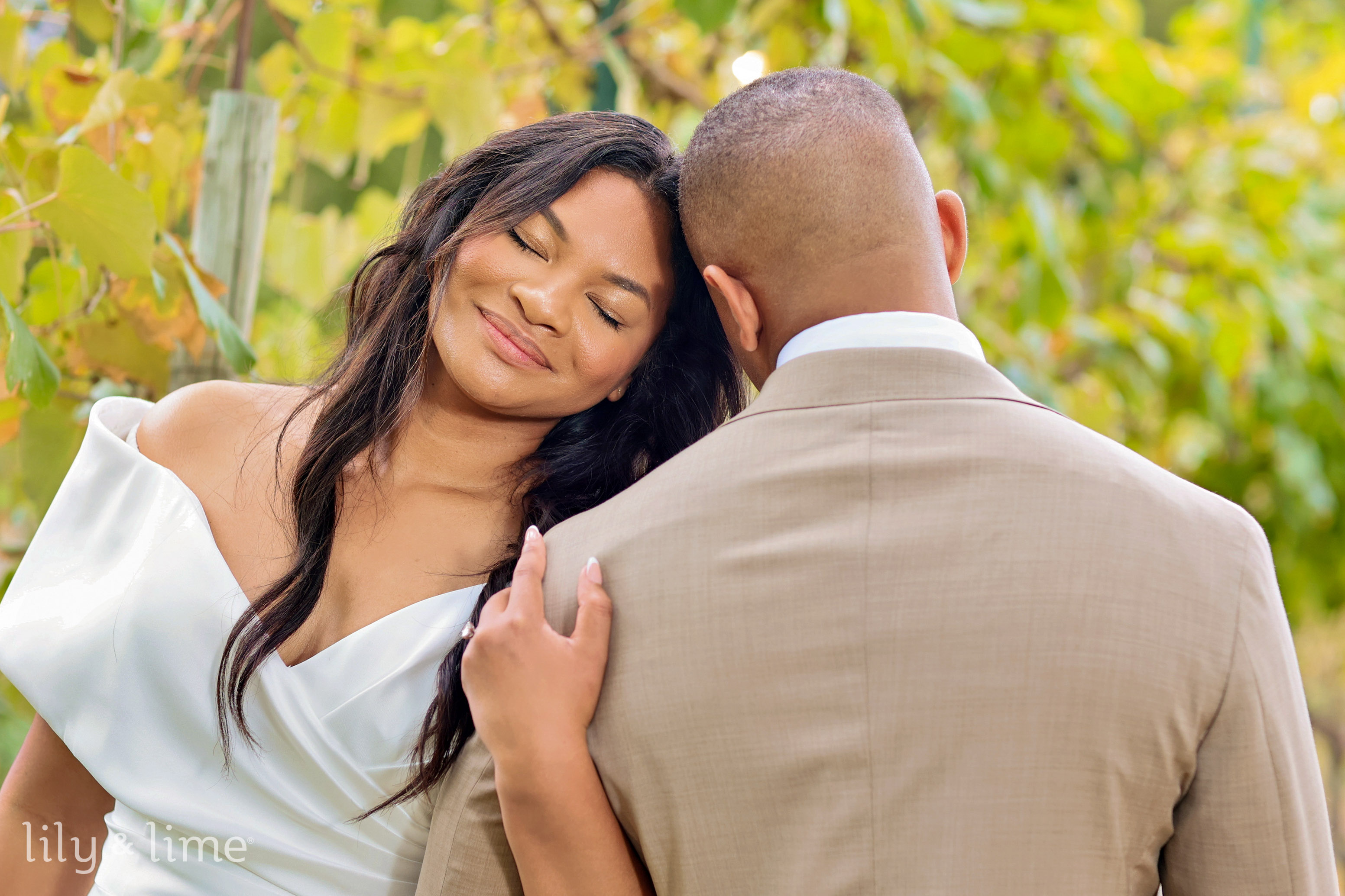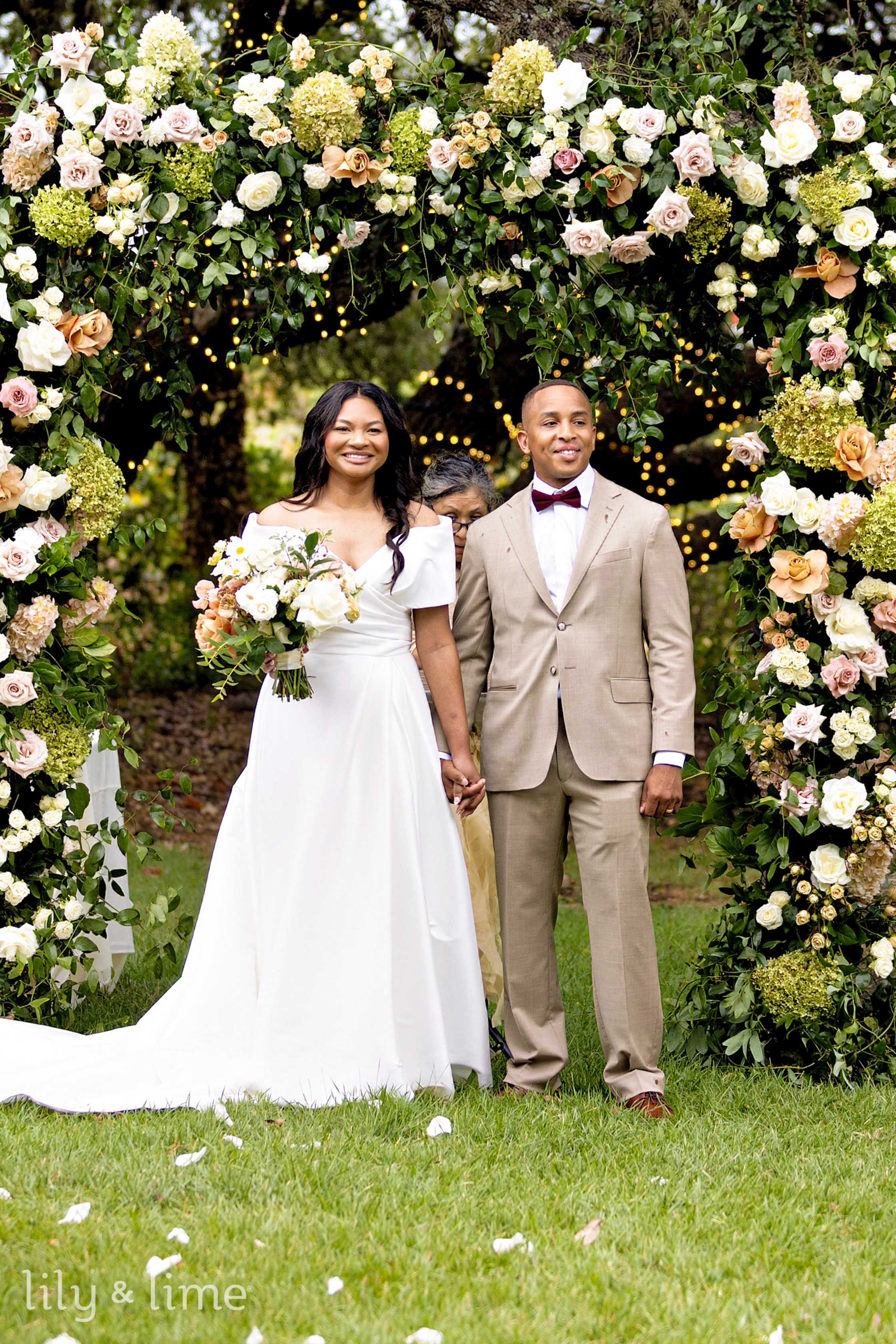 The outdoor garden ceremony was pure magic. As dusk settled, fairy lights twinkled above the guests. Cherie walked down an aisle decorated with delicate flowers toward a gorgeous floral arch of cream, peach, and brown blossoms. Against the backdrop of stunning vineyard views, we captured the emotional wedding ceremony photos of their heartfelt vows. Afterward, the couple posed for beautiful wedding group portraits and cherished family portraits.