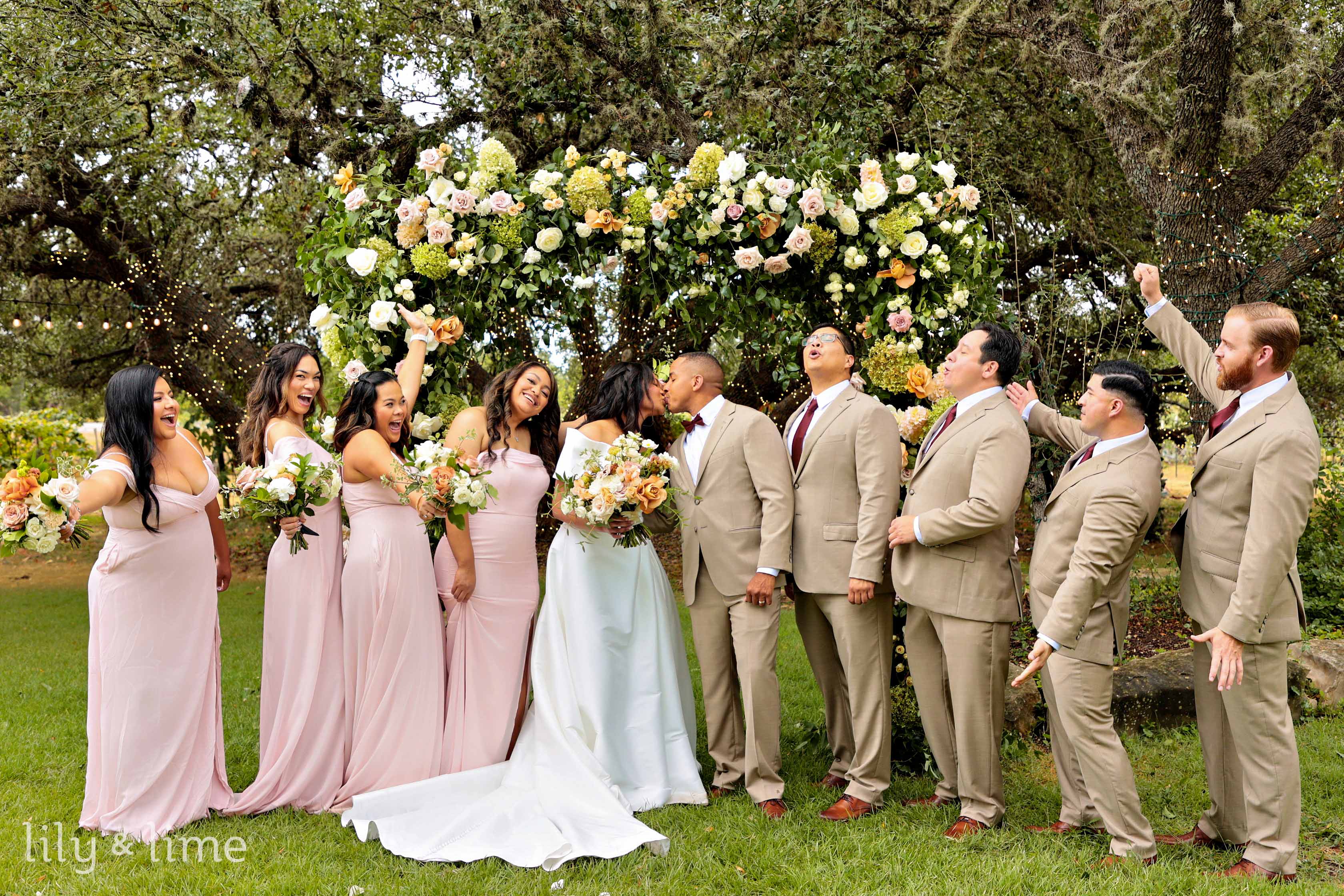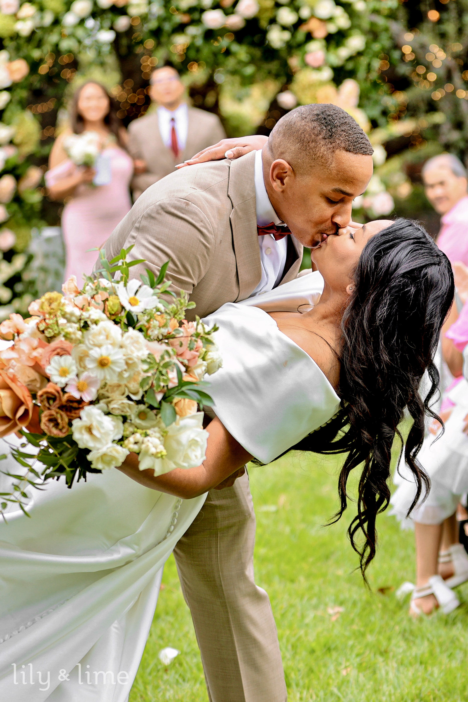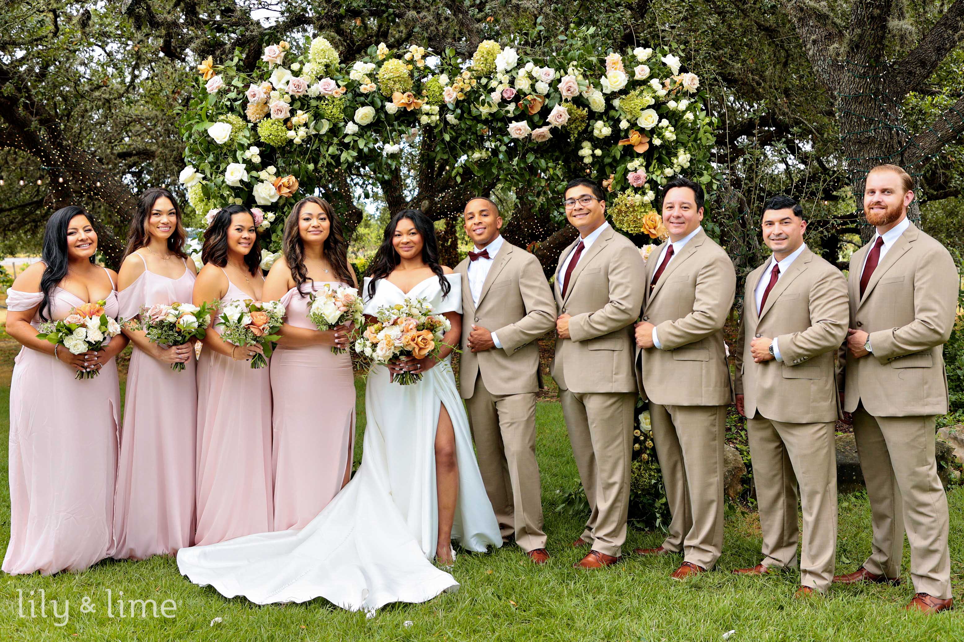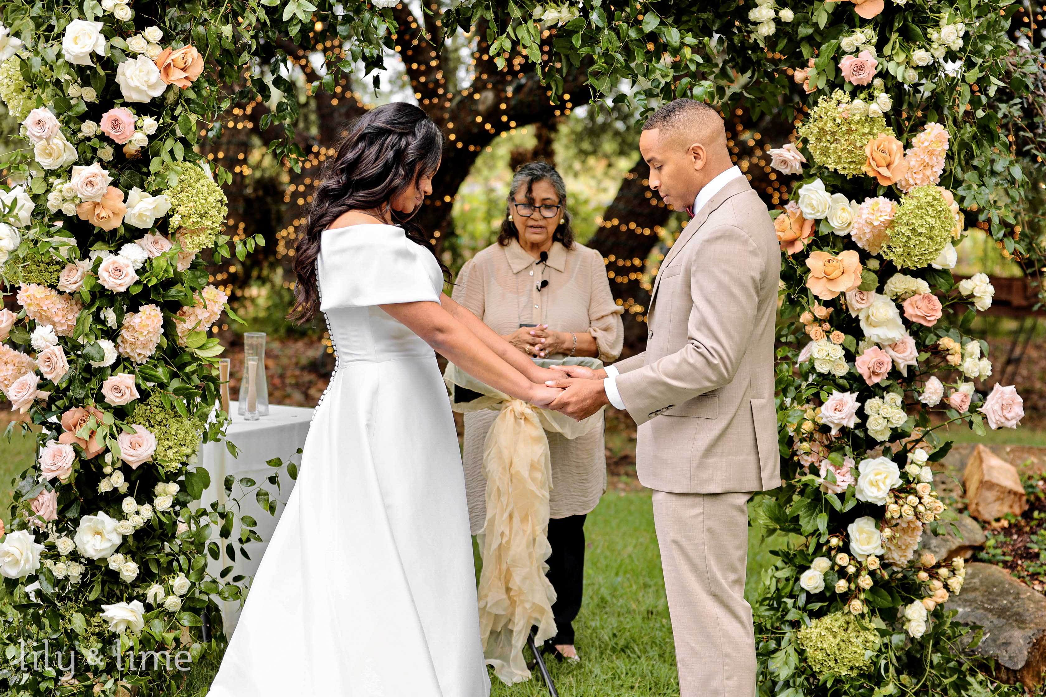 The outdoor garden ceremony was pure magic. As dusk settled, fairy lights twinkled above the guests. Cherie walked down an aisle decorated with delicate flowers toward a gorgeous floral arch of cream, peach, and brown blossoms. Against the backdrop of stunning vineyard views, we captured the emotional wedding ceremony photos of their heartfelt vows. Afterward, the couple posed for beautiful wedding group portraits and cherished family portraits.