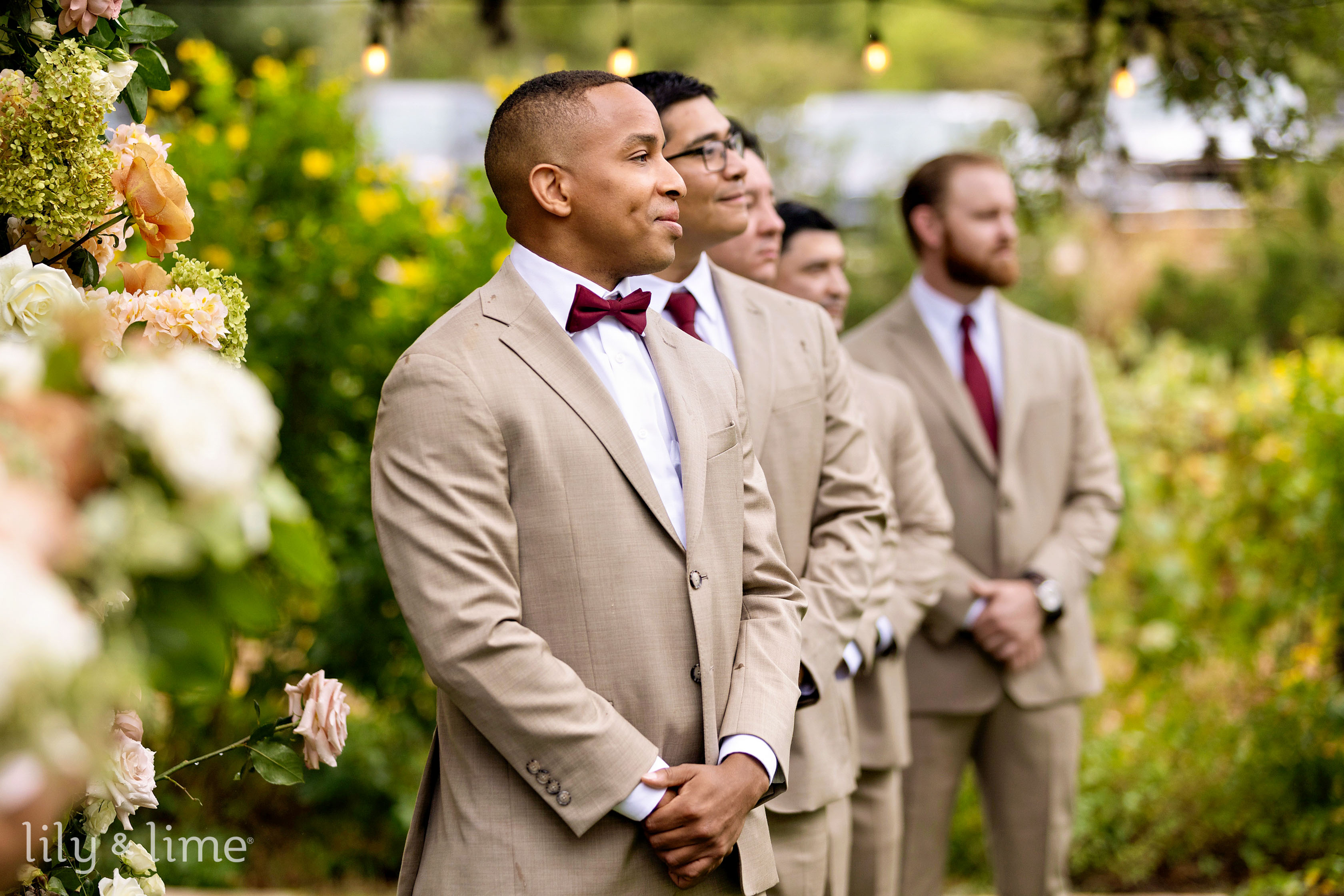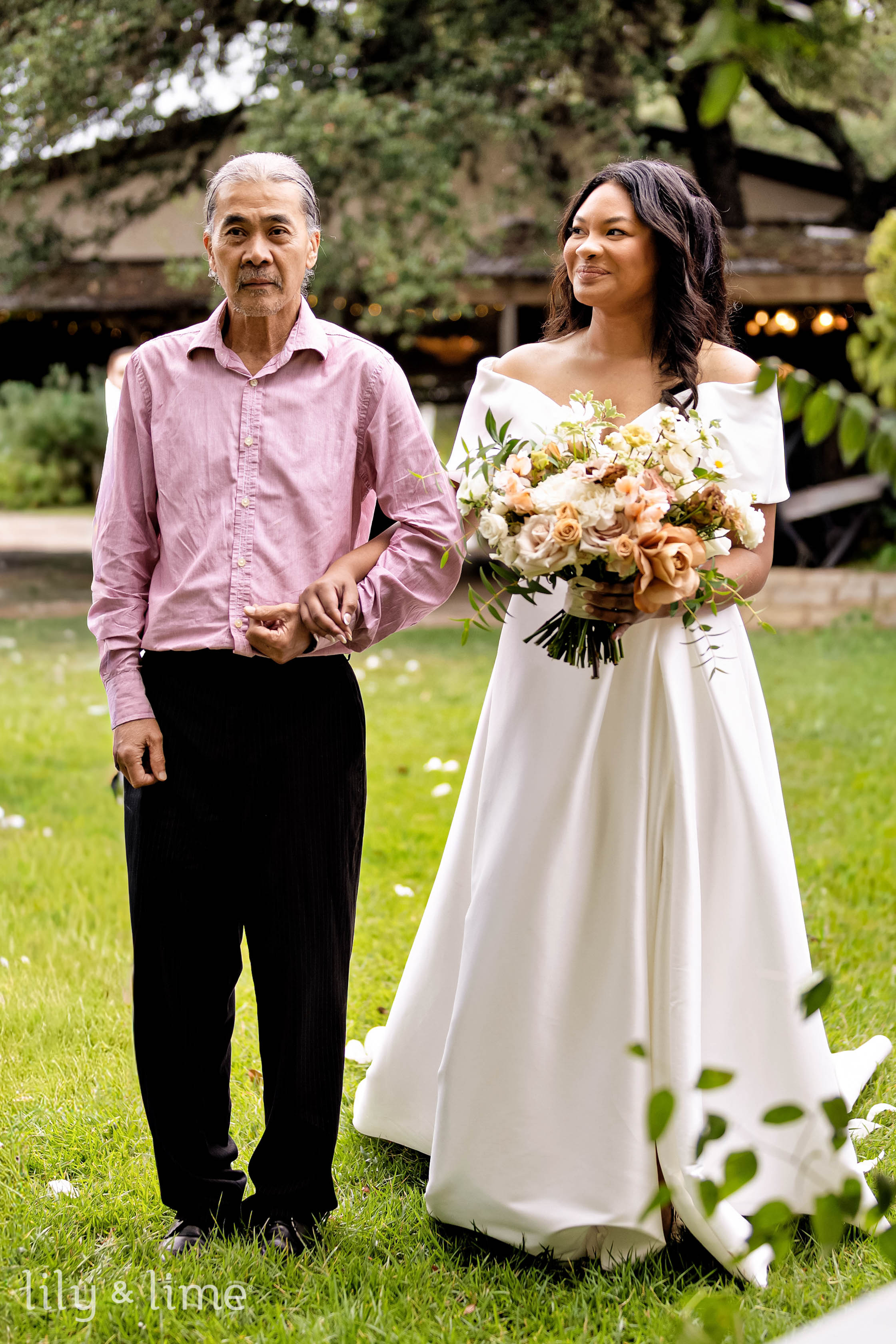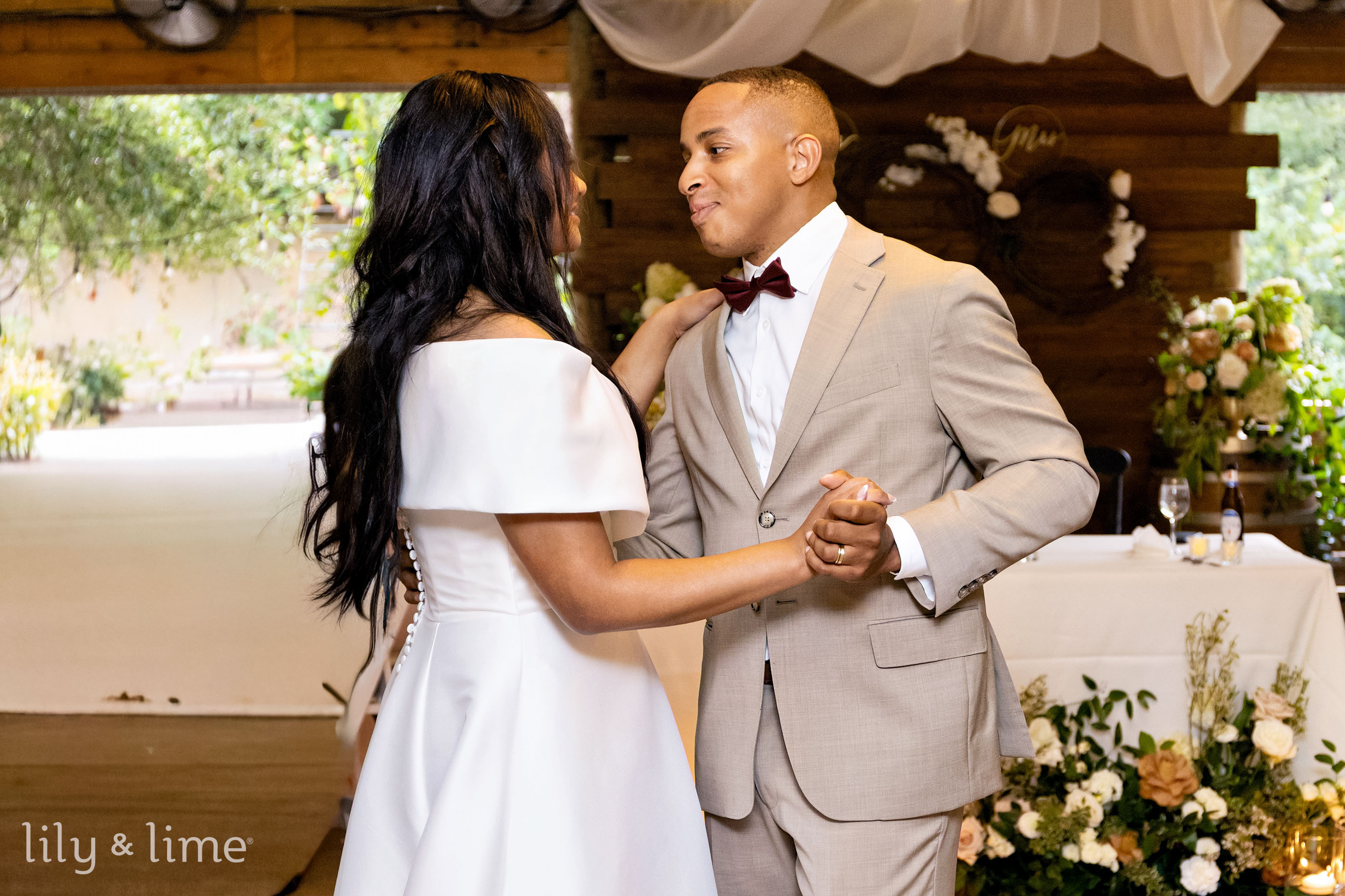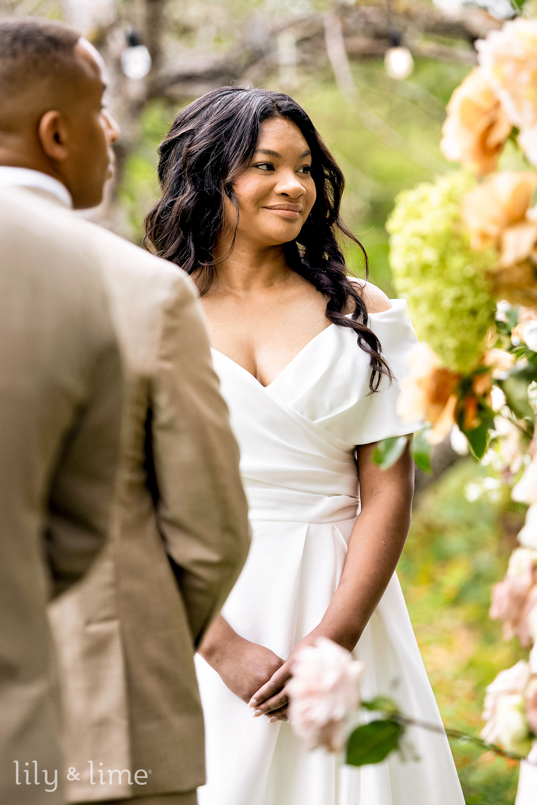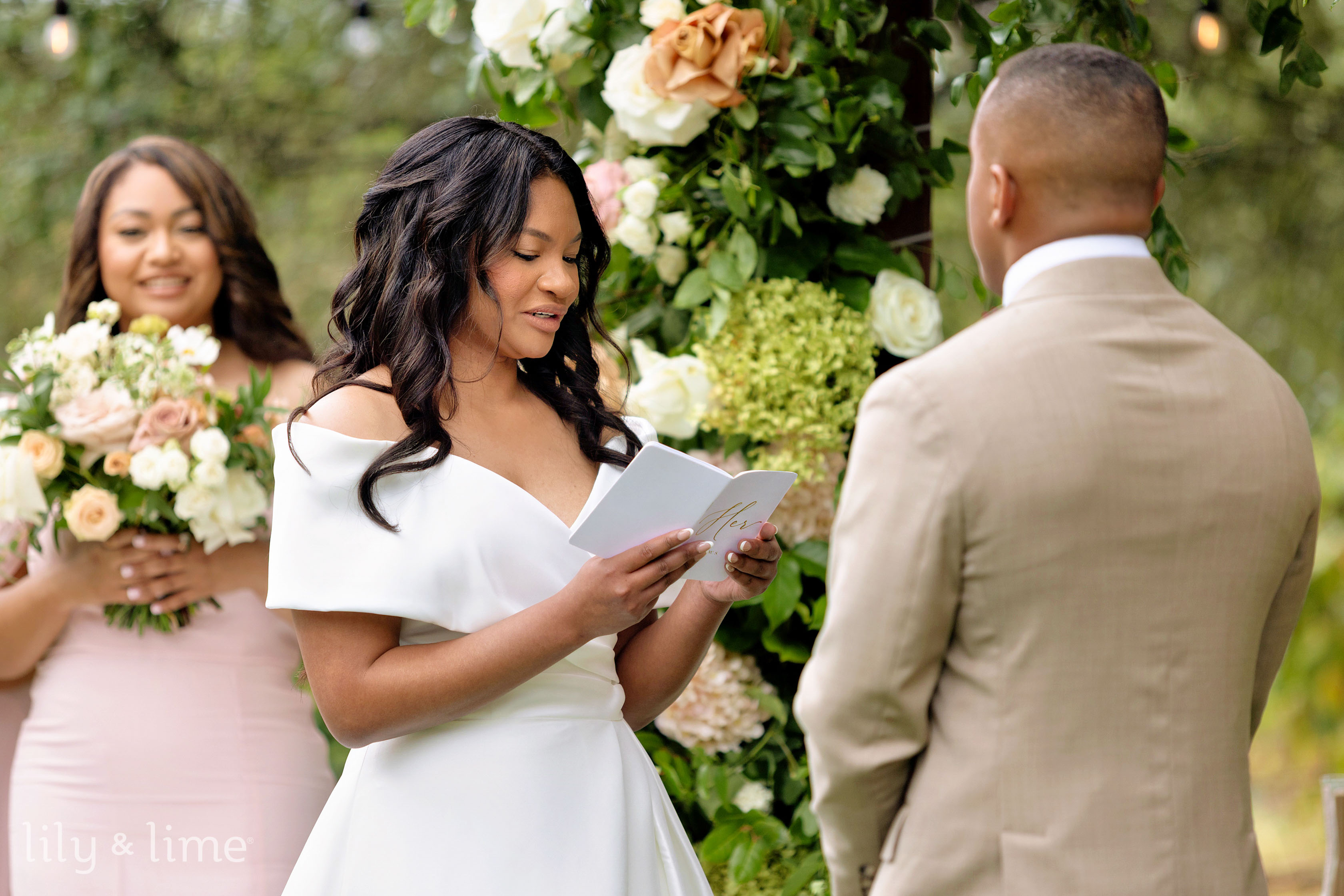 The outdoor garden ceremony was pure magic. As dusk settled, fairy lights twinkled above the guests. Cherie walked down an aisle decorated with delicate flowers toward a gorgeous floral arch of cream, peach, and brown blossoms. Against the backdrop of stunning vineyard views, we captured the emotional wedding ceremony photos of their heartfelt vows. Afterward, the couple posed for beautiful wedding group portraits and cherished family portraits.