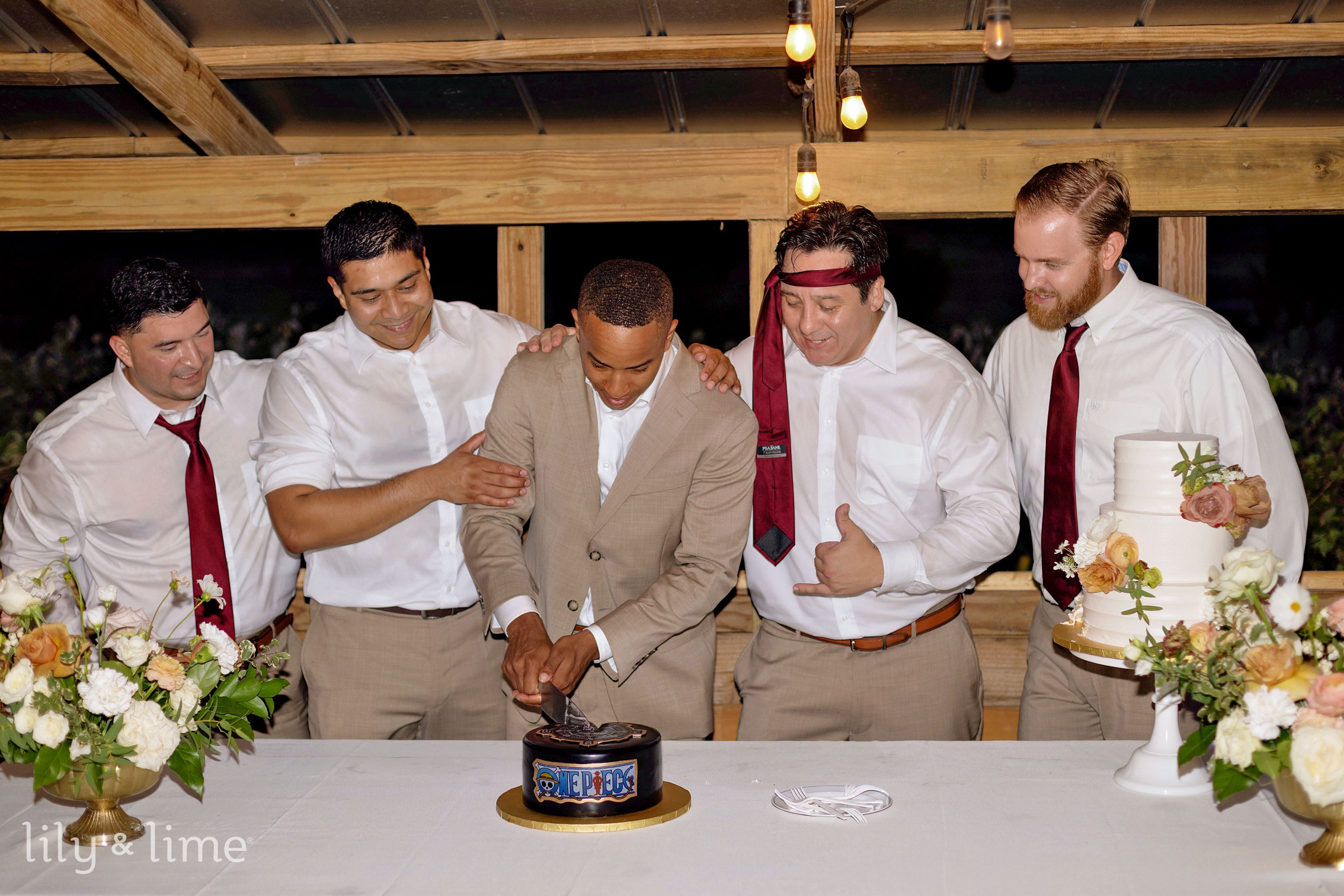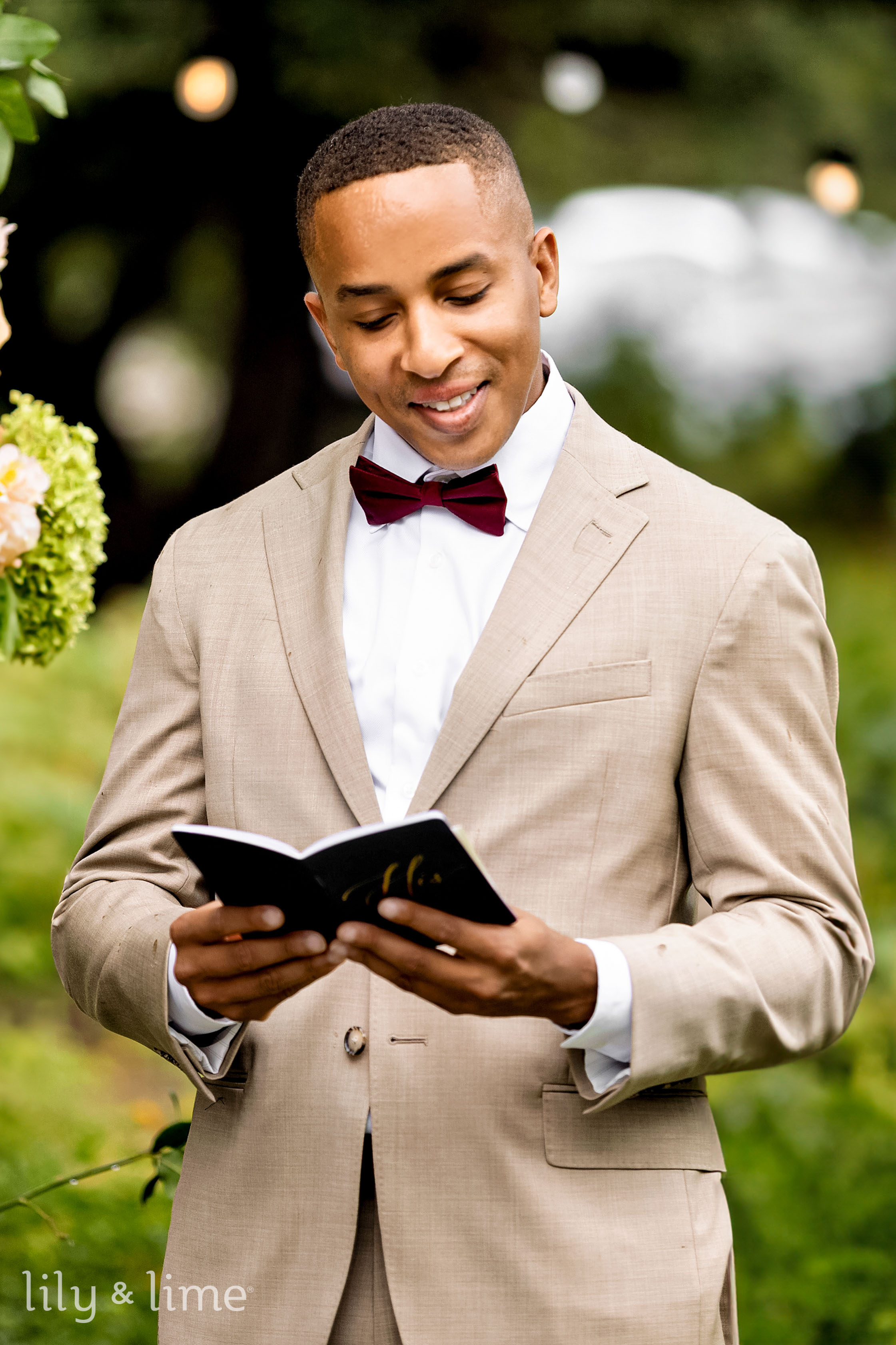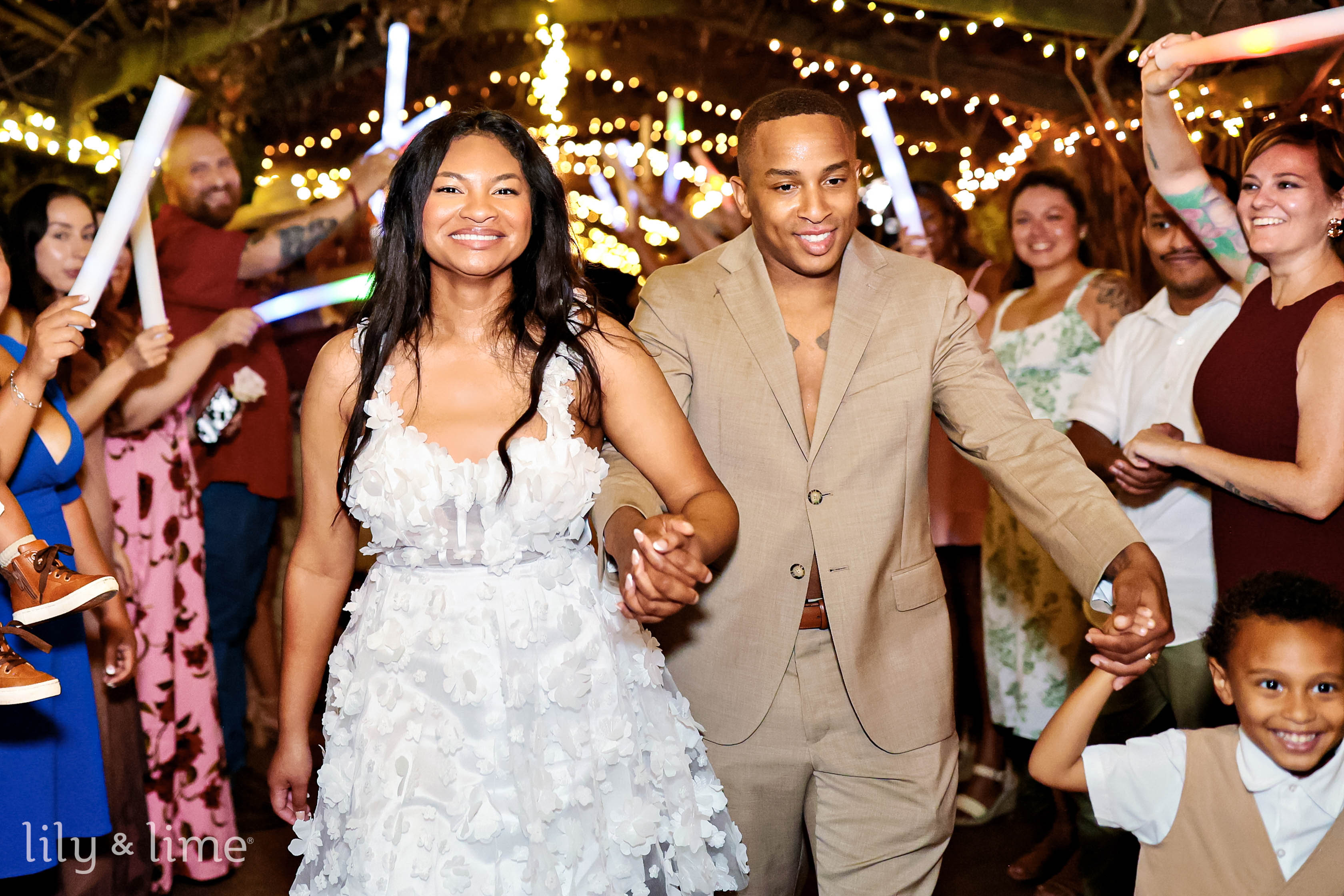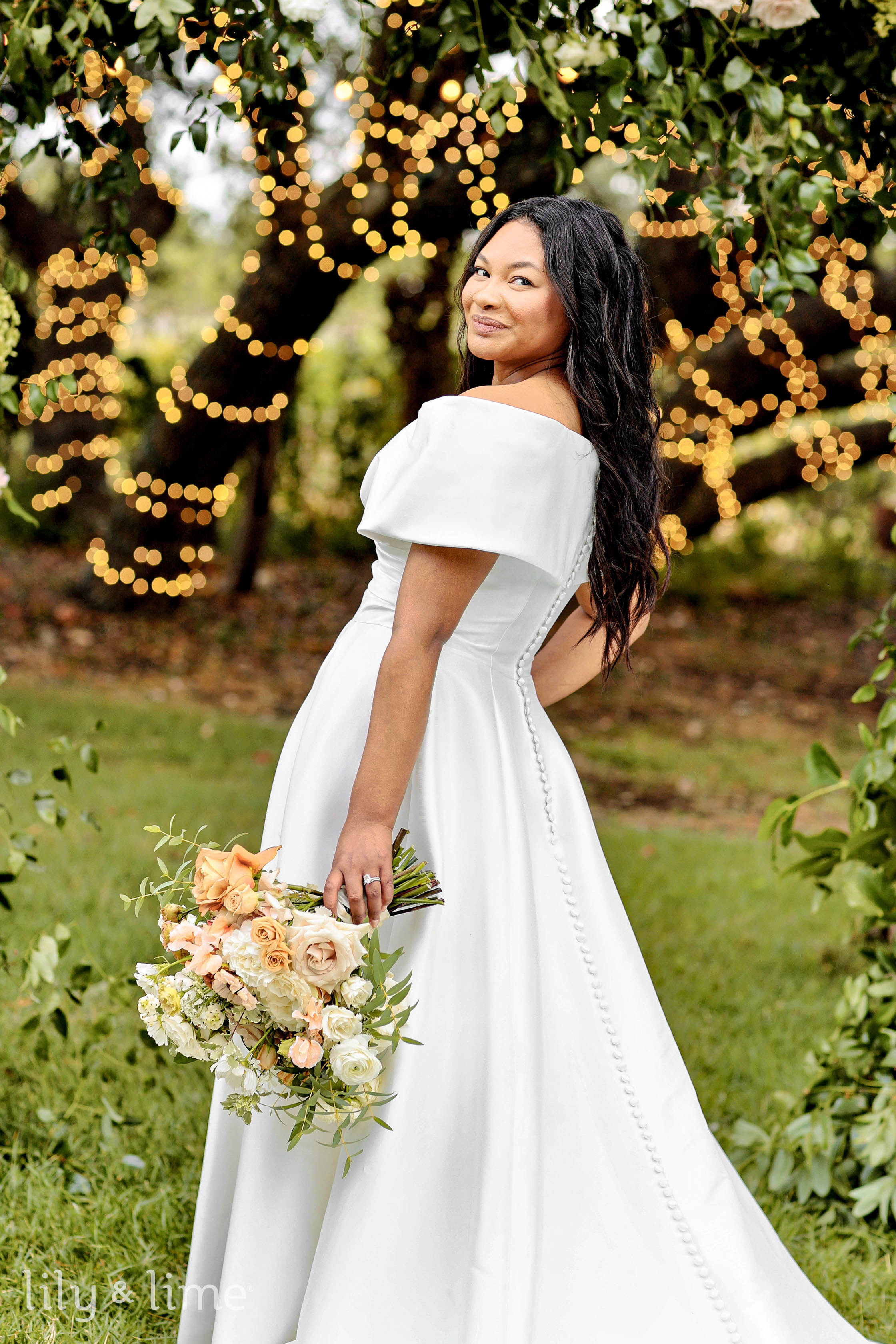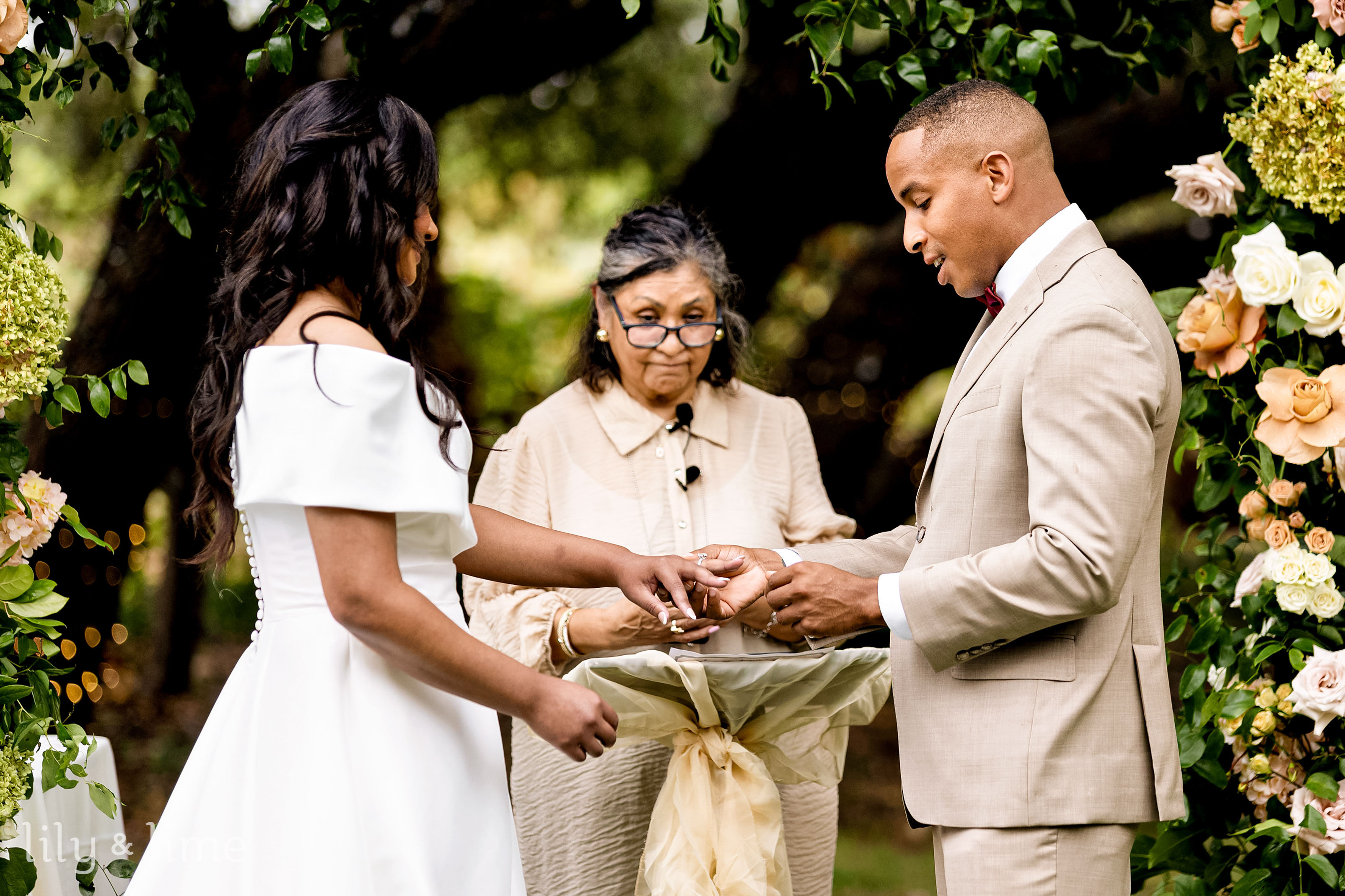 The outdoor garden ceremony was pure magic. As dusk settled, fairy lights twinkled above the guests. Cherie walked down an aisle decorated with delicate flowers toward a gorgeous floral arch of cream, peach, and brown blossoms. Against the backdrop of stunning vineyard views, we captured the emotional wedding ceremony photos of their heartfelt vows. Afterward, the couple posed for beautiful wedding group portraits and cherished family portraits.