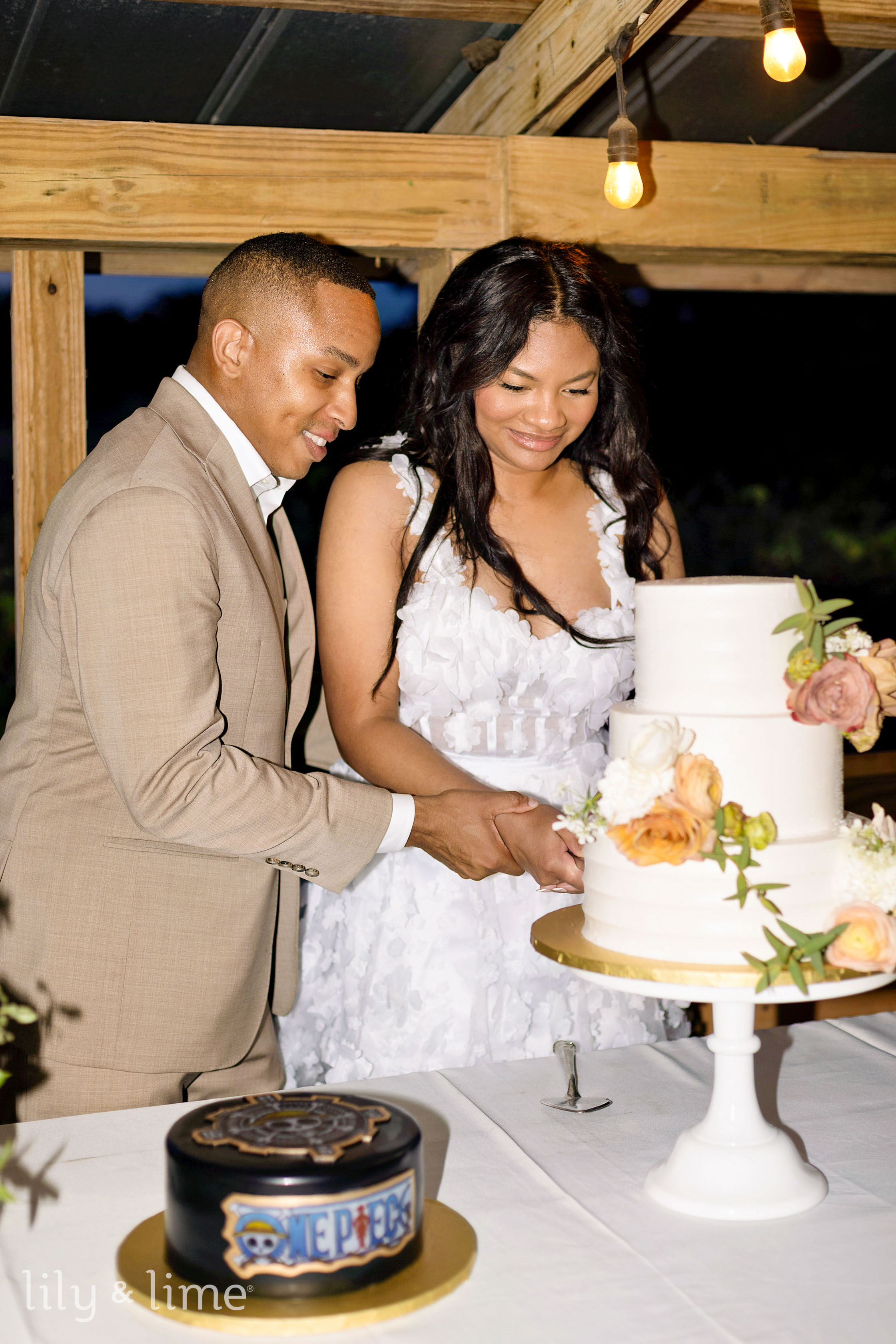 As the sun began to set, we stole Cherie and Jamir away for their couple portraits. The gorgeous natural landscape, punctuated by lush greenery, provided a romantic setting for intimate photos that truly captured their love. The celebration continued at the elegant barn reception, warmly lit by fairy lights. The rustic charm was enhanced by barrel details, beautiful peach, brown, and white floral arrangements, and simple, candlelit table settings. A highlight was the elegant, all-white three-tier wedding cake, adorned with delicate floral details. Our wedding reception photography focused on capturing the joy of the evening, from the couple's graceful first dance to the heartfelt toasts and the sweet moment of cake-cutting, preserving every key moment of their incredible day.