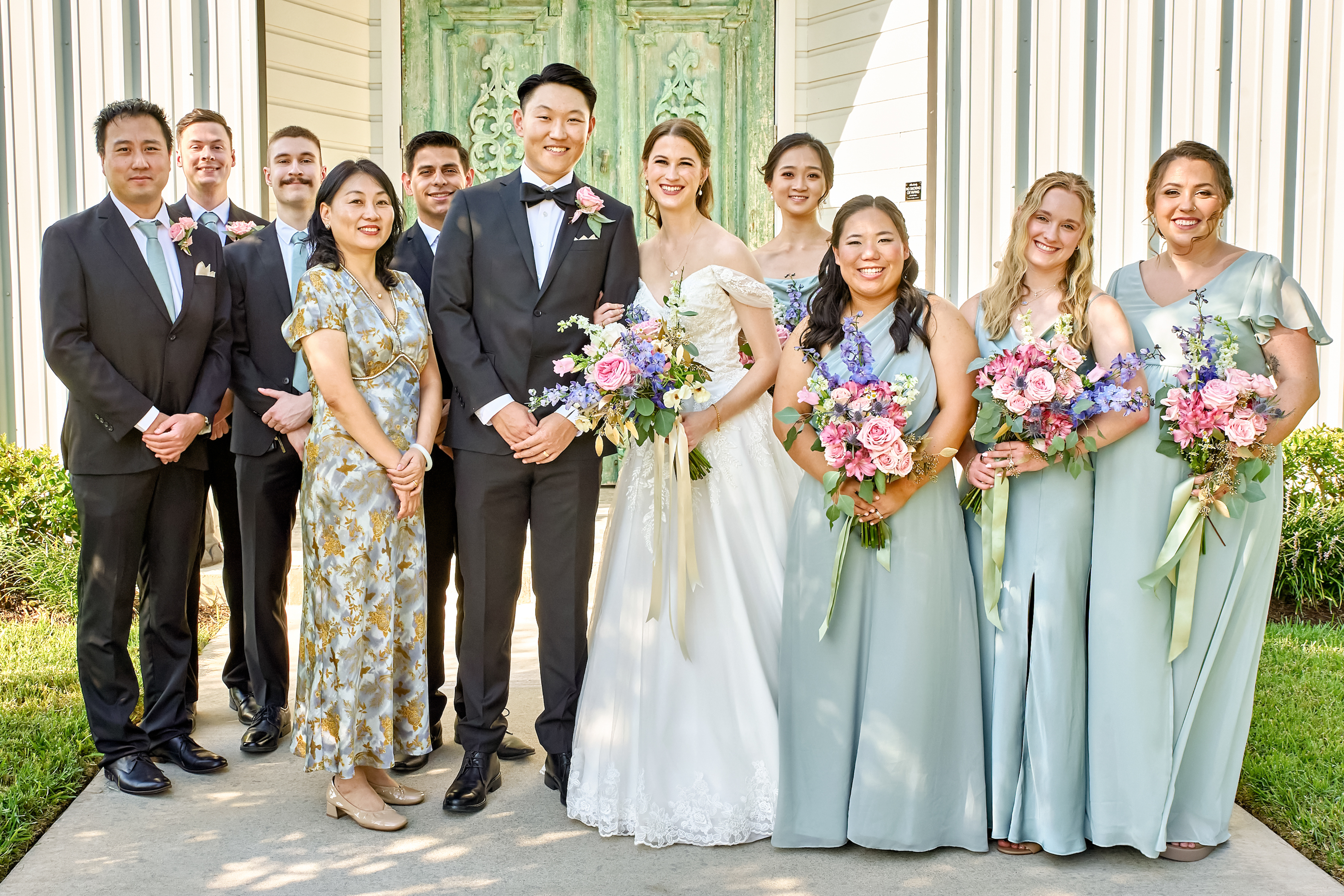 Afterward, Andrea and Drew took time for wedding group portraits and family photos. The bridesmaids and groomsmen posed for stunning portraits around the venue, their attire perfectly complementing the couple’s sophisticated style. The couple’s portraits were a highlight of the day, set against a gorgeous natural landscape and vintage architecture. The serene surroundings and soft light created a romantic and timeless backdrop, capturing the essence of their love story.