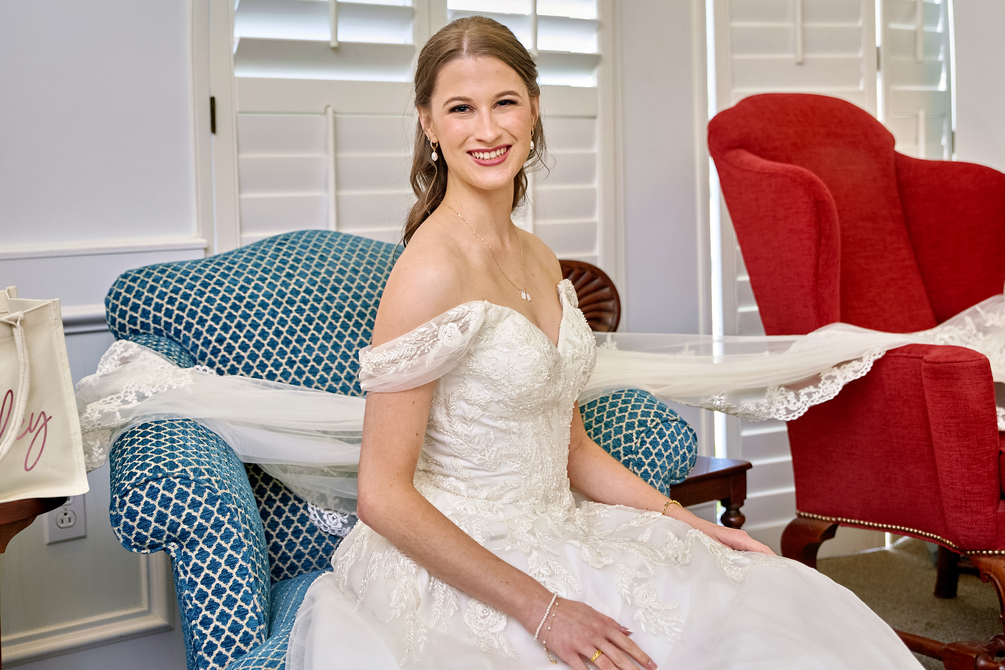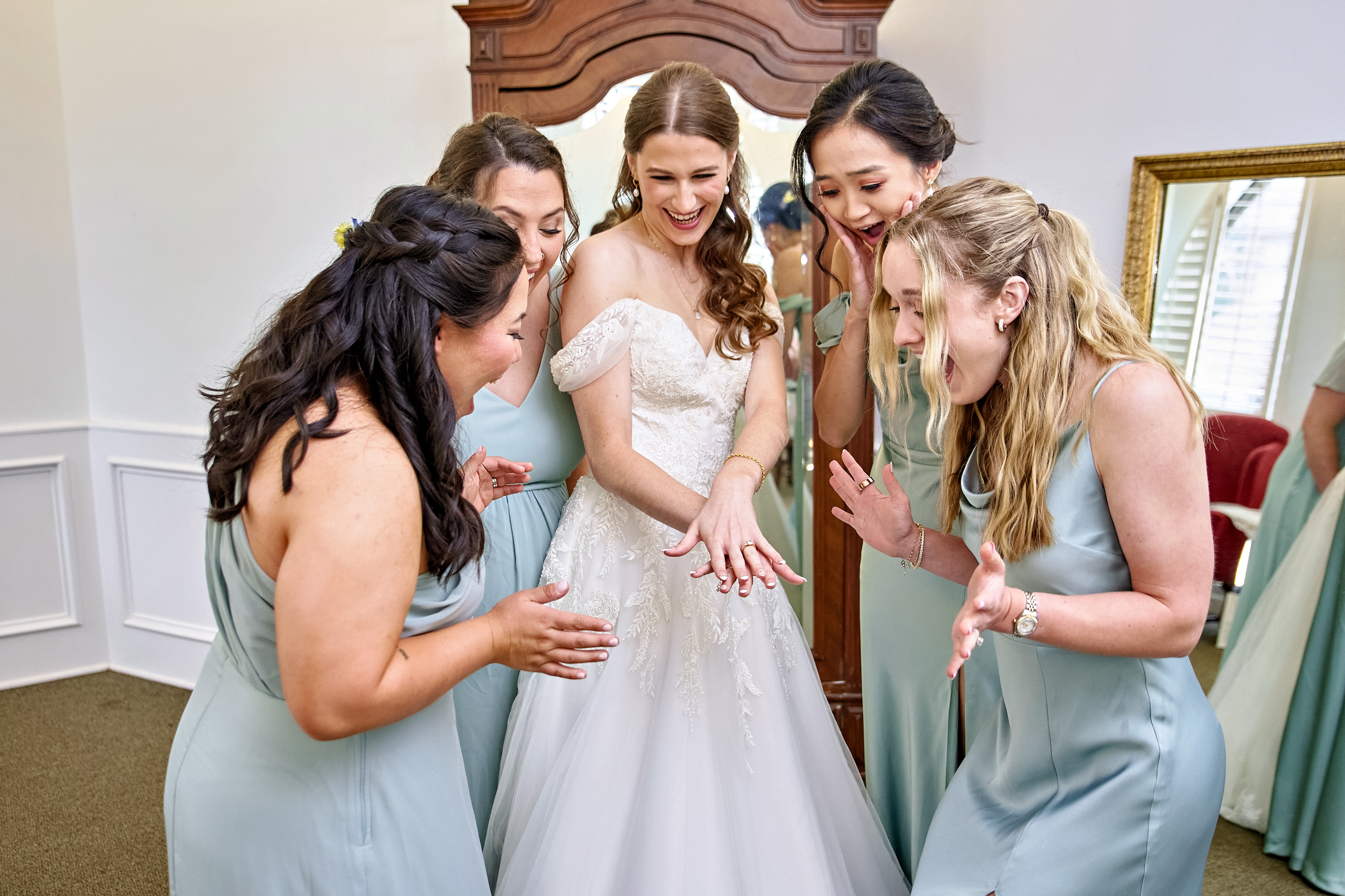 Andrea and Drew’s wedding day in Houston was a celebration of love, elegance, and unforgettable moments. The day began with the couple getting ready in their respective suites, surrounded by their closest friends and family. Andrea’s bridal suite was filled with excitement as she and her bridesmaids prepared for the big day. Our wedding photographers in Houston captured stunning detail shots of her pearl bridal earrings, chic wedding shoes, and the couple’s dazzling wedding rings. Andrea’s off-the-shoulder wedding dress, adorned with intricate embroidery, crystal appliques, and a buttoned-down back, was a vision of timeless beauty. Her neatly tied hairstyle, cathedral-length veil, pastel wedding bouquet, and French manicured hands completed her sophisticated bridal look. The bridesmaids, dressed in pastel blue gowns and carrying matching bridesmaid bouquets, shared heartfelt moments with Andrea, laughing, toasting, and posing for memorable portraits in their elegant getting-ready robes.