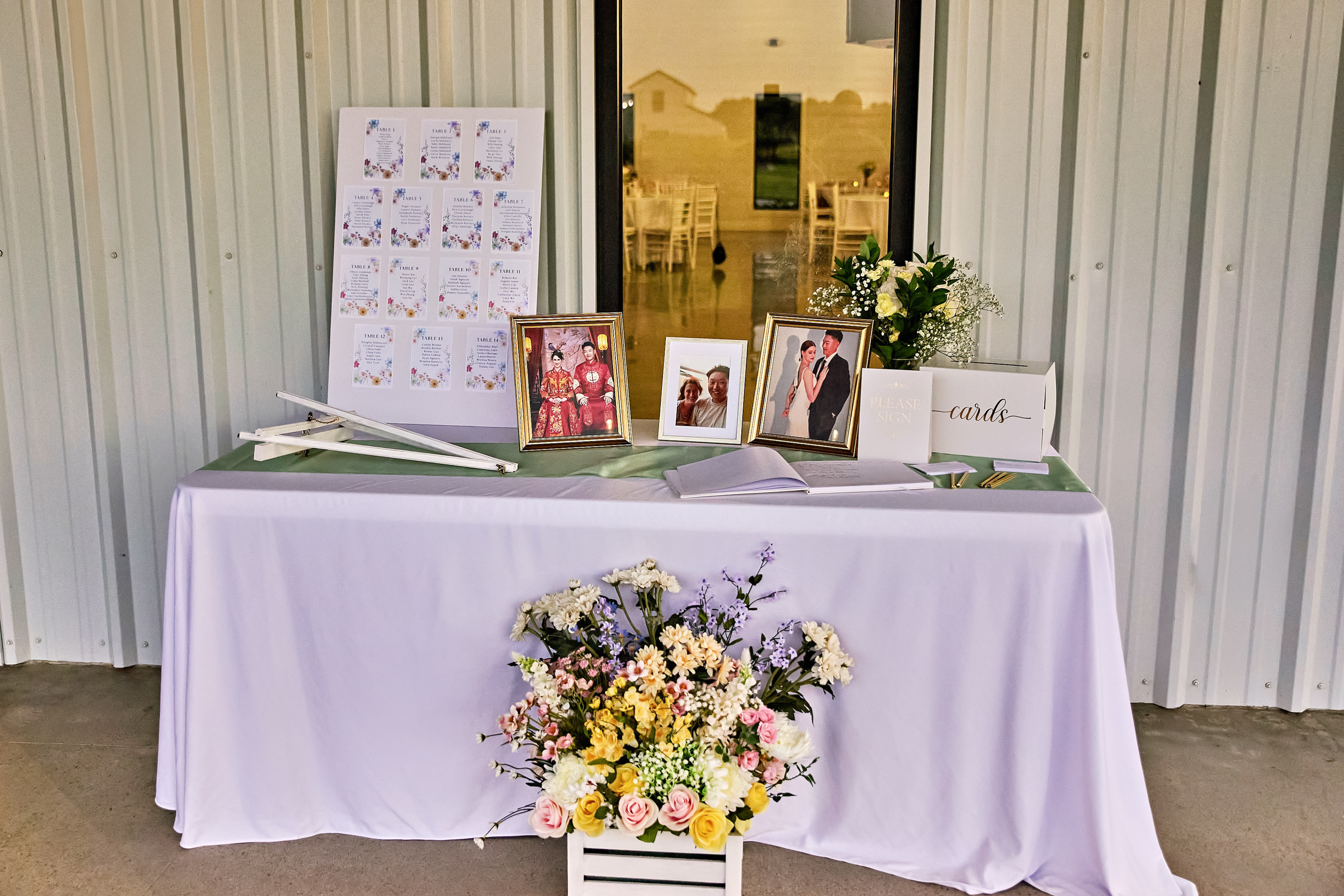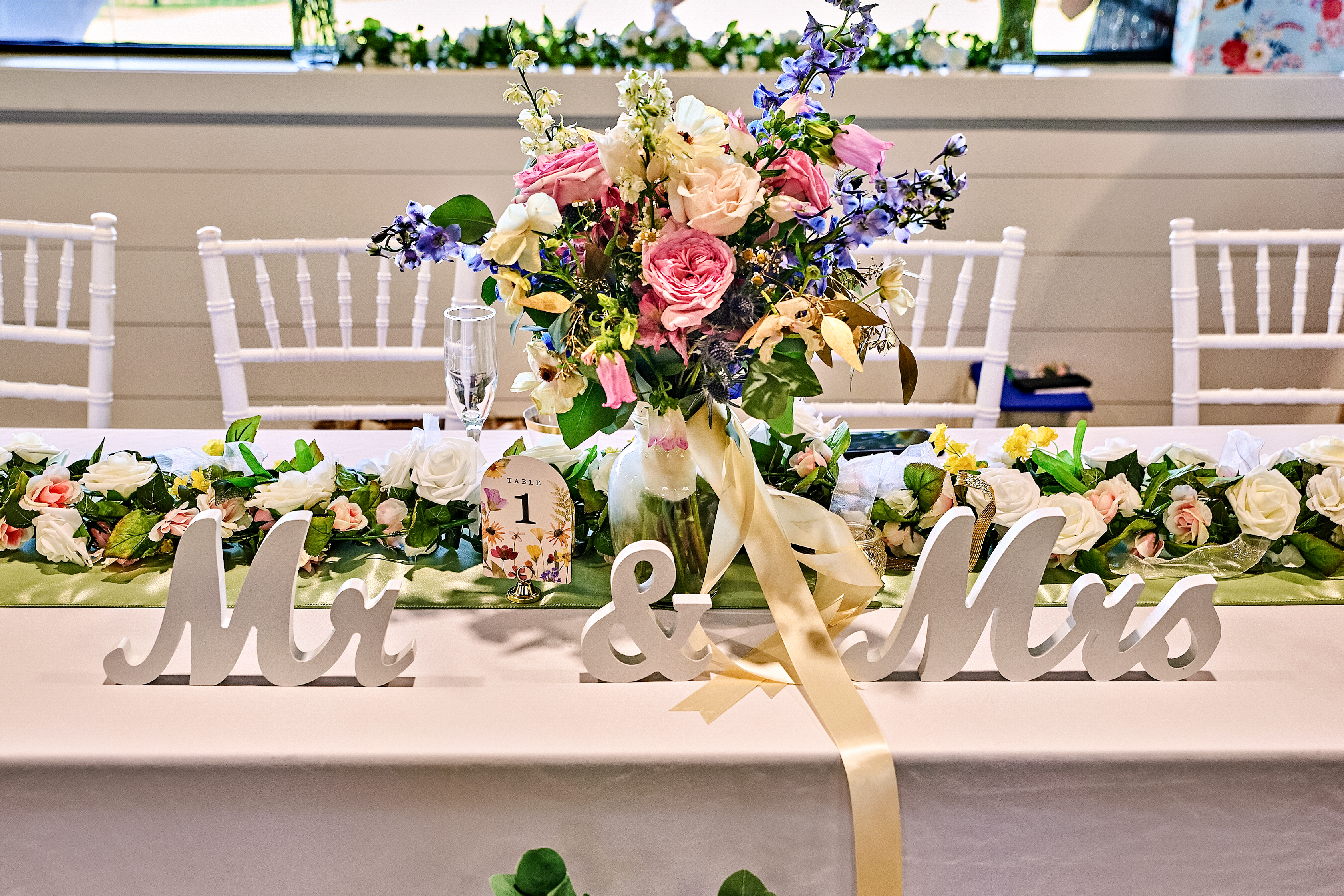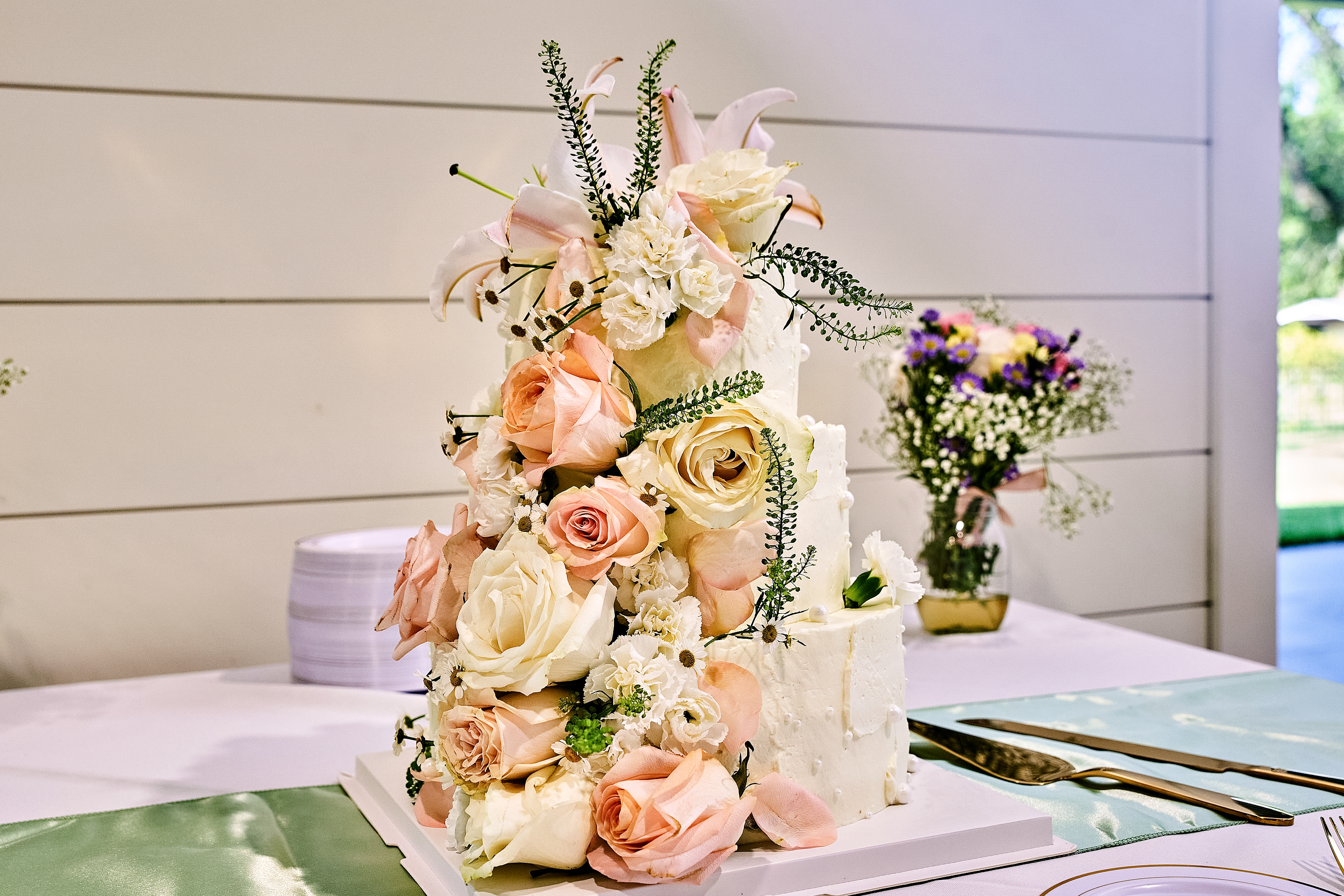 The celebration continued with an elegant afternoon reception in a vineyard-inspired setting. The space was adorned with pastel wedding flowers, delicate floral centerpieces, and greenery details that added a fresh and romantic touch. A gorgeous welcome table featured framed photos of the couple, while the sweetheart table, complete with a “Mr. and Mrs.” sign, greenery accents, and crystal chandeliers, became the focal point of the reception. Candles added a warm glow, creating an intimate and inviting atmosphere. The pastel wedding cake was a masterpiece, decorated with an abundance of flowers that made it look like a whimsical cake meadow.